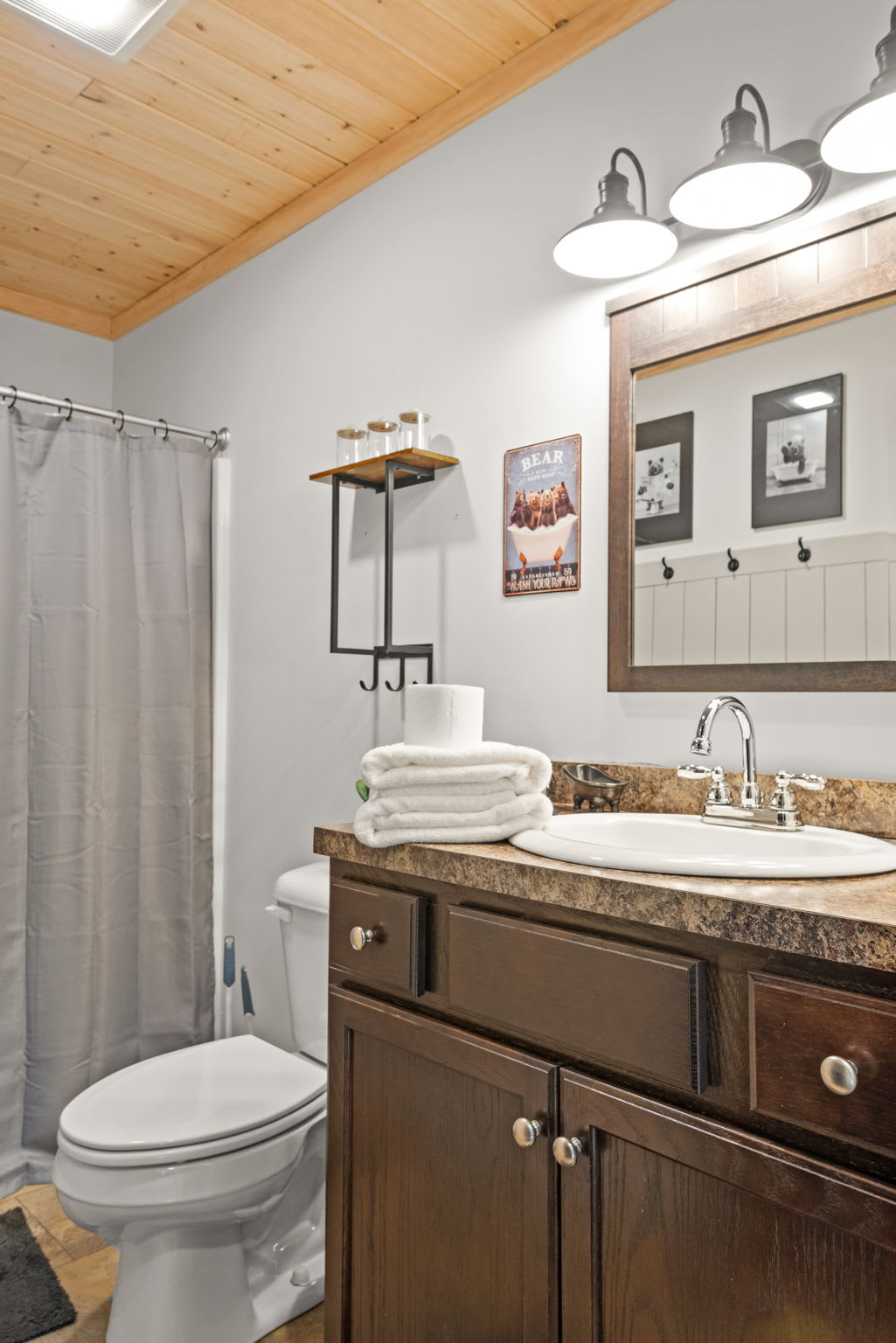 Accommodations: With 5 beautifully appointed bedrooms and 3 full bathrooms, this cabin comfortably hosts your group, ensuring privacy and comfort. Each bathroom is thoughtfully equipped with essential toiletries including body wash, shampoo, conditioner, and hand soaps, underscoring our commitment to your convenience.