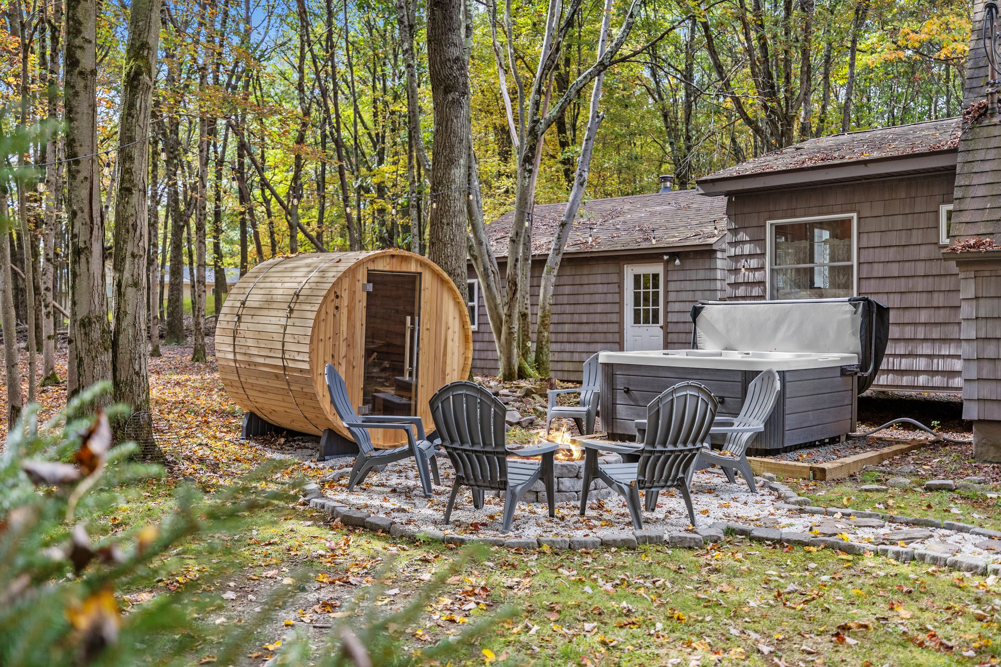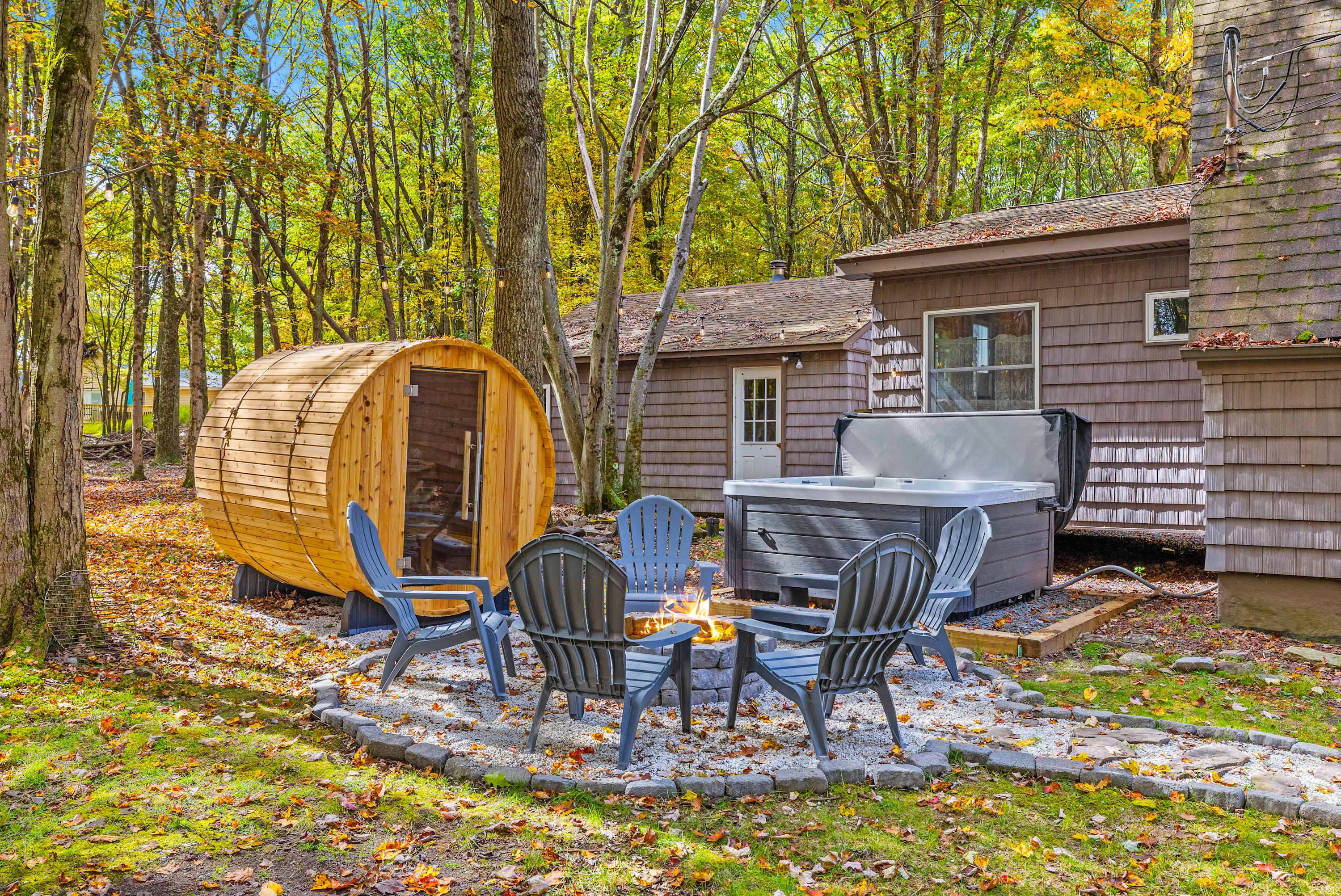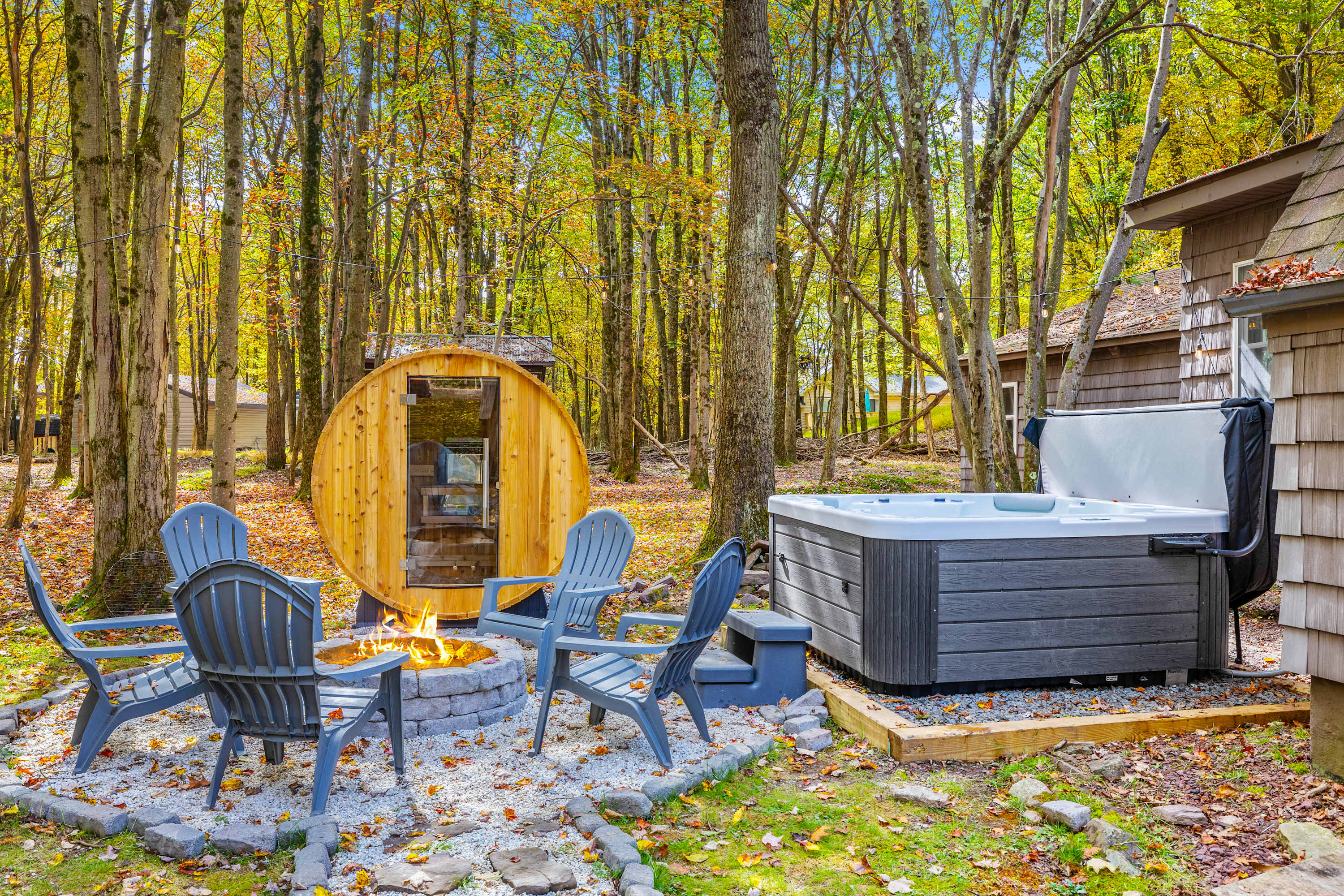 Escape to Whispering Pines Hideaway, nestled near Lake Harmony & Big Boulder. This charming 2BR home features a cozy fire-pit and private beach access. Ideal for couples, it offers modern comforts like three TVs and a vintage Pac-man arcade.