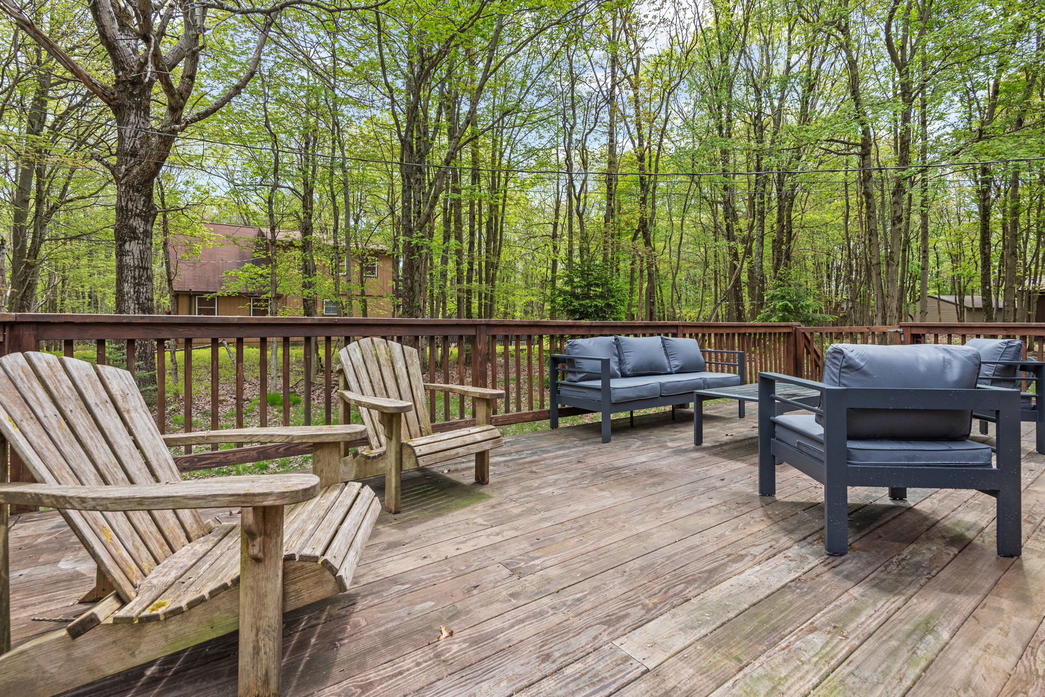 The home’s back deck is equipped with a modern grill and provides ample space for outdoor dining or lounging. This area is ideal for appreciating the natural surroundings, whether you’re hosting a barbecue or relaxing with a book.