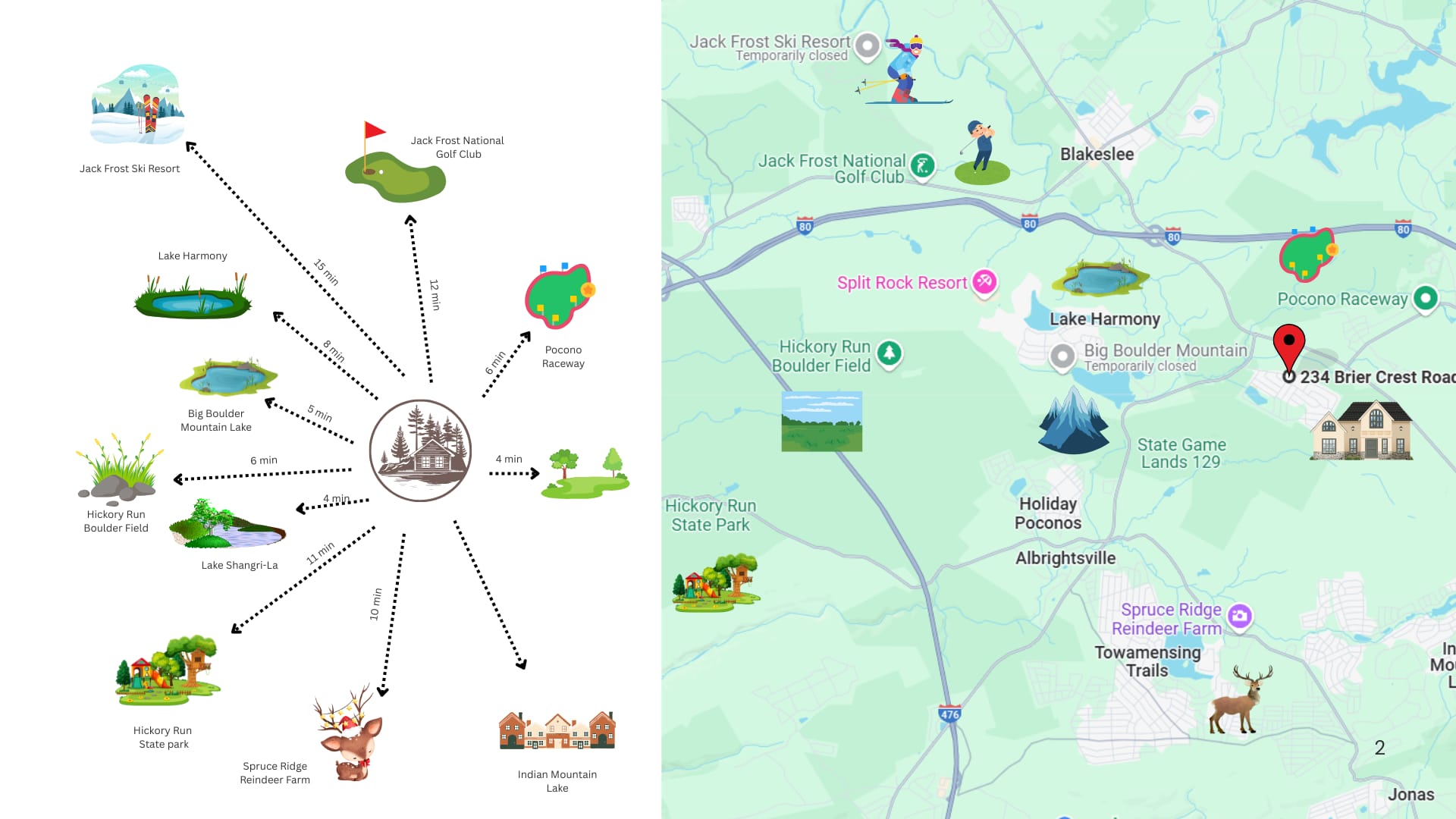 Nearby Lake Harmony and Big Boulder Lake offer fantastic opportunities for water activities during the warmer months. In winter, the nearby ski slopes are perfect for skiing and snowboarding enthusiasts. Additionally, guests have exclusive access to the private community beach at Lake Shangri-La, featuring a sandy beach and pristine waters for swimming and sunbathing.