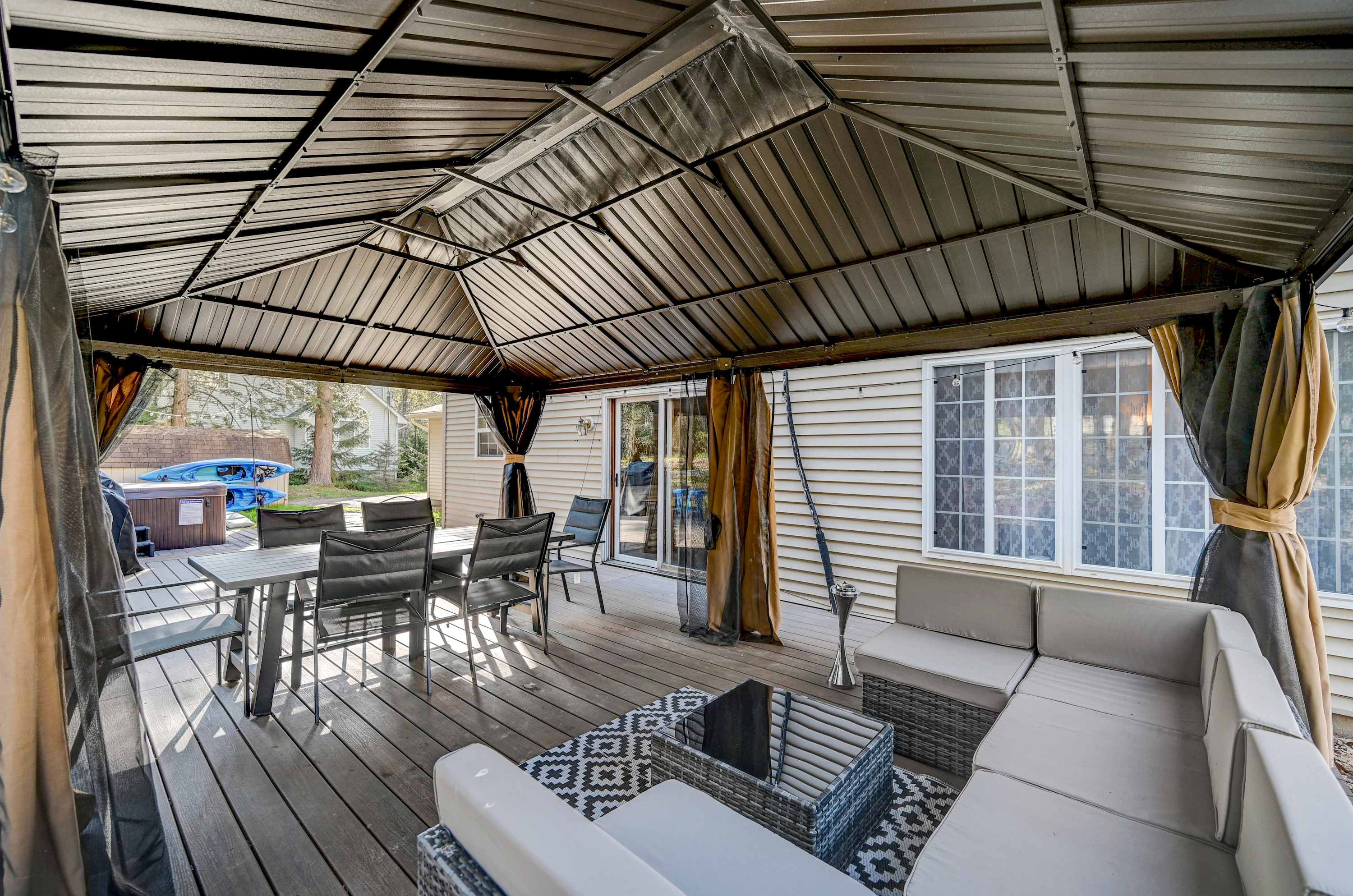 Step outside on the floating deck into the stunning extra large gazebo, where you can enjoy outdoor dining surrounded by nature views, featuring a built-in cooler to keep all your beverages ice cold. Get your game on, in our first of two game rooms to enjoy a game of ping pong, pool and PlayStation 4 alongside our unique, “chill vibes only” grass wall. In the second game room, you can unwind in the full-body massage chair that’s equipped with Bluetooth speakers to play your favorite tunes. While here, you can also play a round of air hockey, followed by friendly poker night with everyone up to the challenge. We are located just a few homes away from the Community Lake and Beach, just a 4 minute scenic walk, or 30 seconds by car. Take the two kayaks provided, equipped with wheel trolleys to make walking with them a piece of cake down to the water. Relax around the fire pit under the stars while two can unwind on the hammock. Get cozy in the modern living room with our ultra high def 65 inch tv, equipped with Netflix and Amazon Prime for movie night. The community lake is properly maintained for people to swim in the beach area. There are tables and grills for BBQ's with a fishing pier with plenty of space for any outdoor activities, the sunset on the lake is a MUST SEE! Sizzle it up with our complimentary 5-burner grill for a BBQ day. Switch on the outdoor patio string lights to cozy up the entire gazebo and deck beautifully in the evening, for a level of relaxation you won't forget.