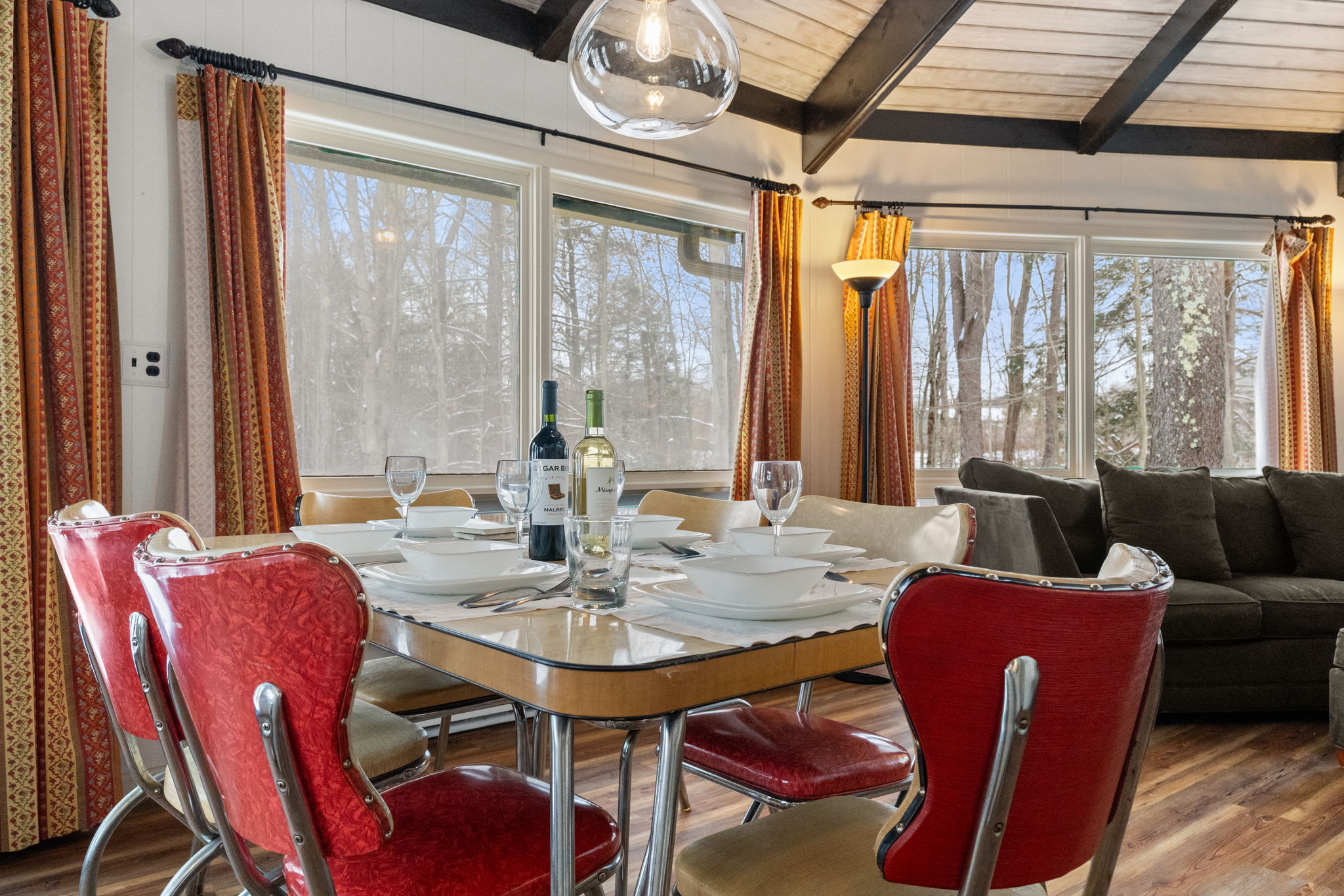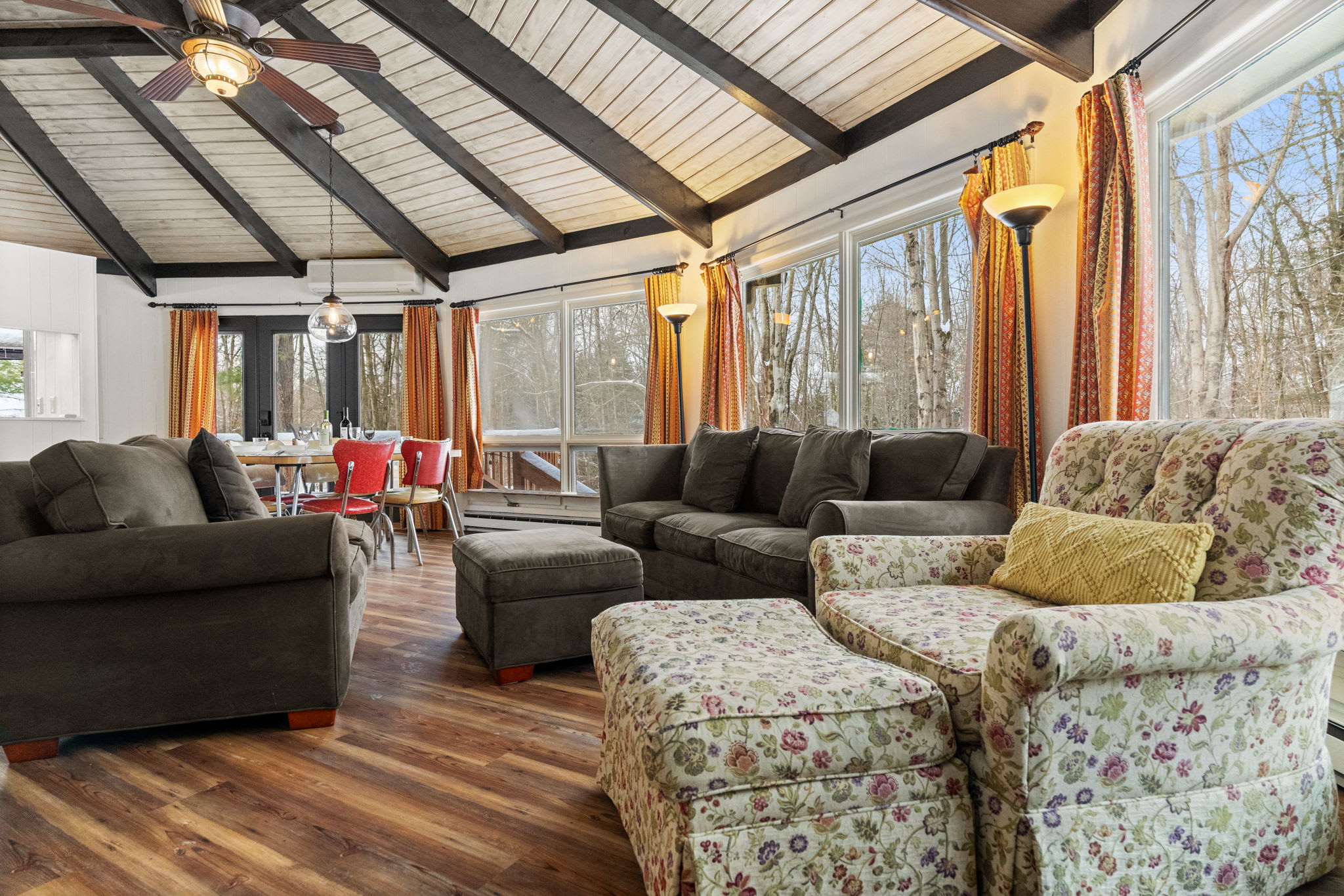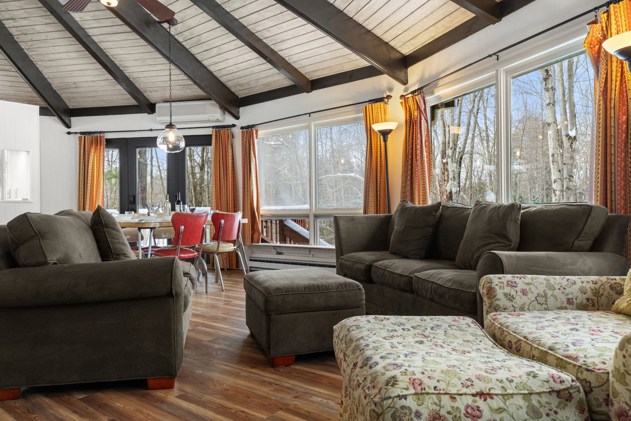 The living room features warm wood ceilings and durable luxury vinyl flooring, creating an updated cabin feel without sacrificing comfort. A cozy heat source and ceiling fans help keep the space comfortable across the seasons, whether you are curled up with a movie after skiing or cooling down after a summer hike.