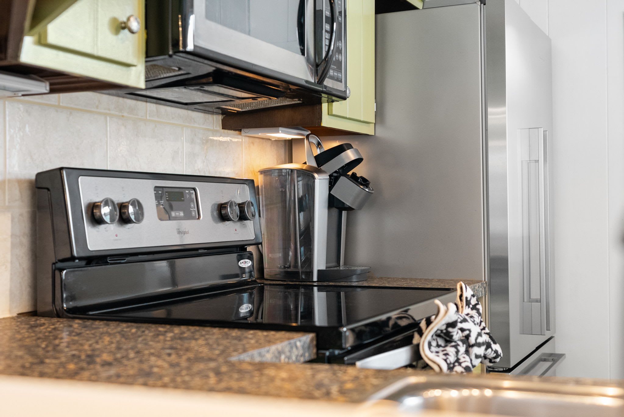The kitchen is compact but efficient, with stainless appliances and a dual serving counter that works well for simple family meals, snacks for the kids, or a charcuterie board for two. Just off the main living area, two comfortable bedrooms with ceiling fans and two full bathrooms give couples or parents with little ones enough privacy without feeling spread out.