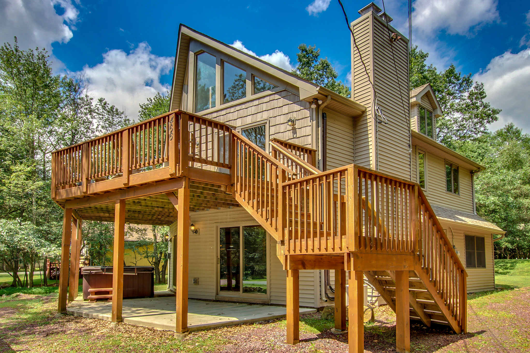 Retreat to this five bedroom Poconos getaway in the heart of Towamensing Trails 5 minute walk from the community lake house. Surrounded by trees and built for families, this home features a private hot tub, a large wraparound deck, a stone-fireplace great room, a game room with pool table, and a fully stocked kitchen for real meals and real memories.