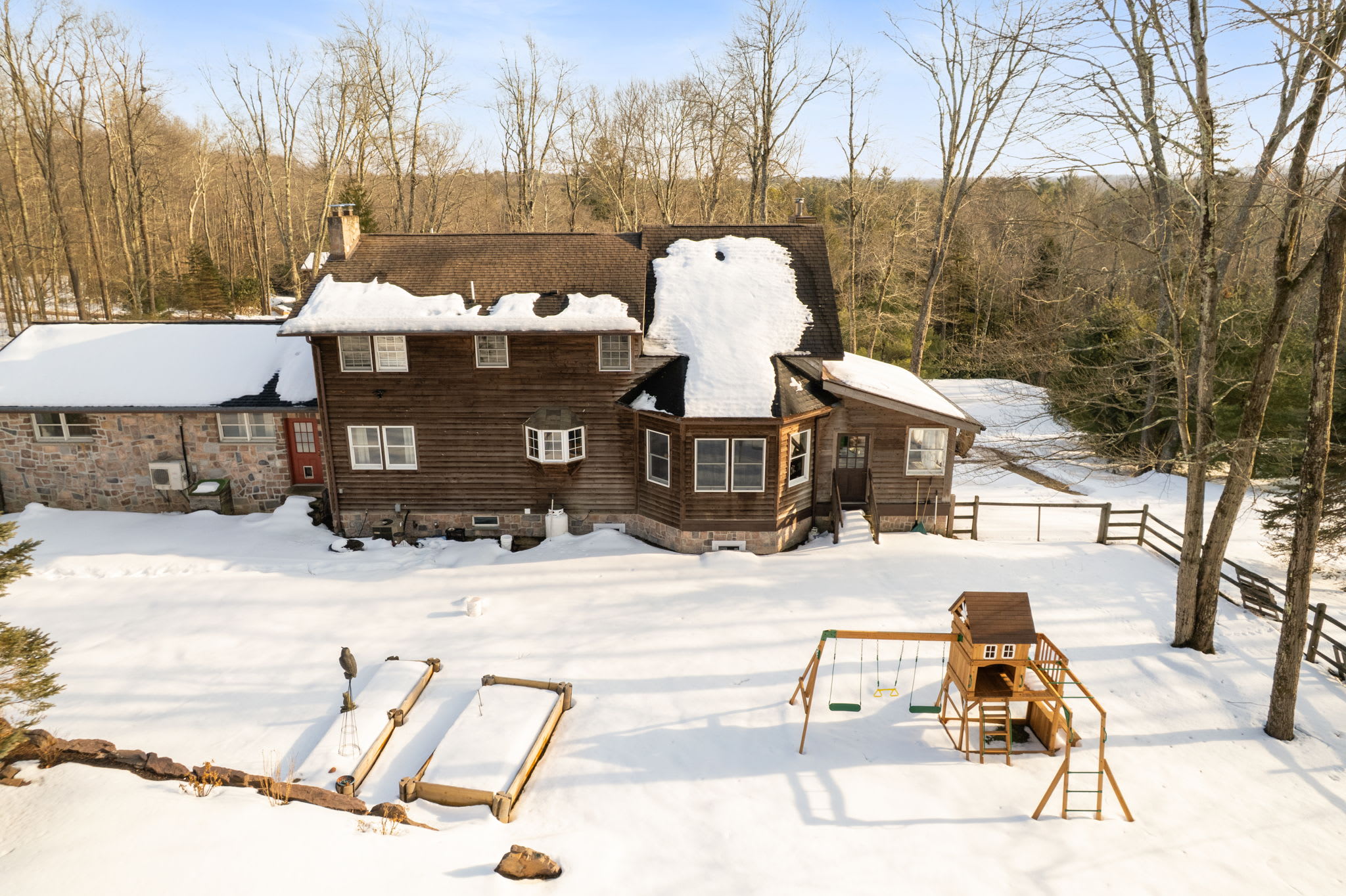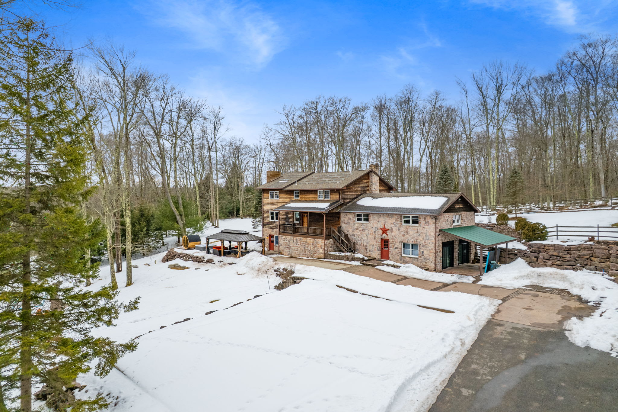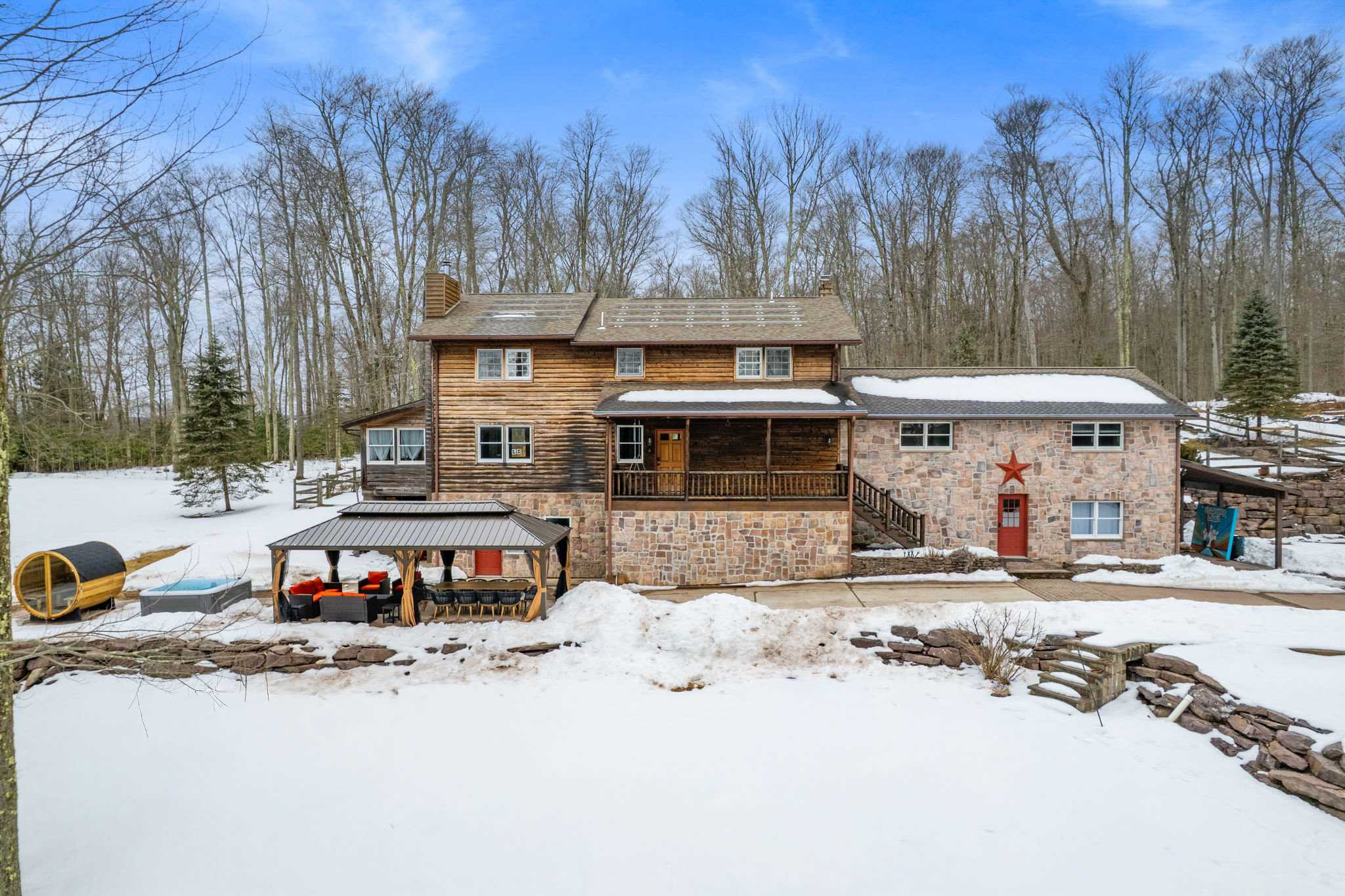 Private Pocono retreat on 5+ acres in Albrightsville offering rare space and seclusion. This 5,000+ sq ft home features 7 bedrooms, 4 full baths, bonus office spaces, rustic wood and stone details, hardwood floors, and year-round comfort. Enjoy a hot tub, three-season room, fenced yard, and oversized garage. Minutes to Big Boulder, Jack Frost, Hickory Run, and major highways. Perfect for groups seeking privacy without sacrificing access.