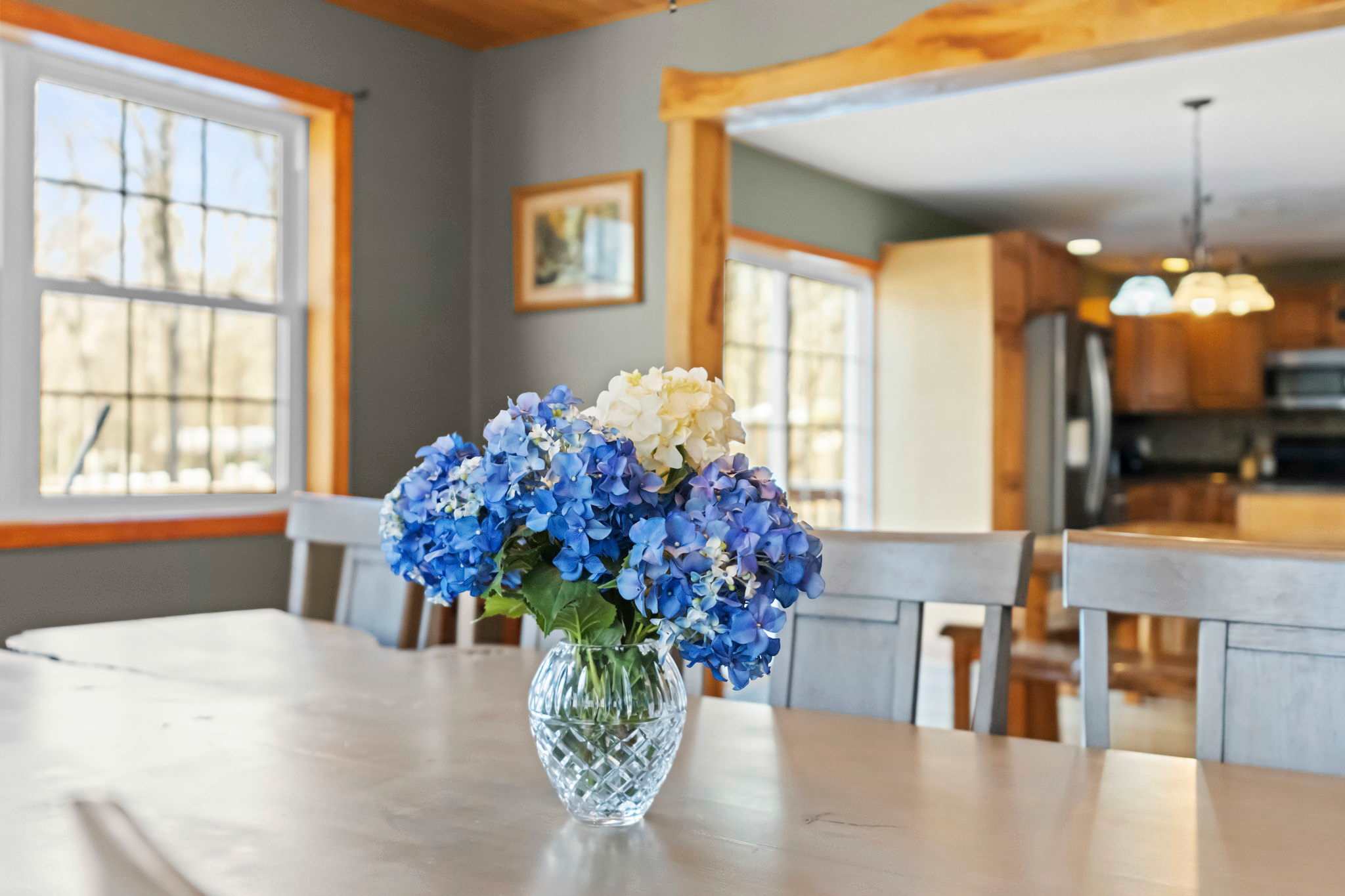 ● Soaring vaulted pine ceilings with exposed beams