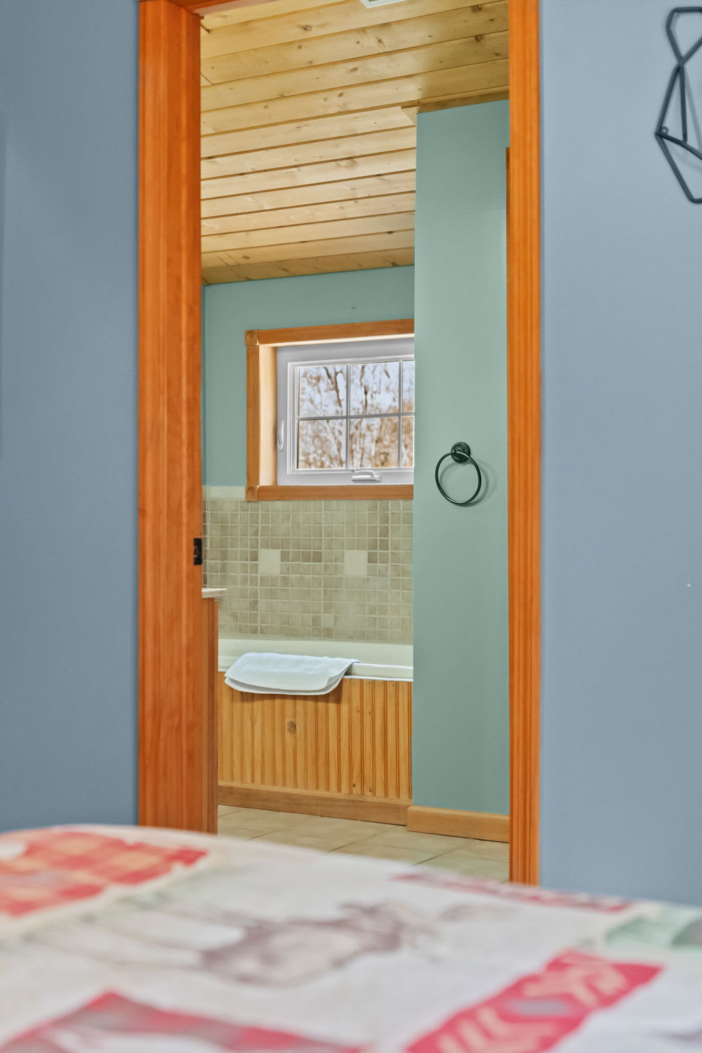 ● 2nd Floor Bathroom (En-Suite): Tub/shower combo with tile surround and pine ceiling