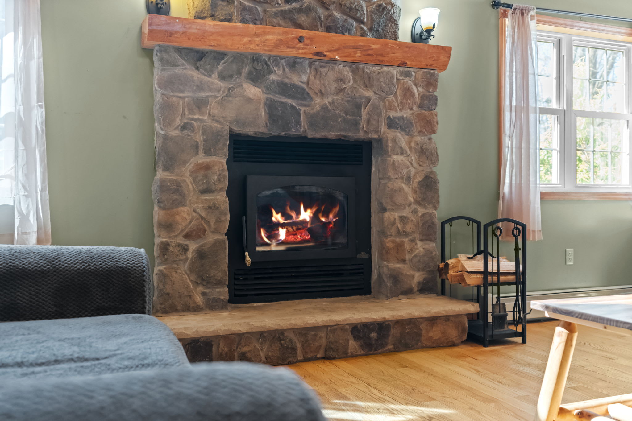 ● Stunning floor-to-ceiling stone wood-burning fireplace with a live-edge mantel
