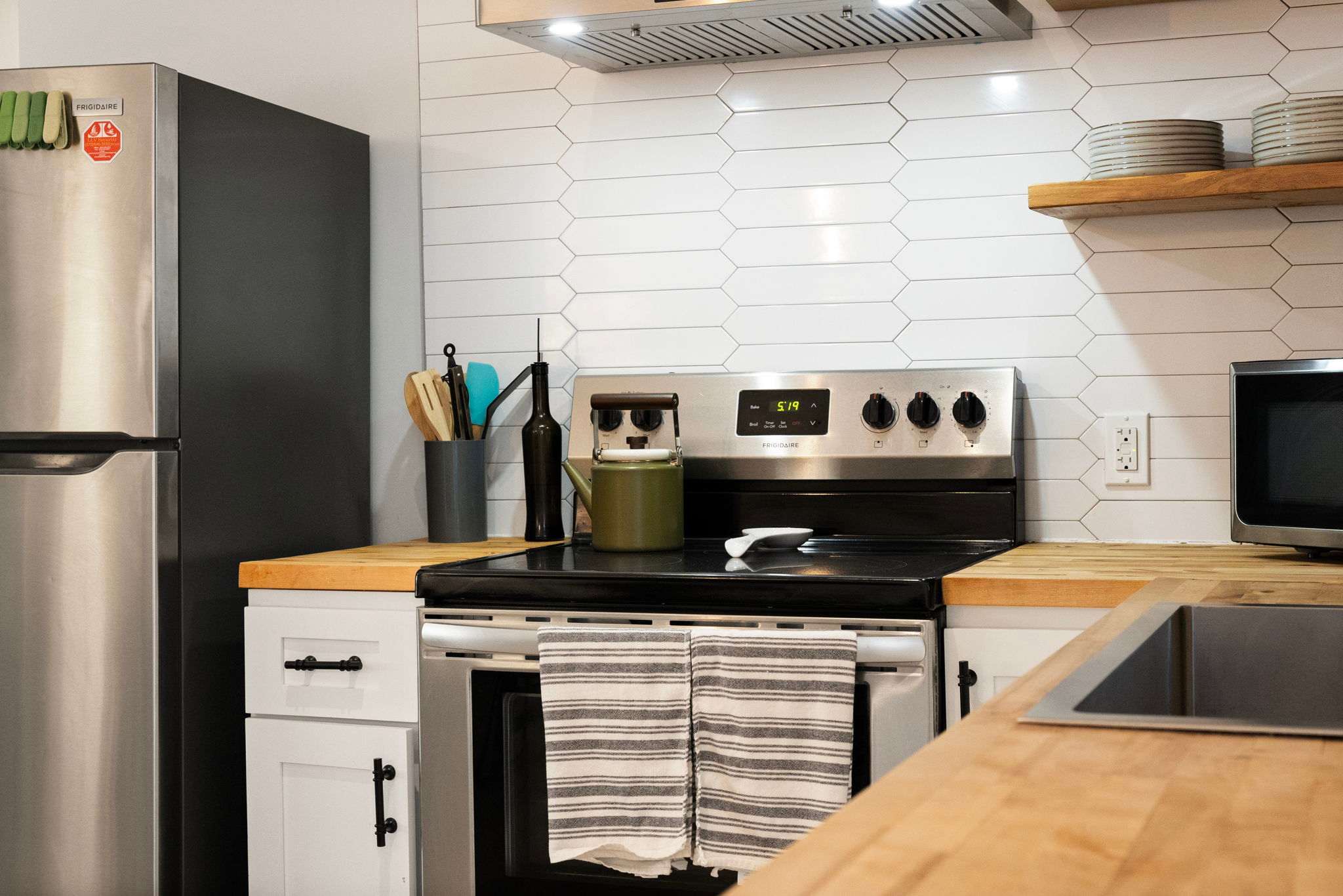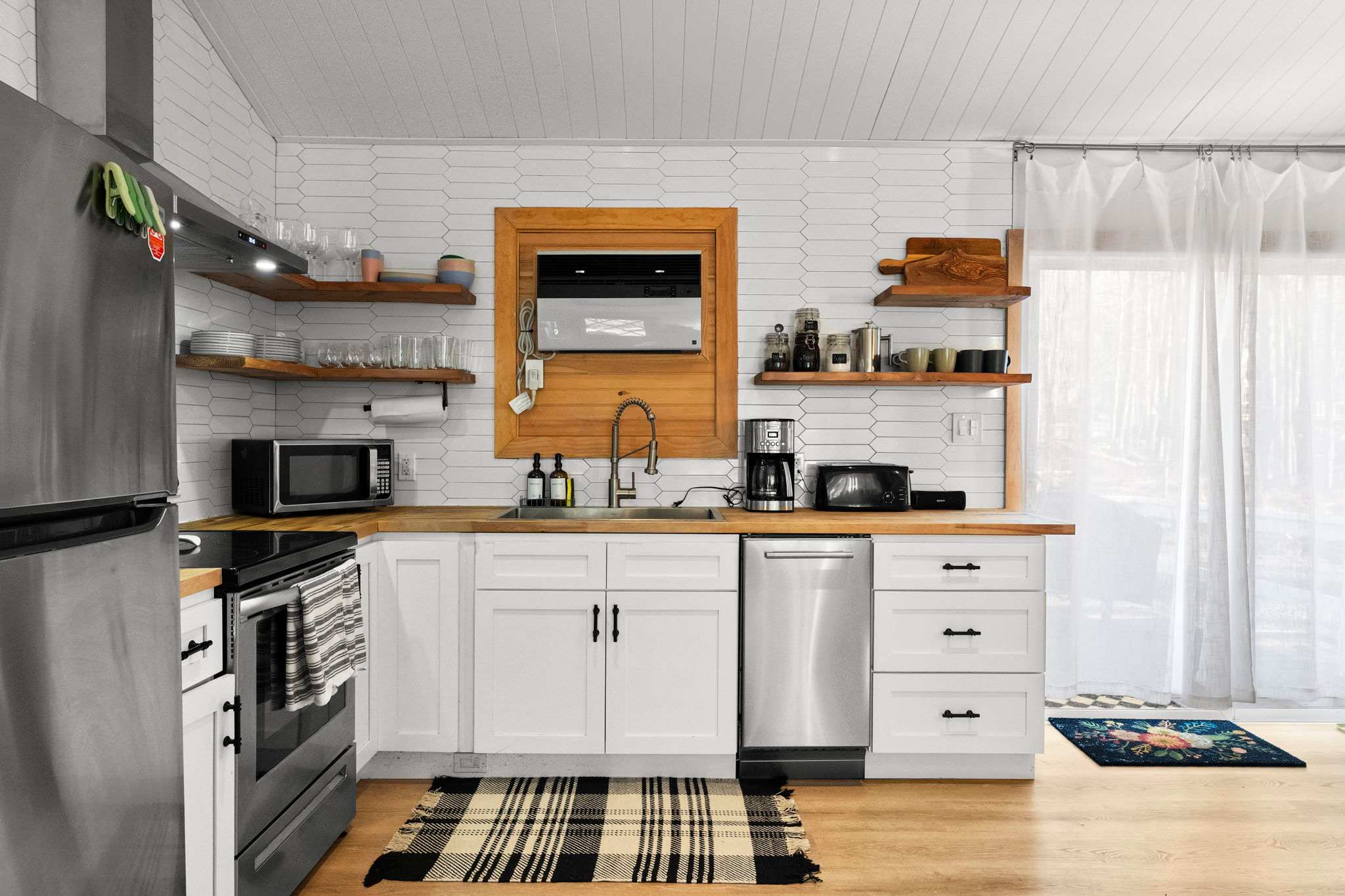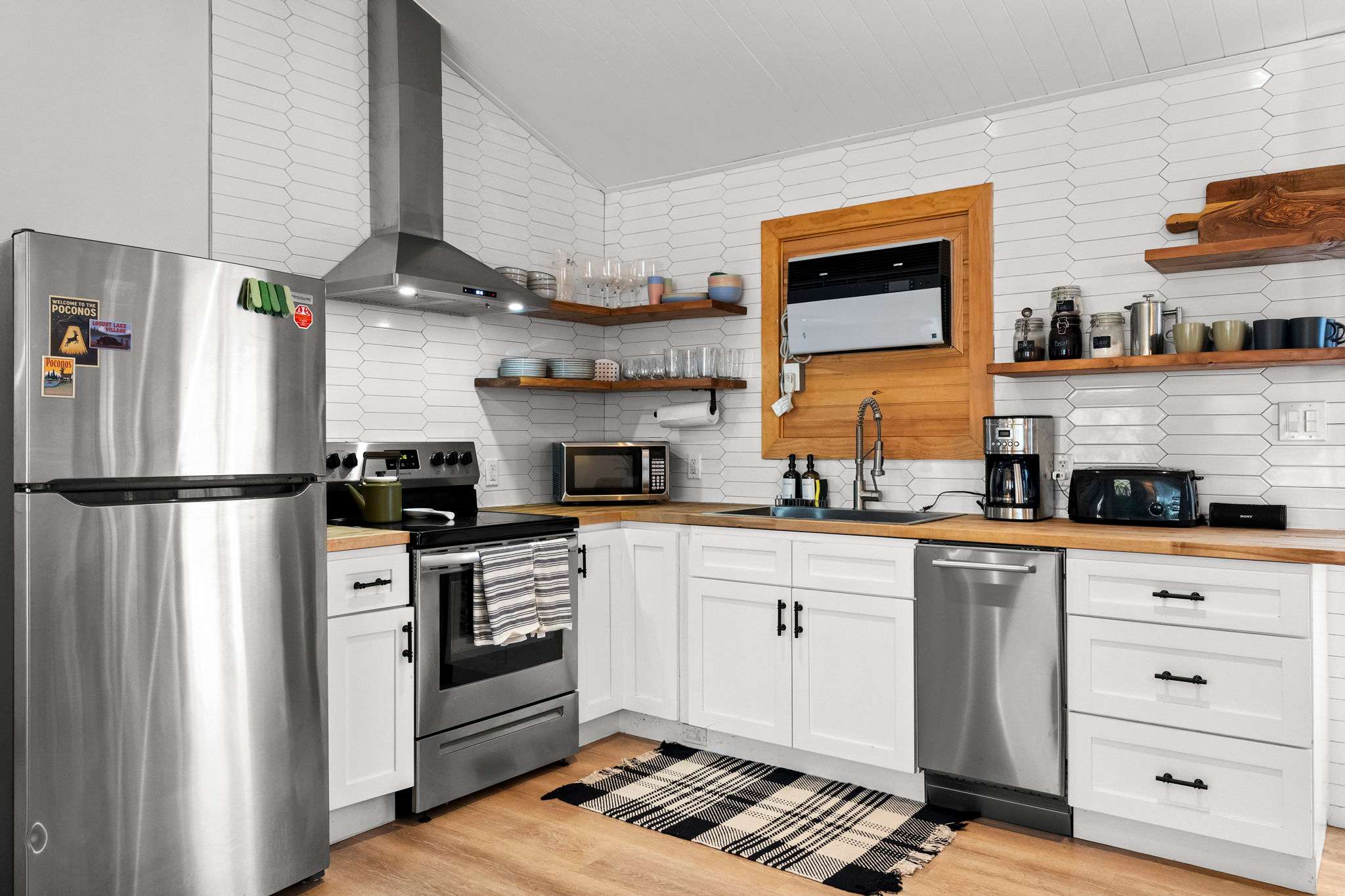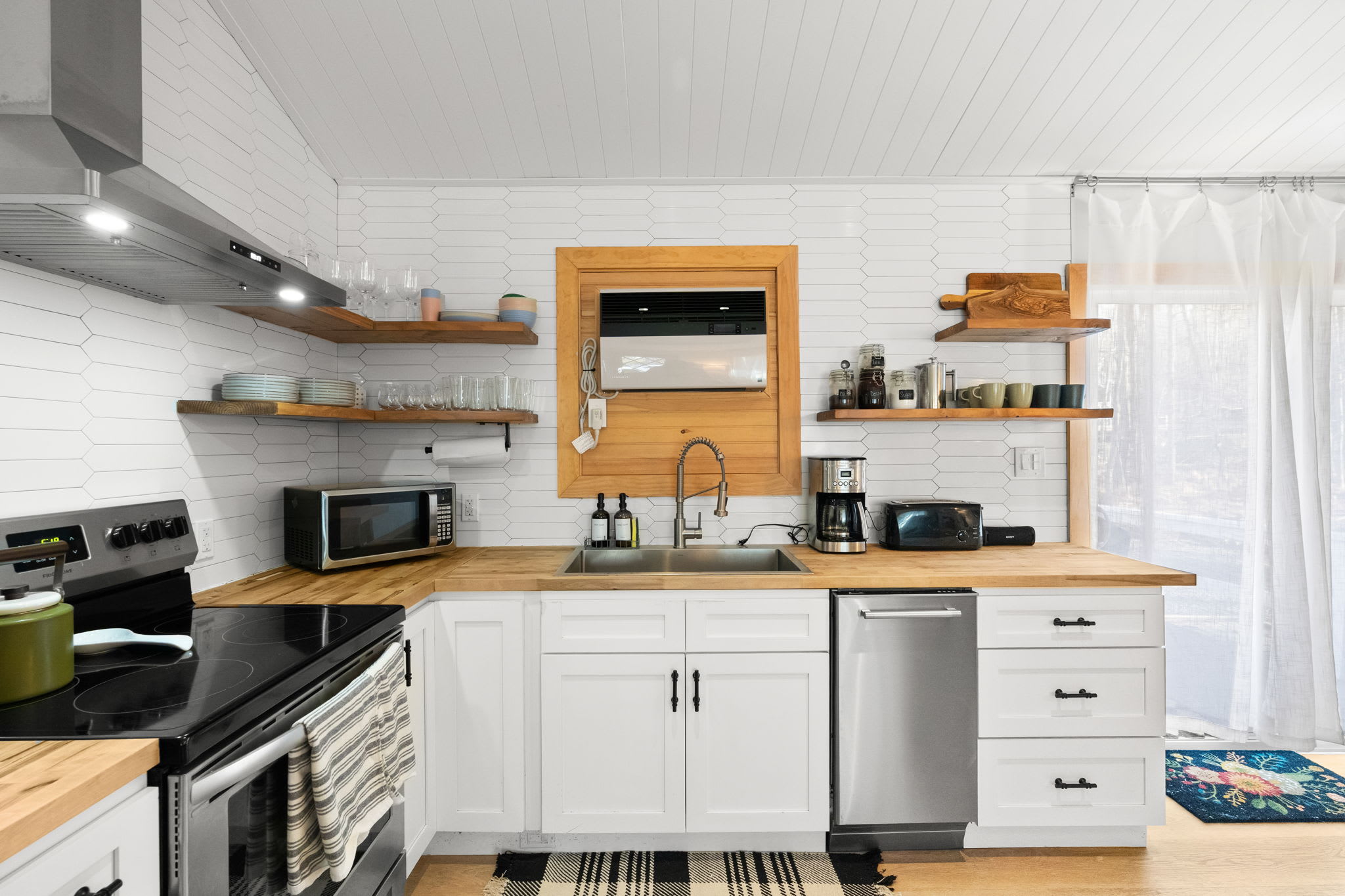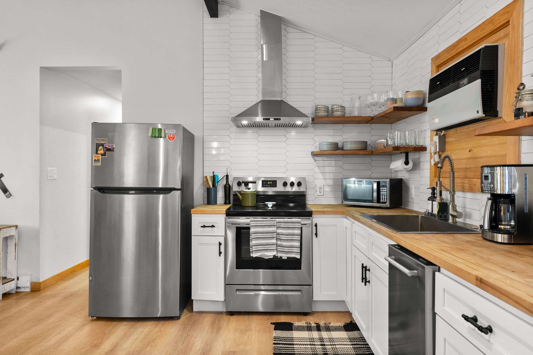 The fully equipped kitchen features white shaker cabinets with black hardware, butcher block countertops, a white hexagonal tile backsplash, and floating wood shelves. You'll have a stainless steel Frigidaire refrigerator, electric range with hood vent, dishwasher, microwave, farmhouse sink, coffee maker, and toaster β everything you need to cook for the group.