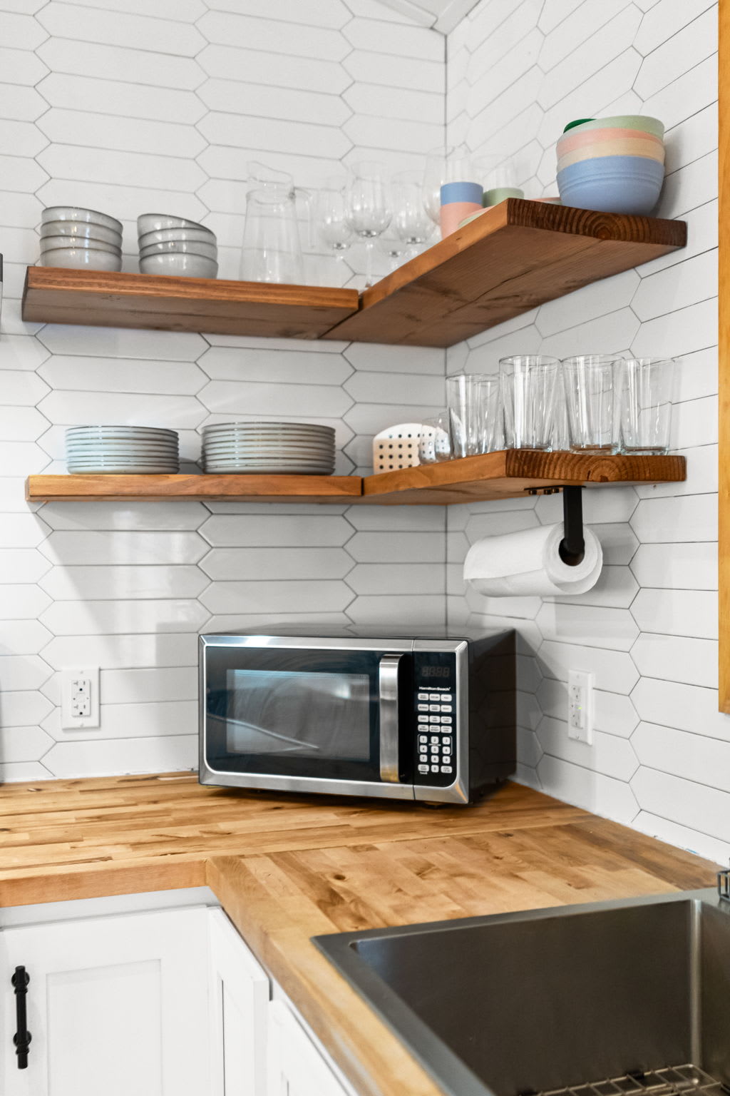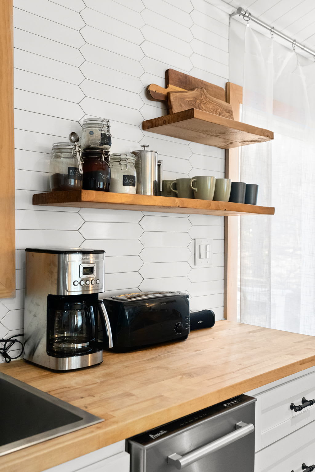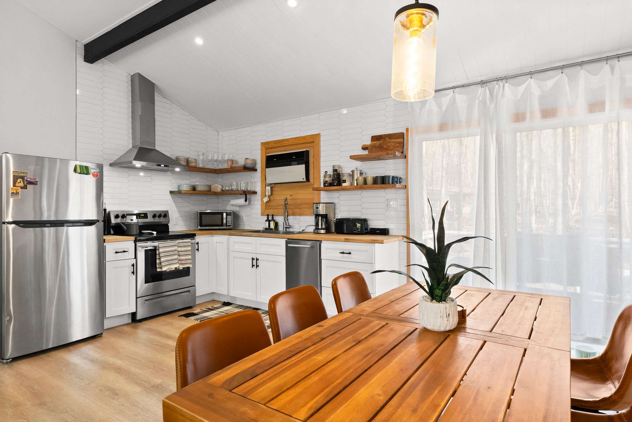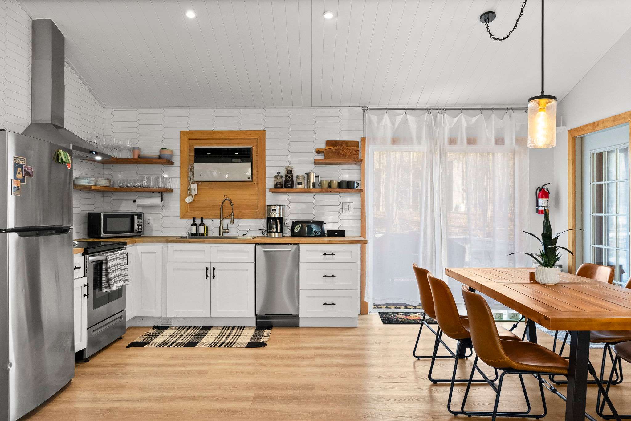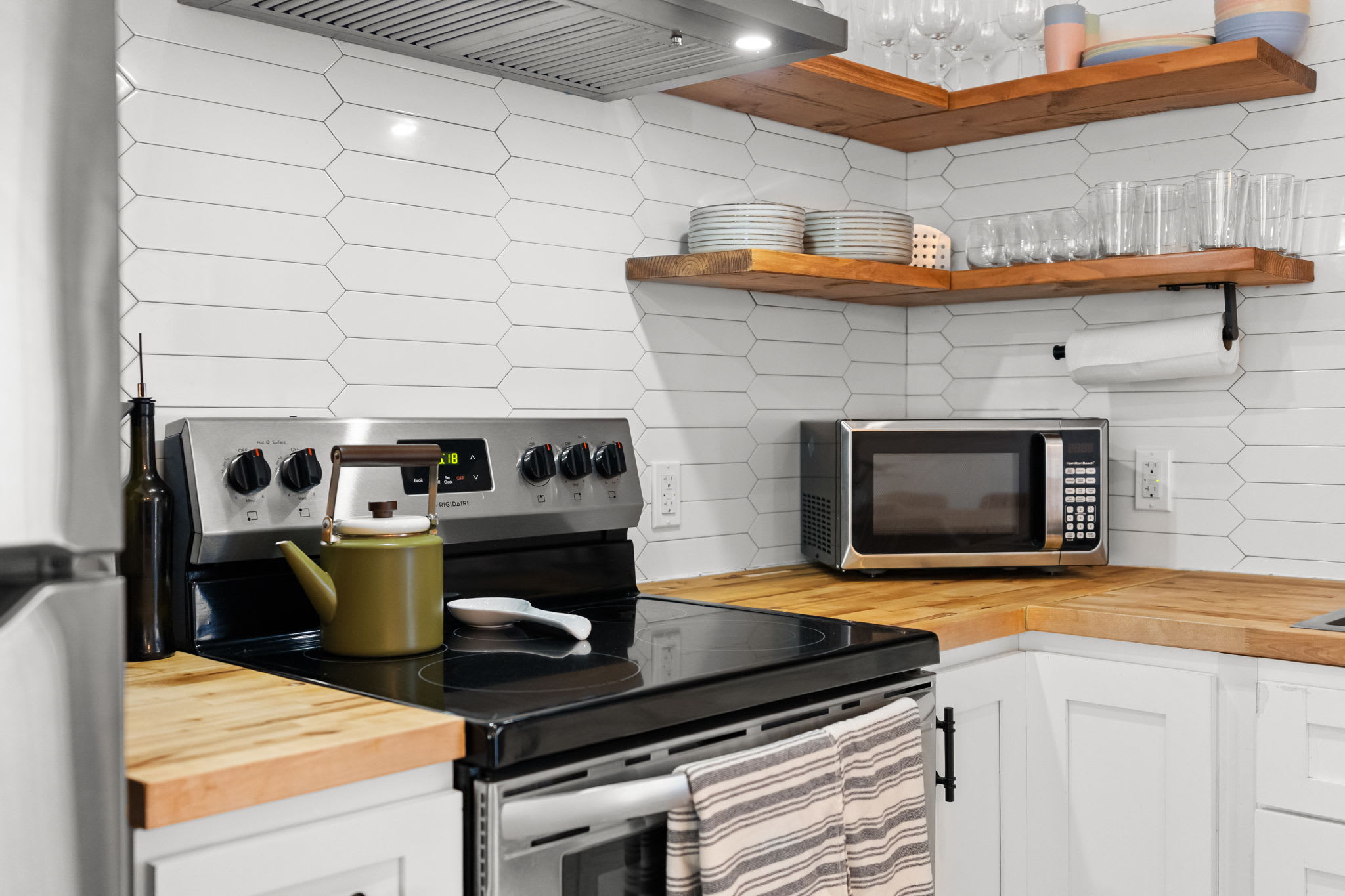 The fully equipped kitchen features white shaker cabinets with black hardware, butcher block countertops, a white hexagonal tile backsplash, and floating wood shelves. You'll have a stainless steel Frigidaire refrigerator, electric range with hood vent, dishwasher, microwave, farmhouse sink, coffee maker, and toaster β everything you need to cook for the group.