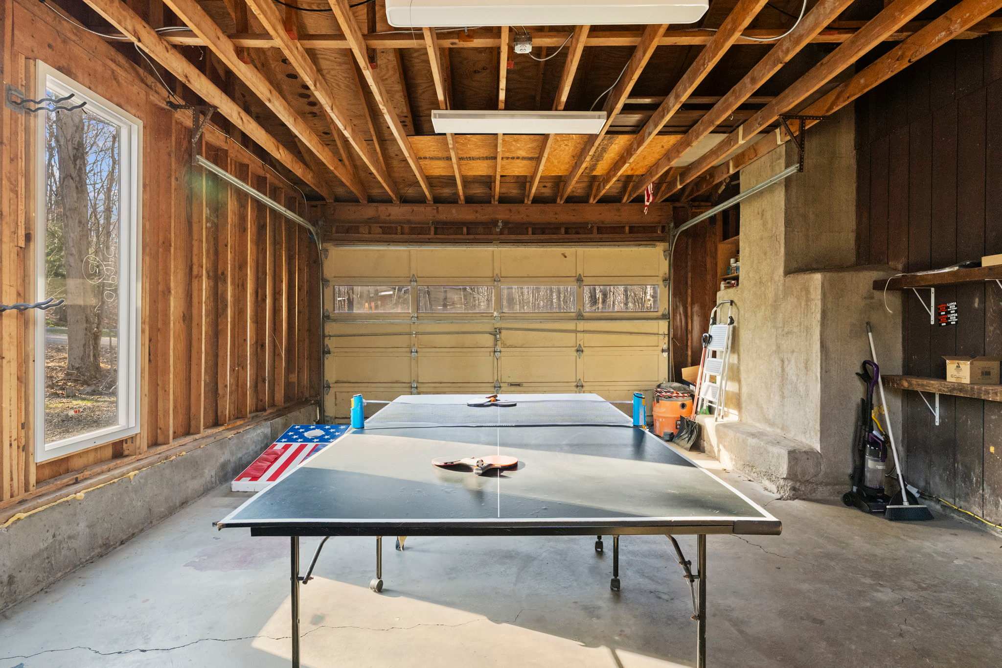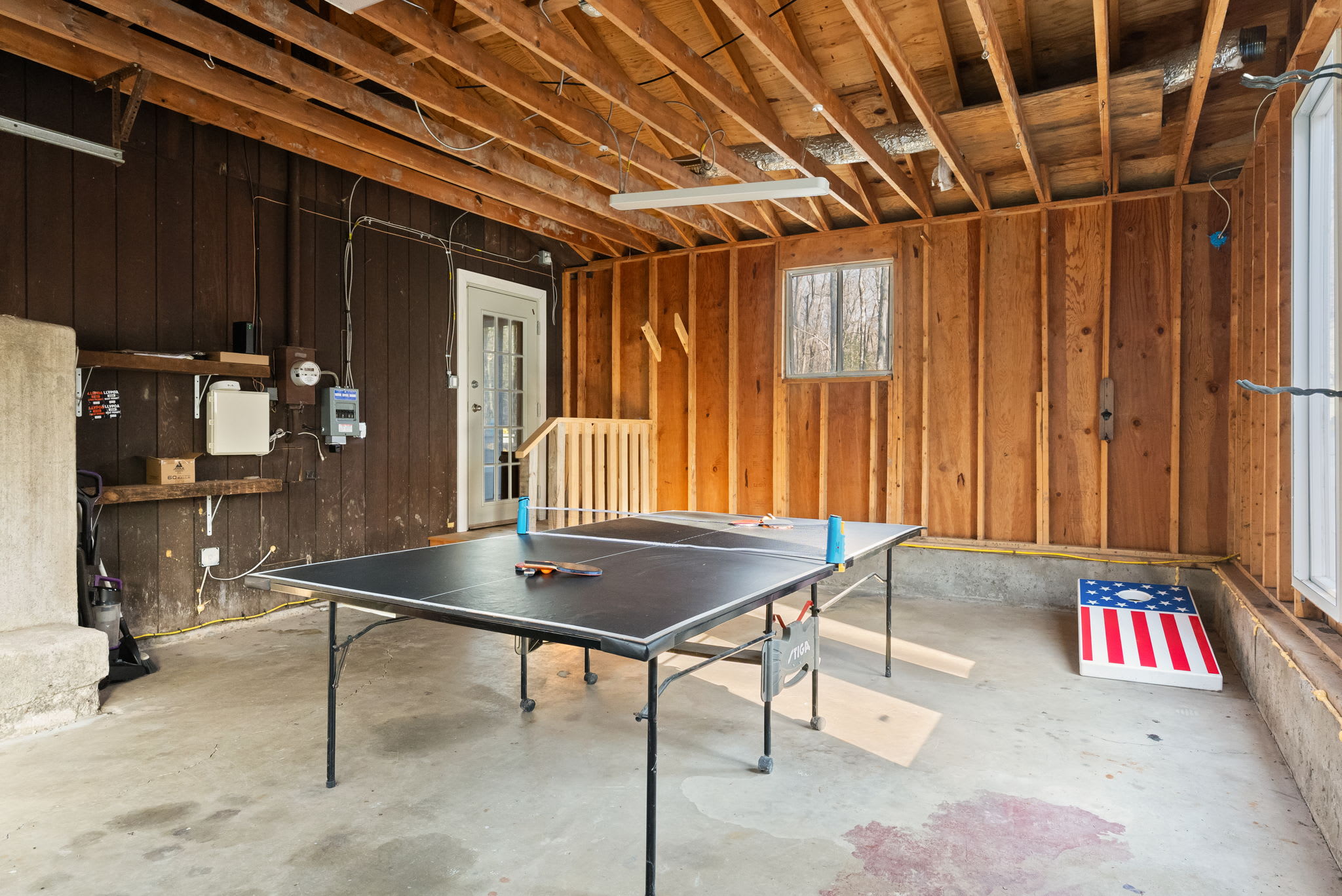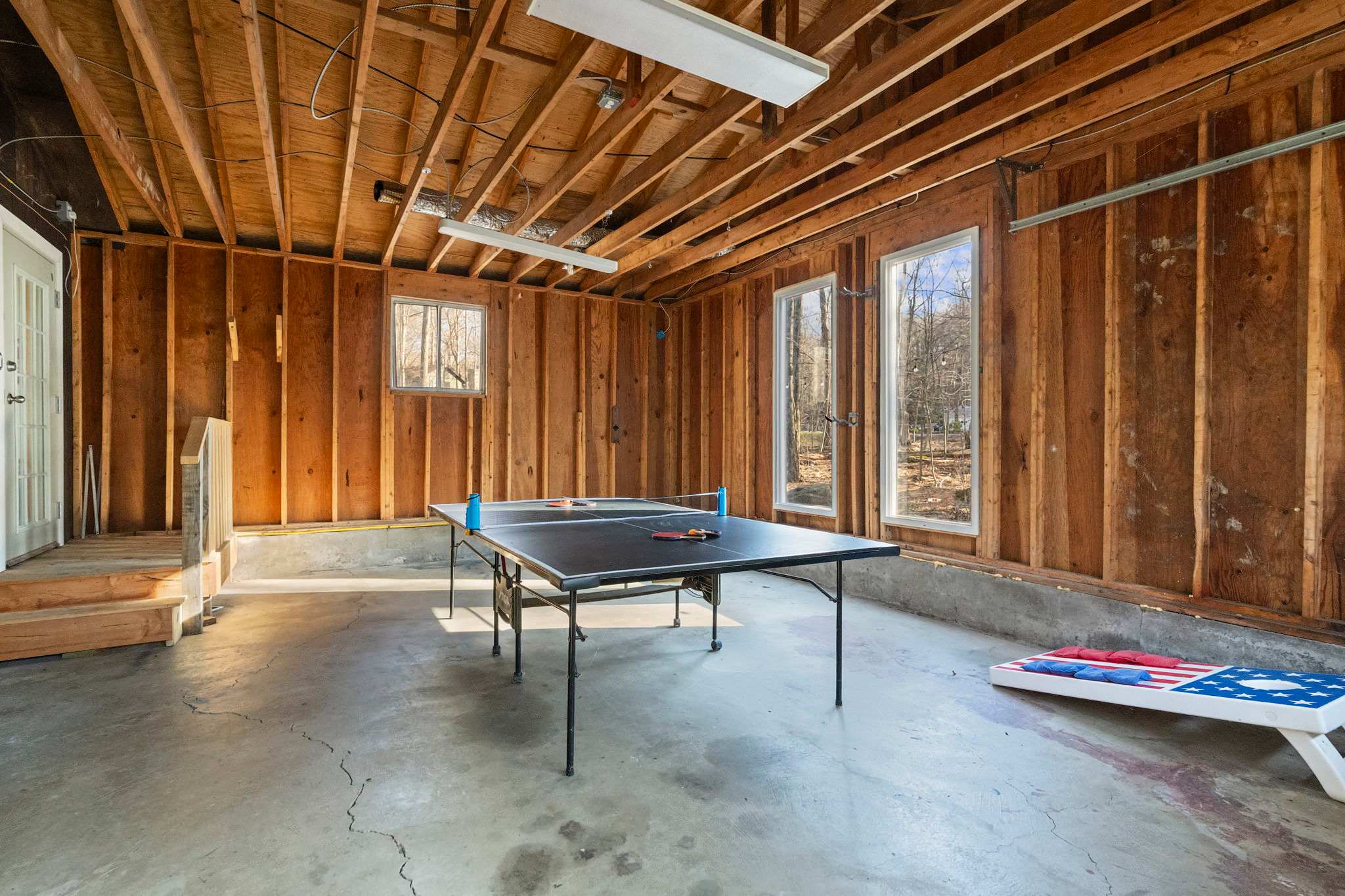 The converted garage serves as a dedicated game room with a full-size ping pong table and American flag cornhole boards β great for rainy days or friendly tournaments.