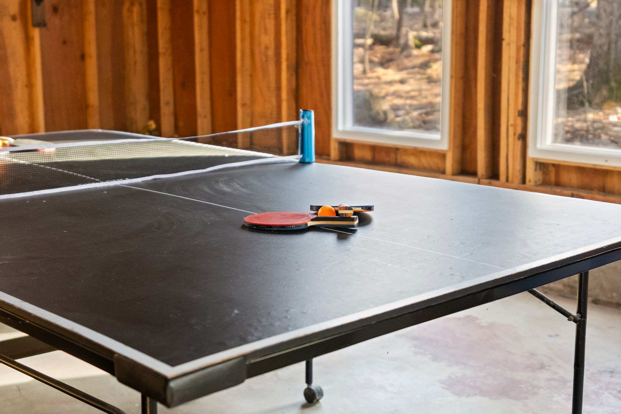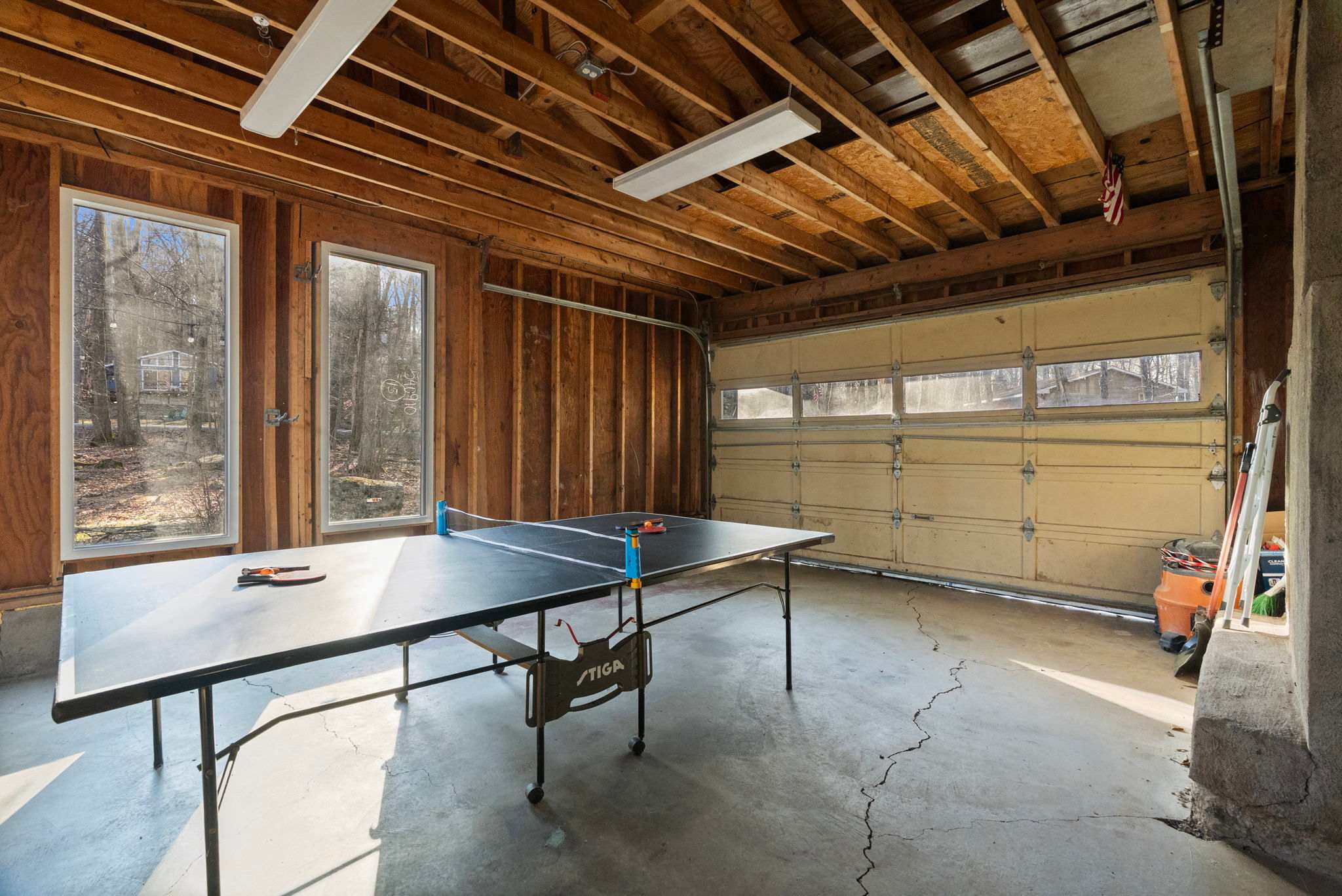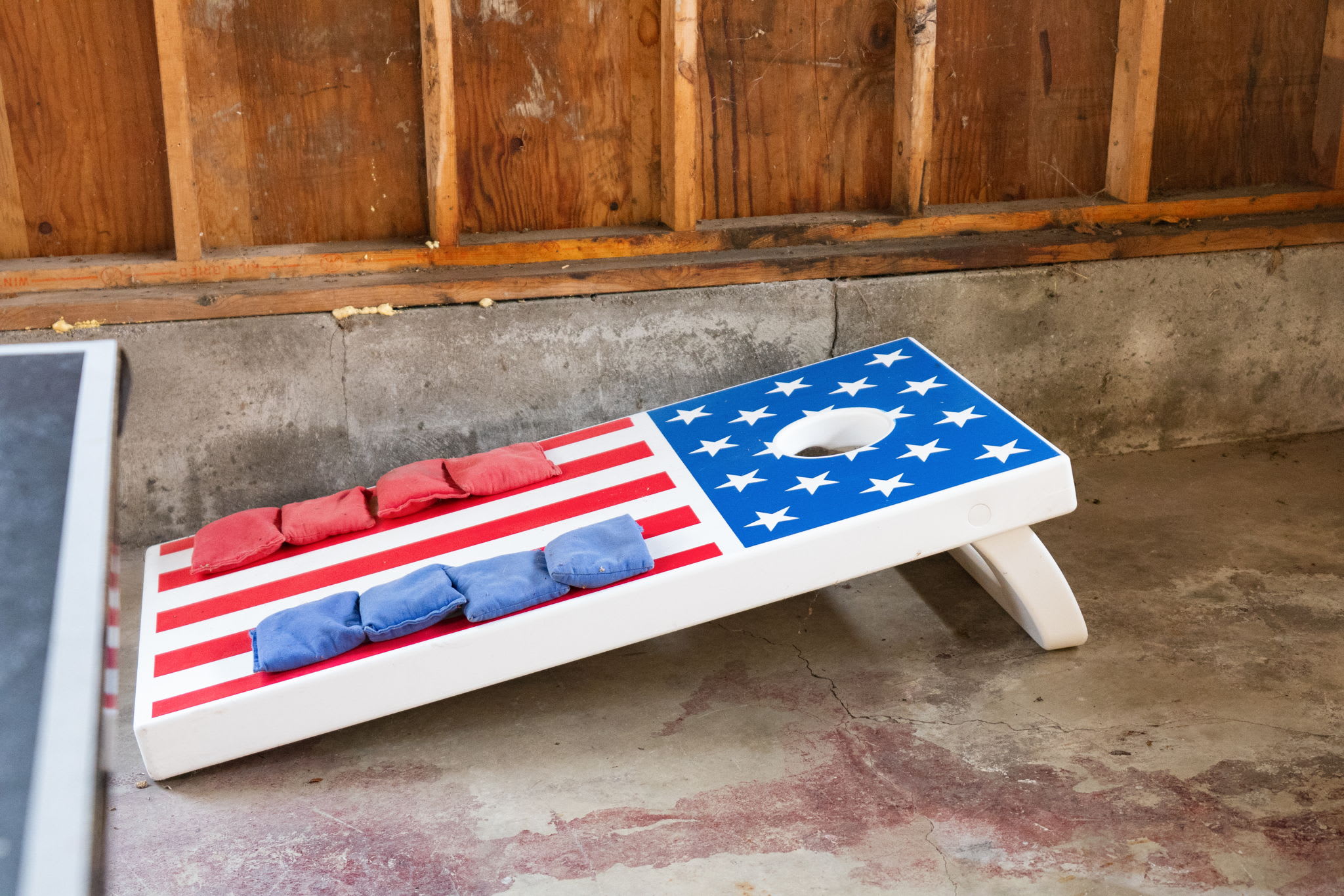 The converted garage serves as a dedicated game room with a full-size ping pong table and American flag cornhole boards β great for rainy days or friendly tournaments.