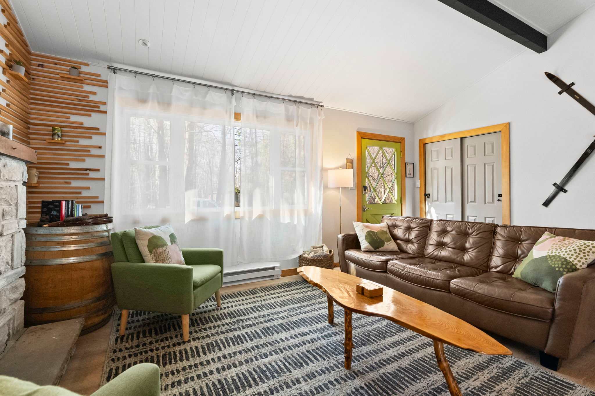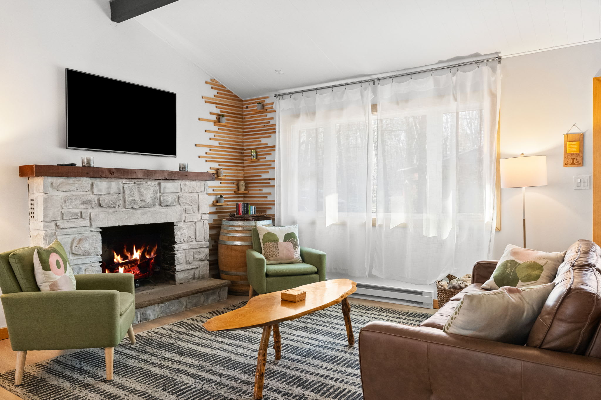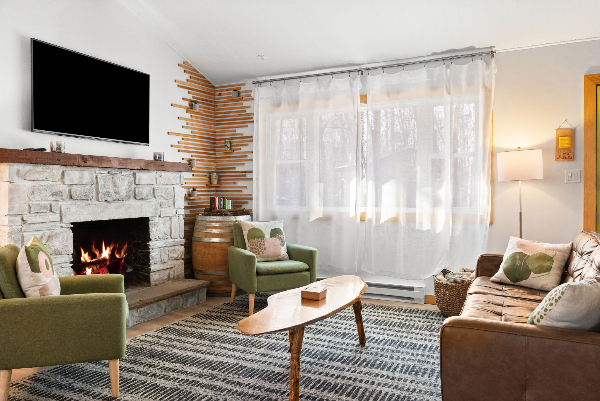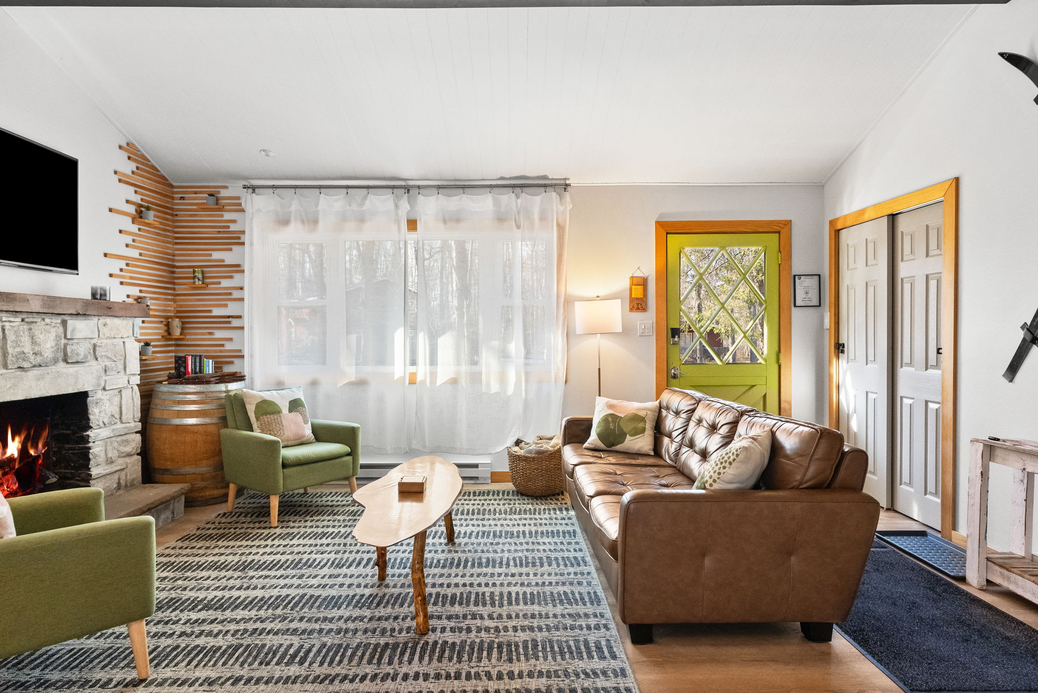 Step through the signature chartreuse green front door into a warm, open-concept living area with a beautiful stone propane fireplace, a reclaimed wood mantel, and a decorative slat accent wall with a wine barrel side table. The living room features a leather tufted sofa, mid-century green accent chairs, a Smart TV, and views into the surrounding woods. It's the kind of space that makes you want to slow down and settle in. π₯