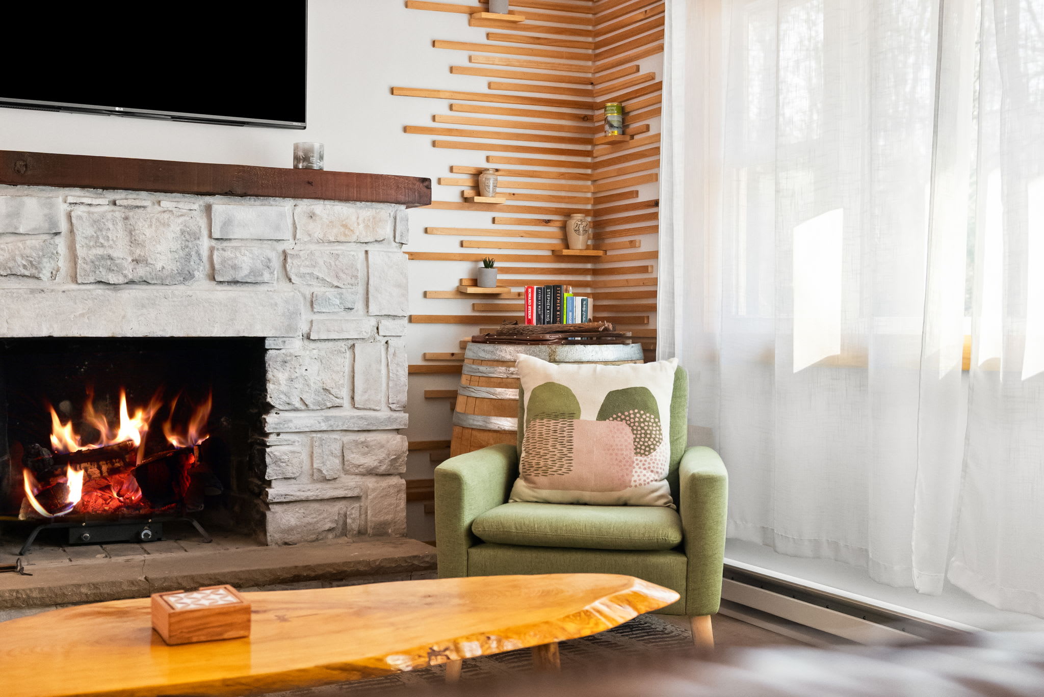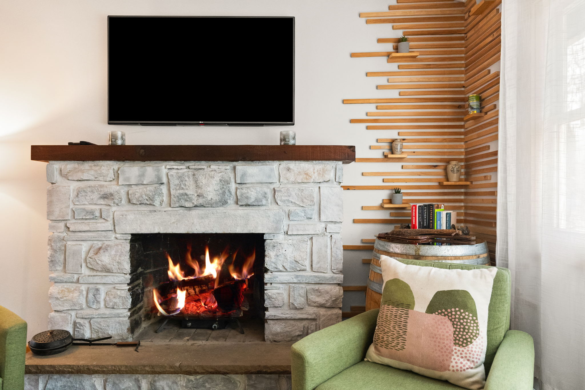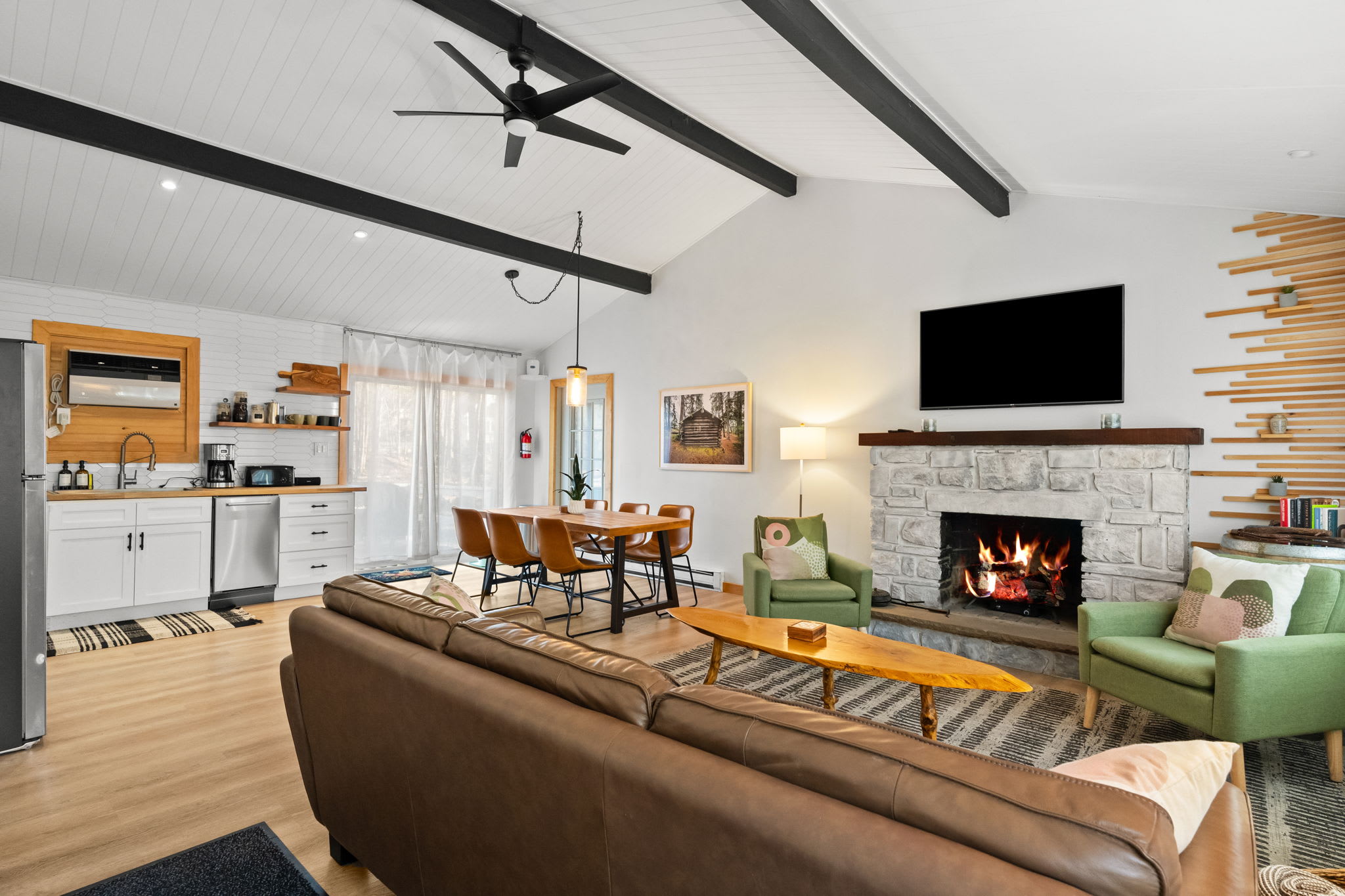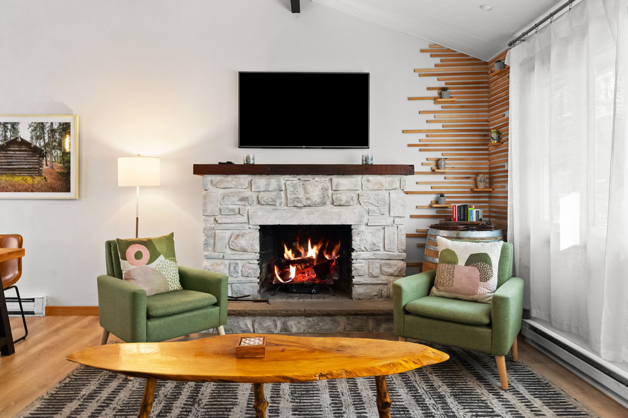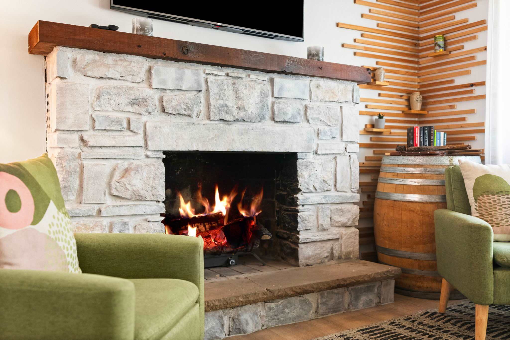 Step through the signature chartreuse green front door into a warm, open-concept living area with a beautiful stone propane fireplace, a reclaimed wood mantel, and a decorative slat accent wall with a wine barrel side table. The living room features a leather tufted sofa, mid-century green accent chairs, a Smart TV, and views into the surrounding woods. It's the kind of space that makes you want to slow down and settle in. π₯