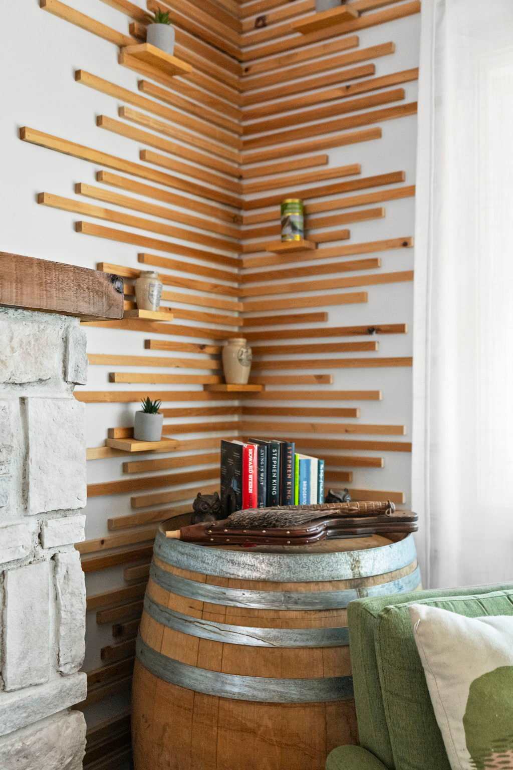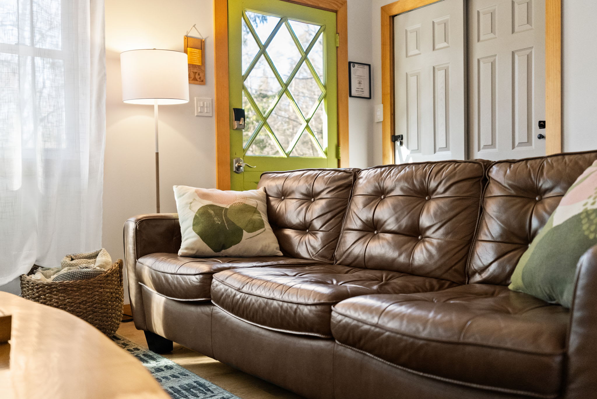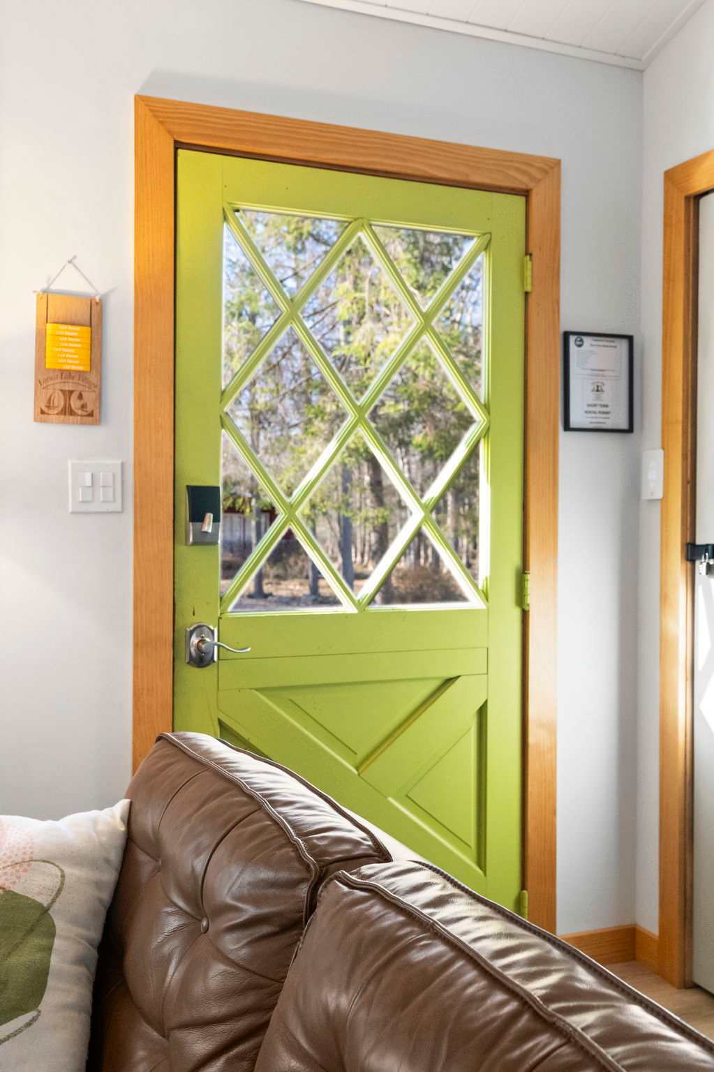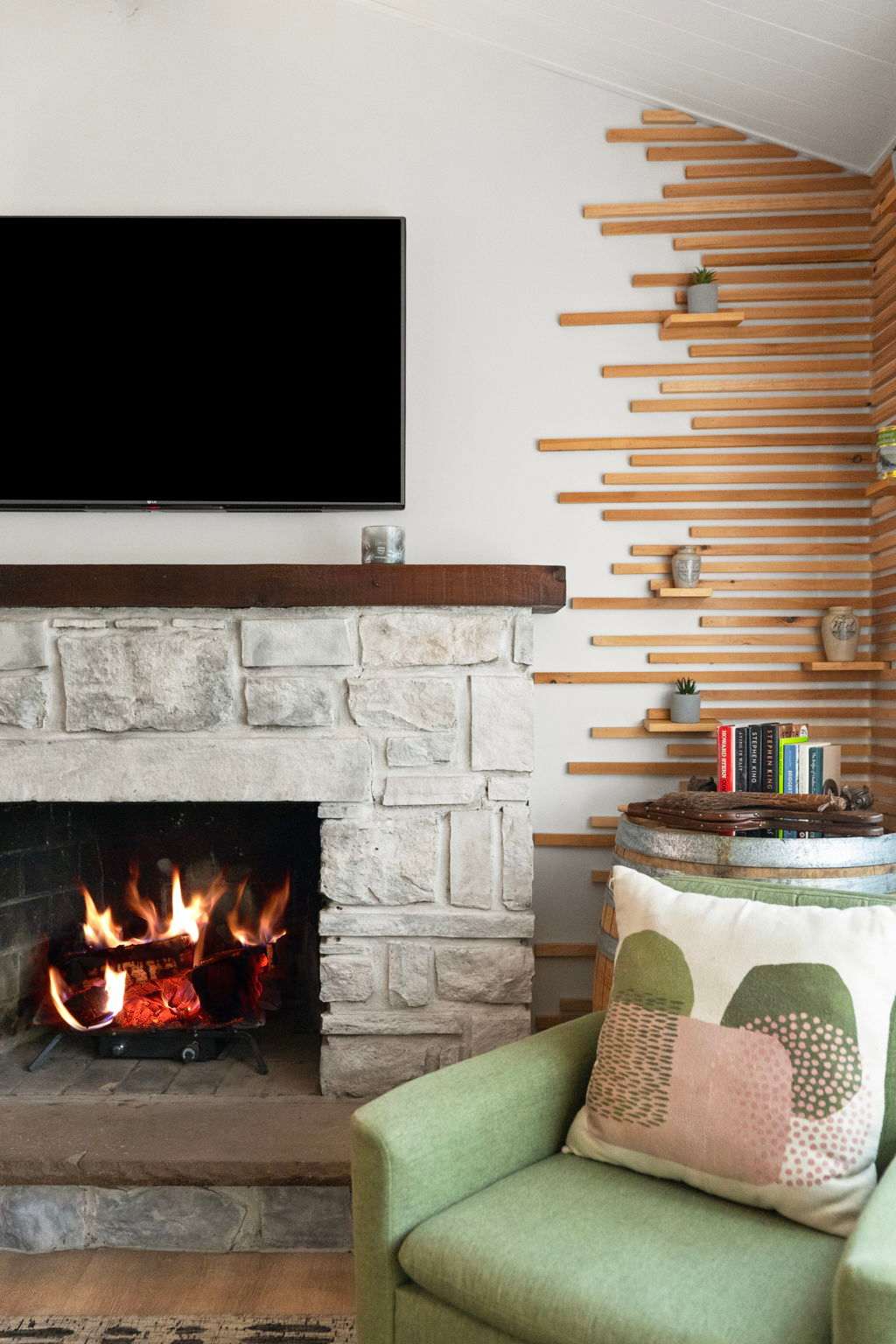Step through the signature chartreuse green front door into a warm, open-concept living area with a beautiful stone propane fireplace, a reclaimed wood mantel, and a decorative slat accent wall with a wine barrel side table. The living room features a leather tufted sofa, mid-century green accent chairs, a Smart TV, and views into the surrounding woods. It's the kind of space that makes you want to slow down and settle in. π₯
