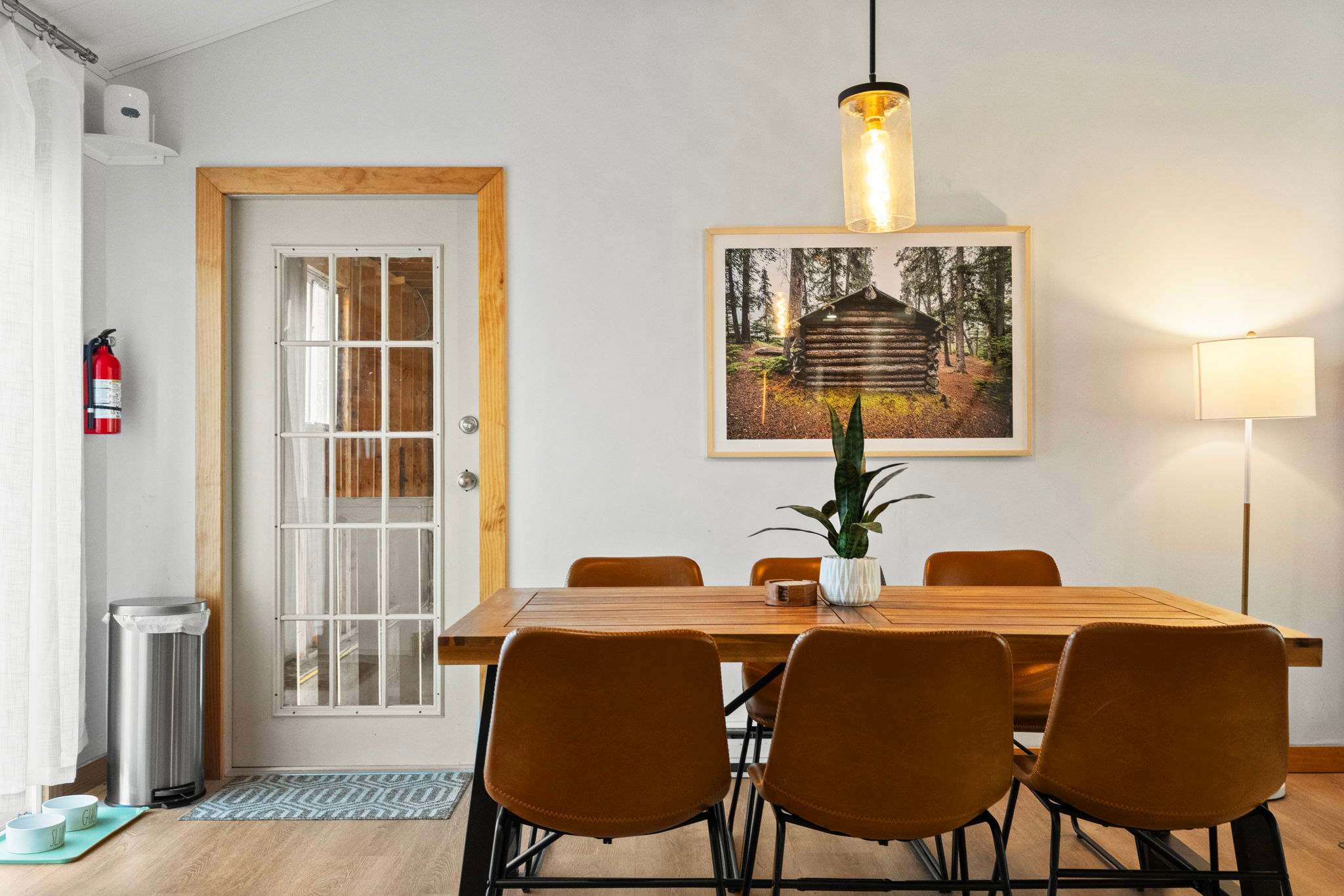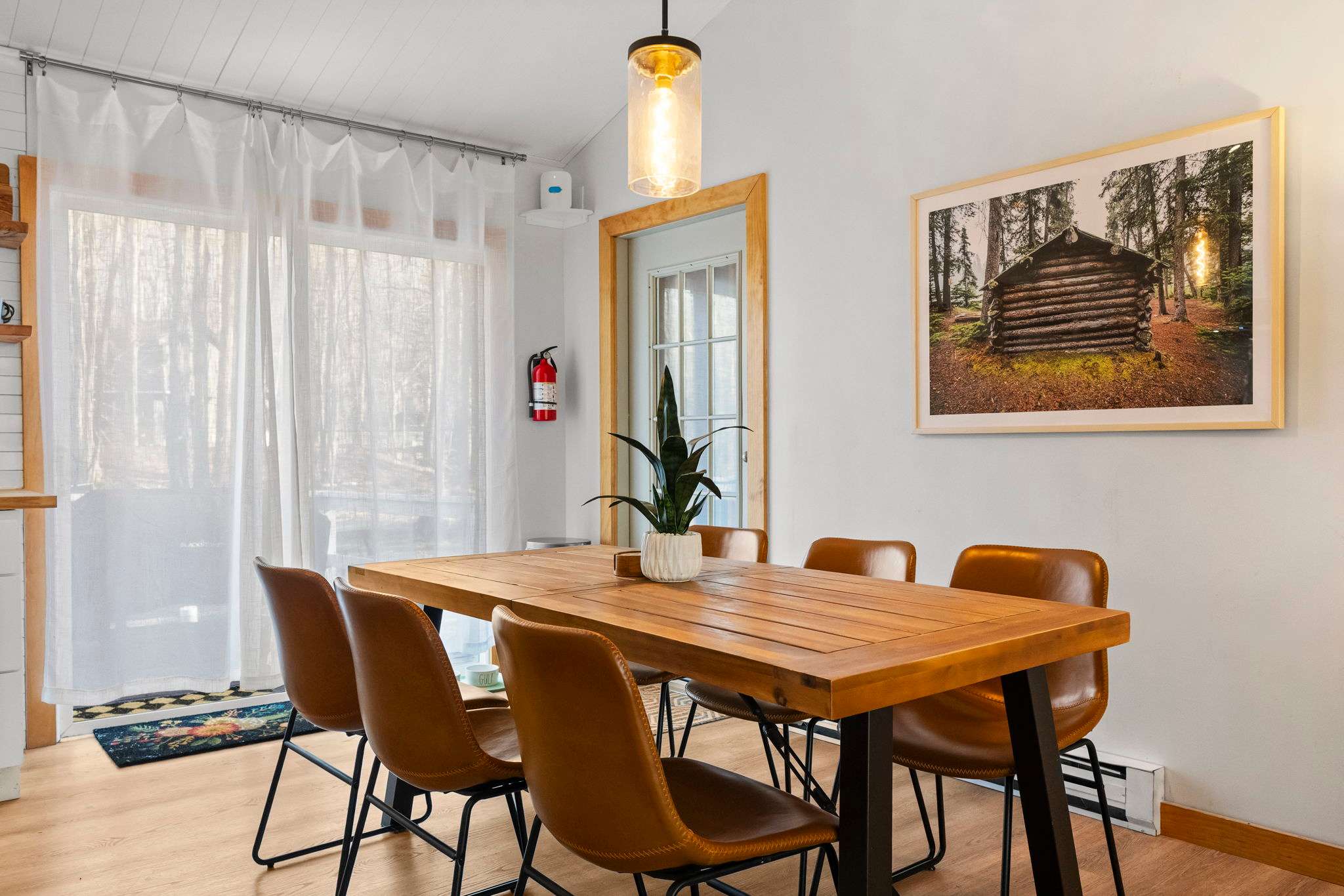 The dining area sits just off the kitchen with a rustic wood table for 6, camel leather chairs, a glass pendant light, and cabin-inspired artwork. A French door connects to the enclosed sunroom for extra seating and morning coffee with a view. β