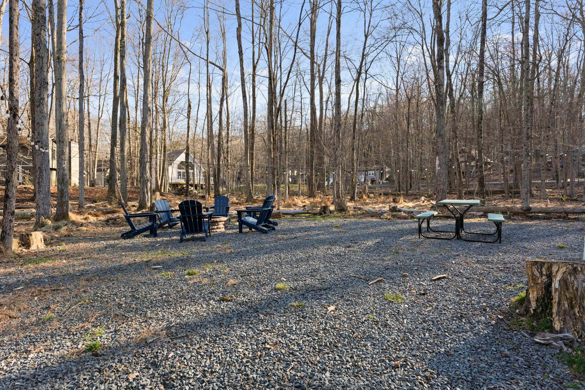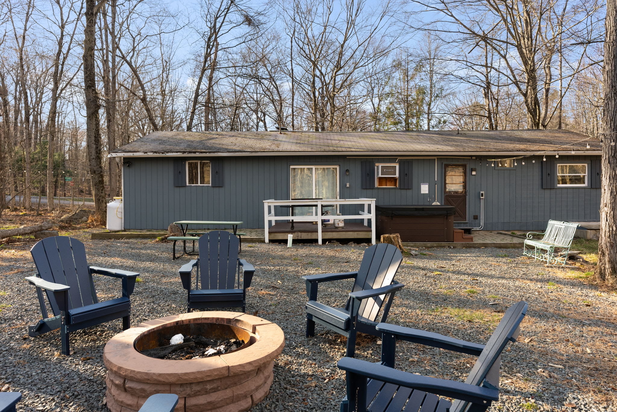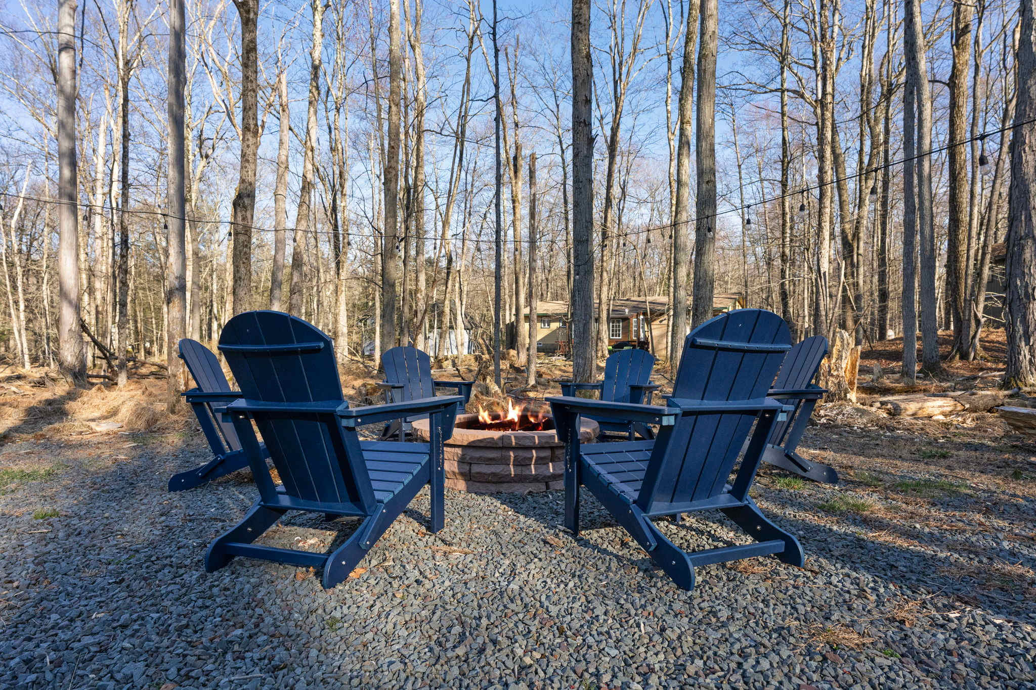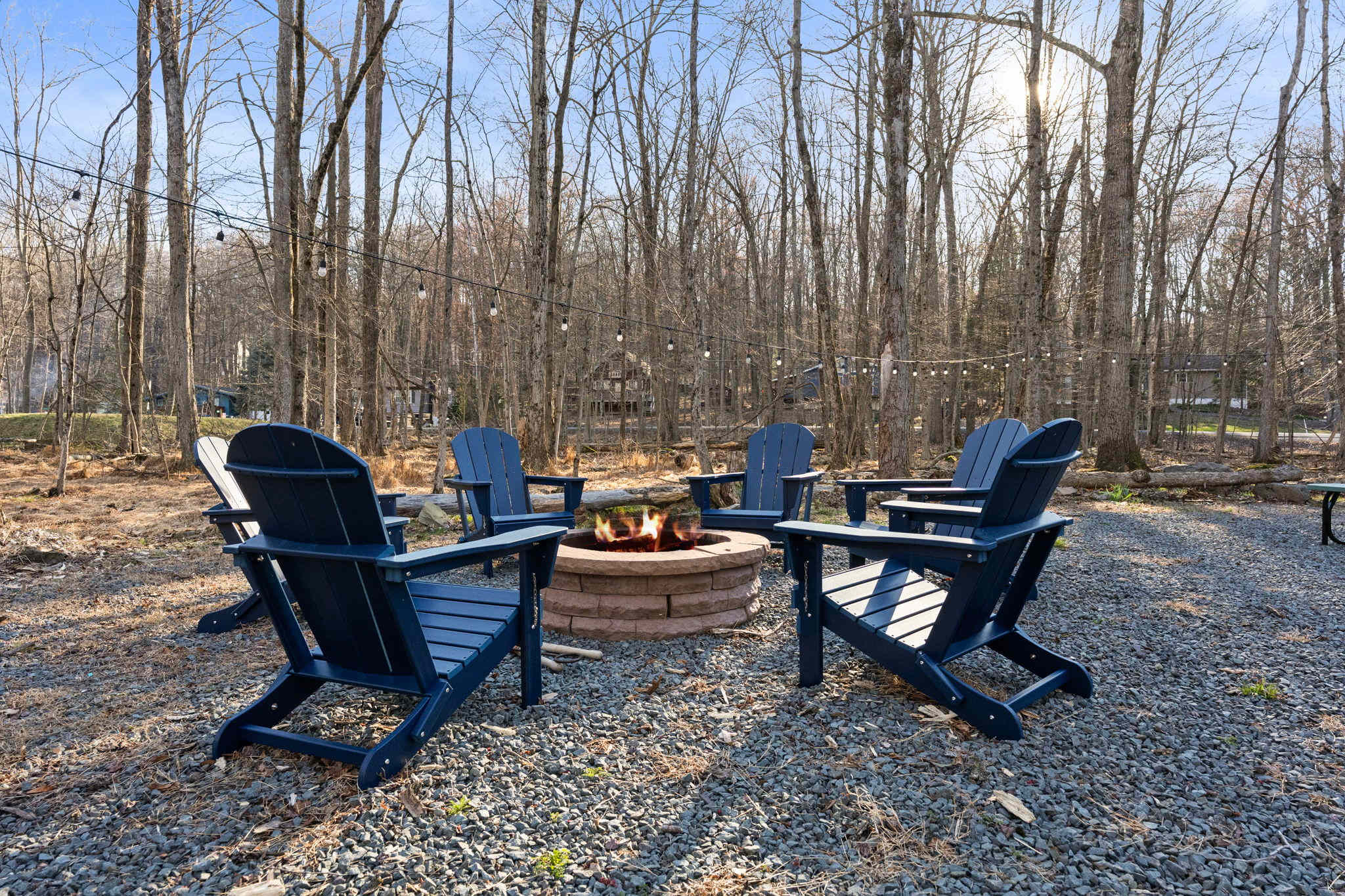 βͺοΈπ₯ Wood-Burning Fire Pit β A stone fire pit surrounded by 6 navy Adirondack chairs with string lights strung through the trees overhead