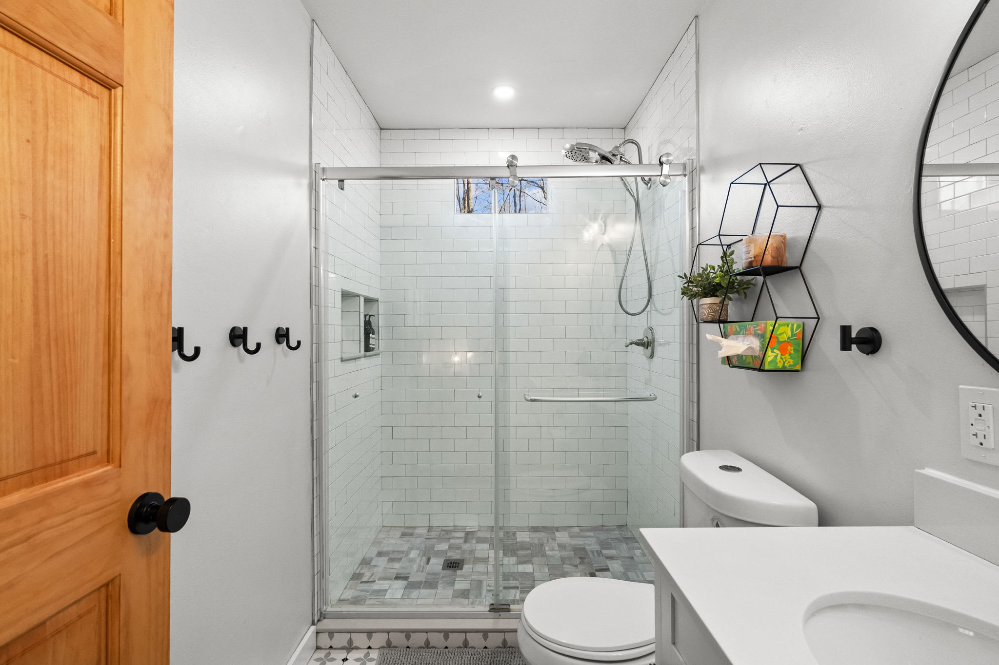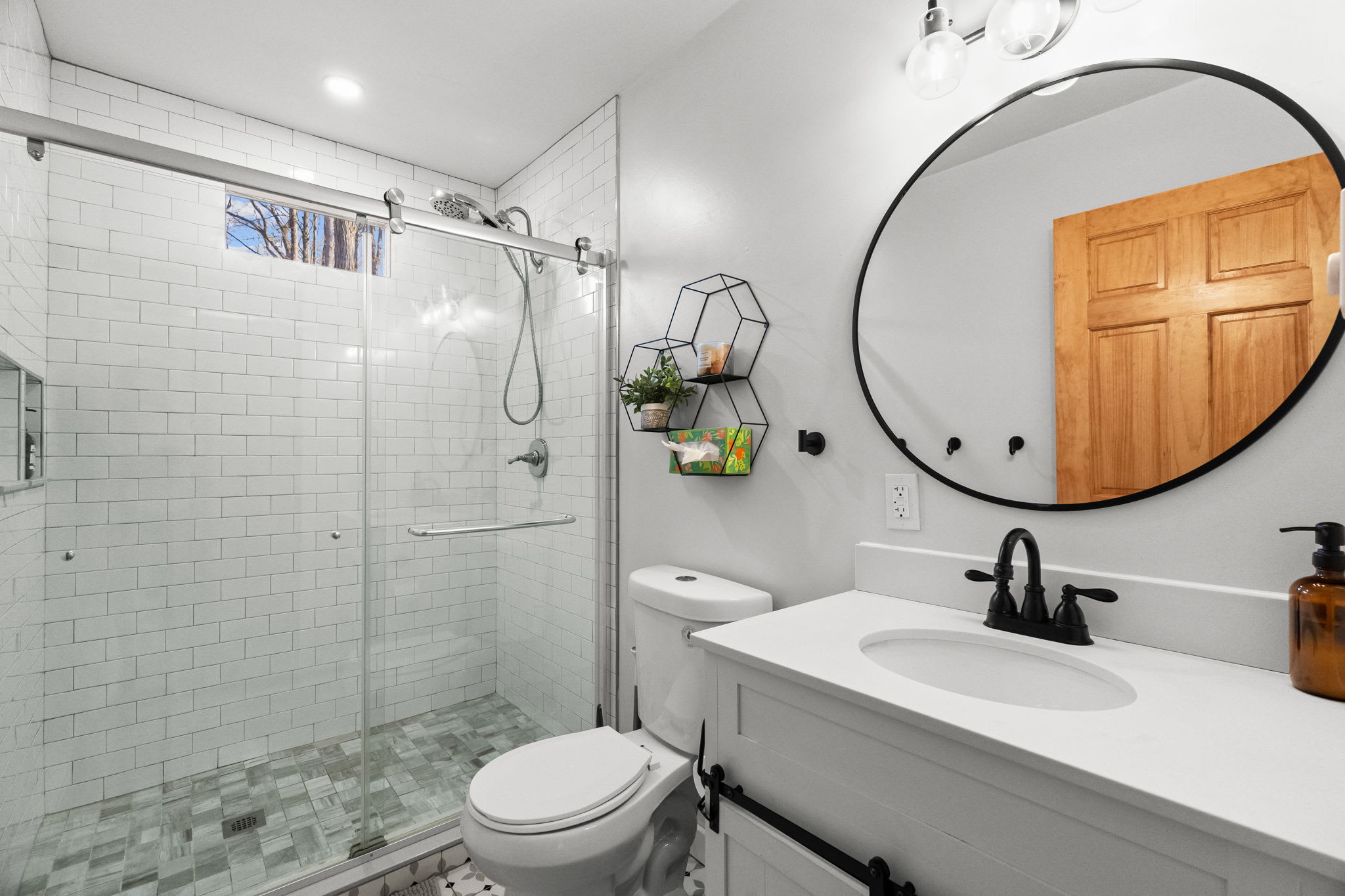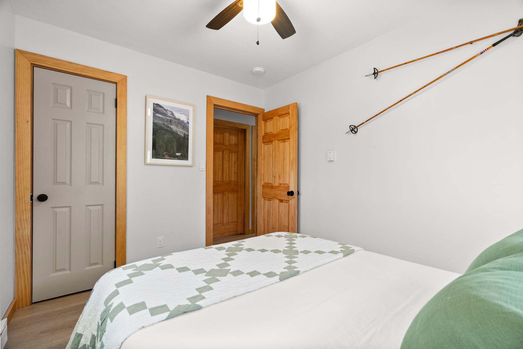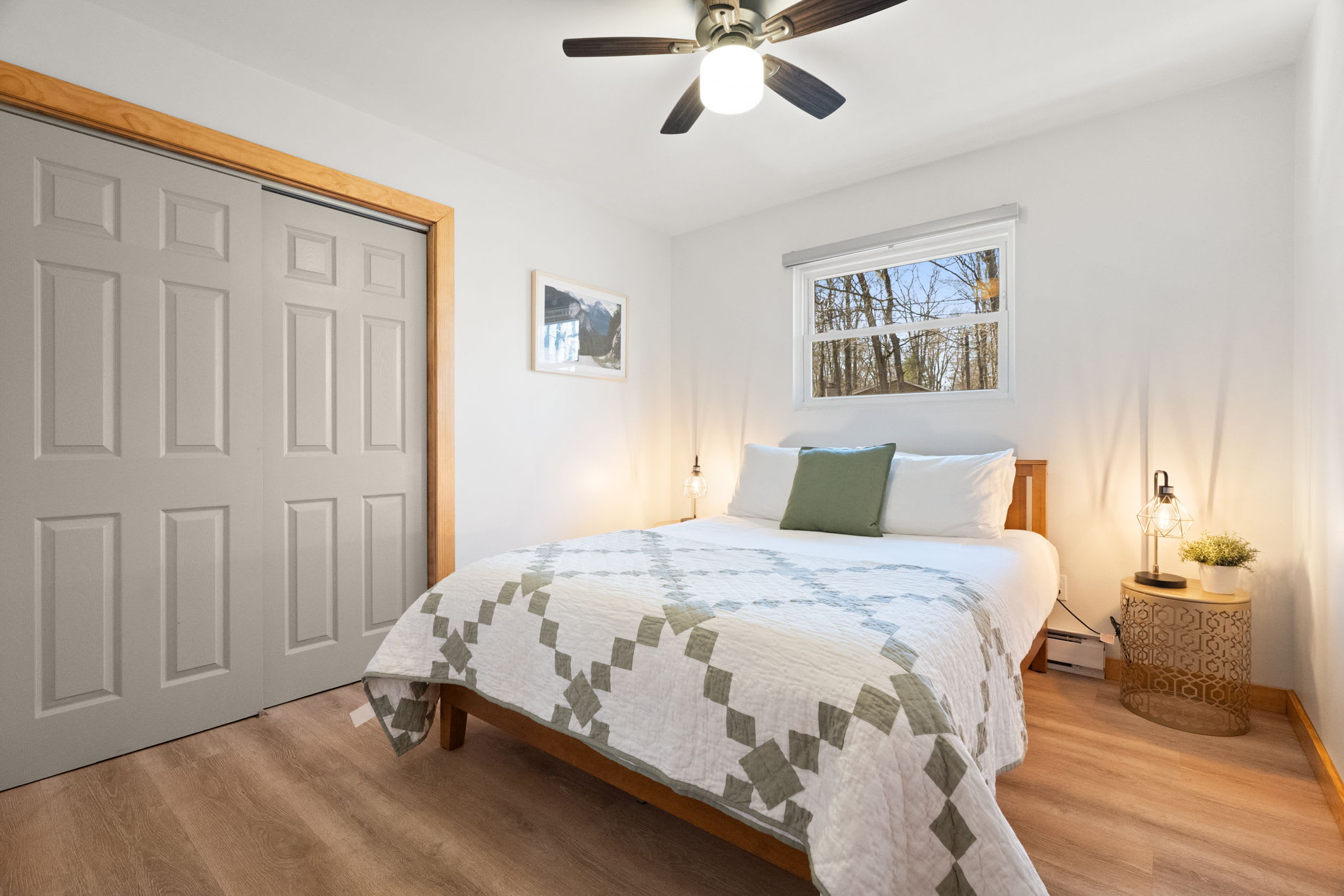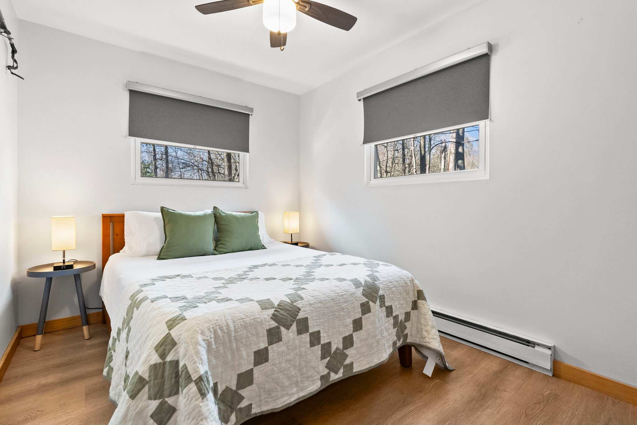Each bedroom is thoughtfully decorated with mountain-inspired art, quilted bedding in soft greens and whites, ceiling fans, and room-darkening shades. The bunk room is perfect for kids or friends traveling together. Both bathrooms are fully updated with white subway tile walk-in showers, glass sliding doors, marble mosaic floors, black fixtures, round mirrors, and modern white vanities. π