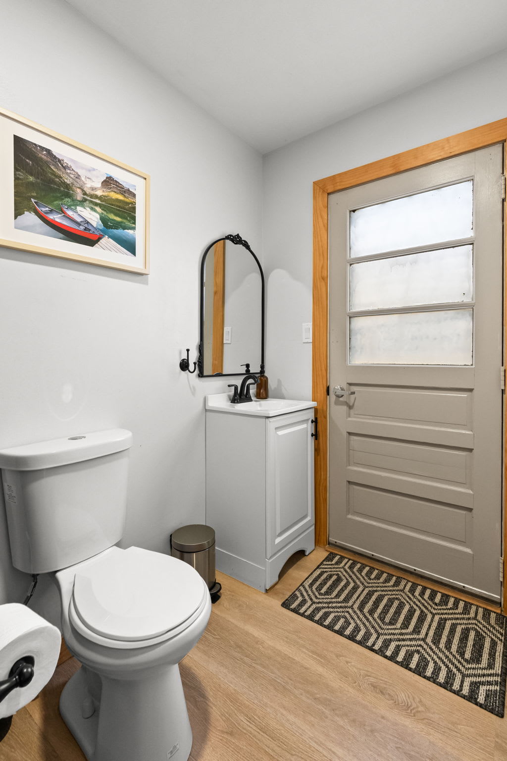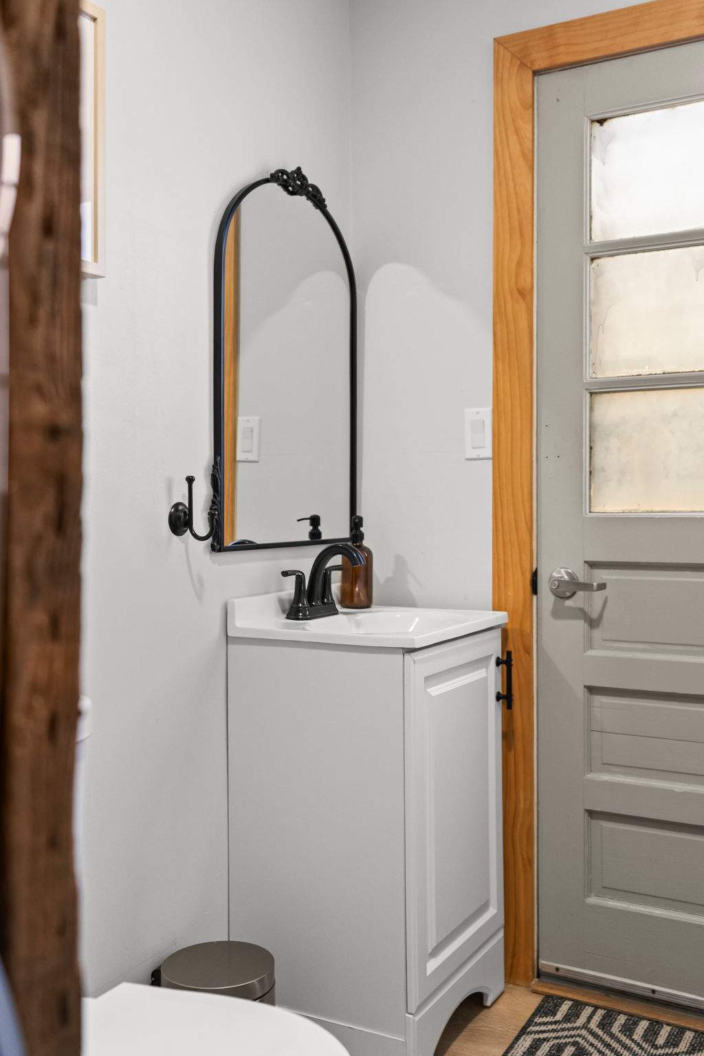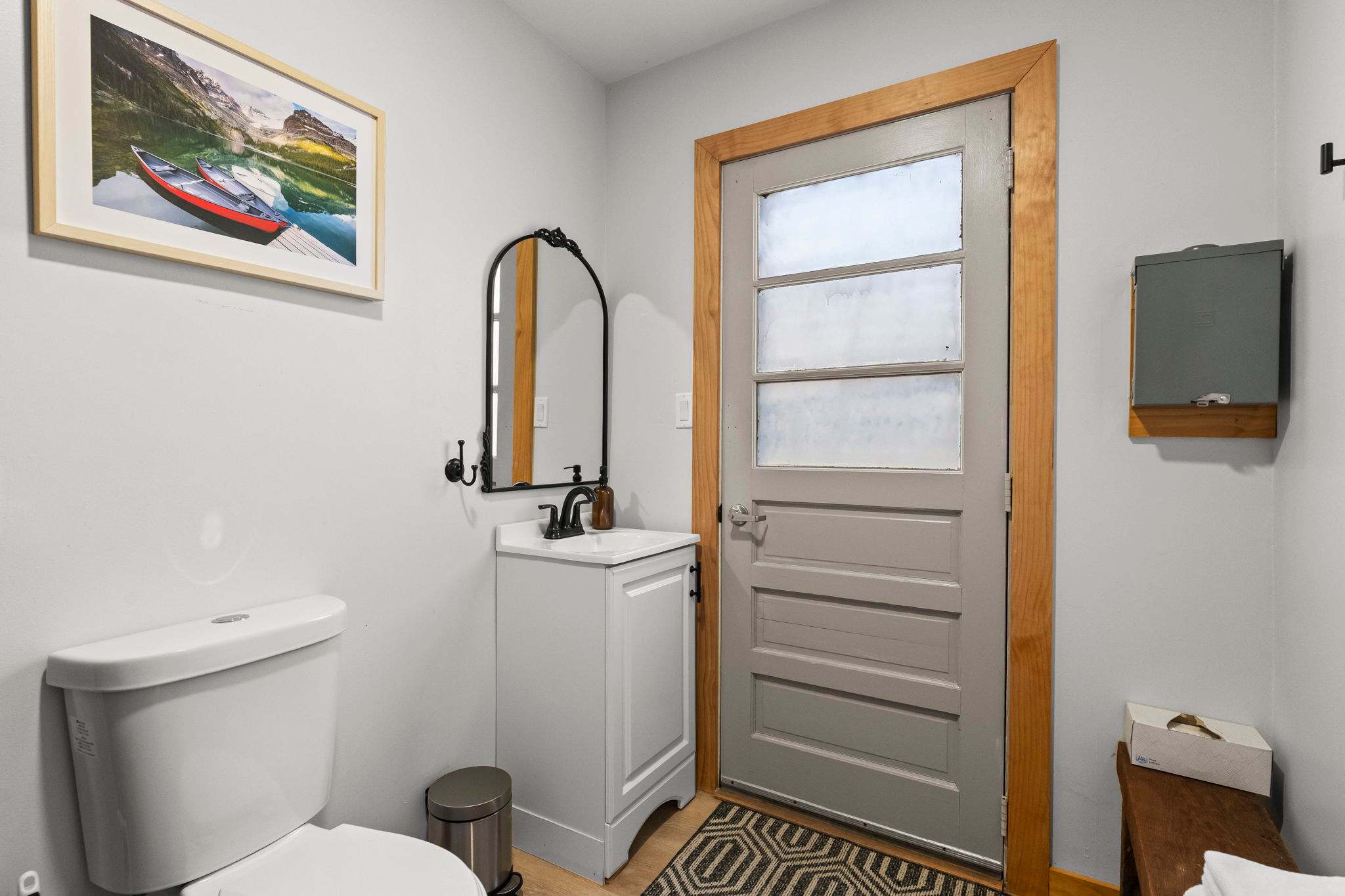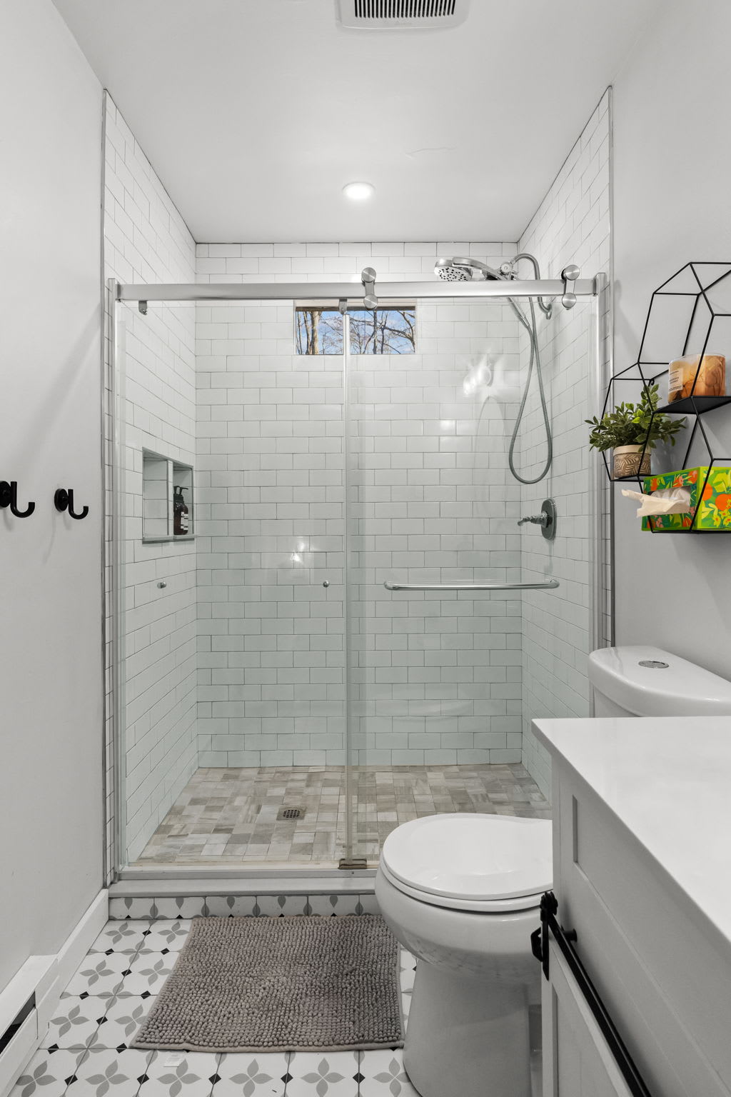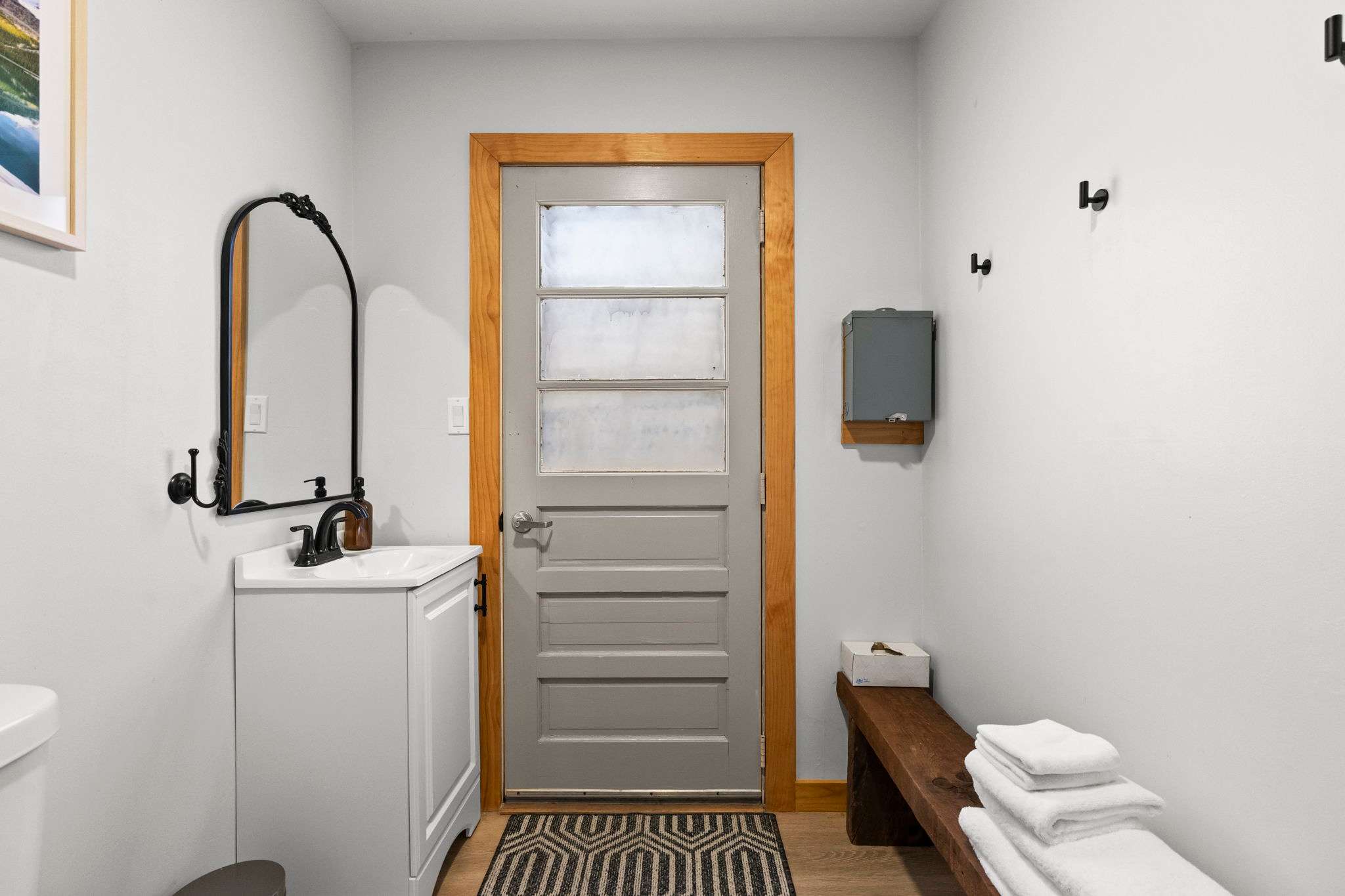 Each bedroom is thoughtfully decorated with mountain-inspired art, quilted bedding in soft greens and whites, ceiling fans, and room-darkening shades. The bunk room is perfect for kids or friends traveling together. Both bathrooms are fully updated with white subway tile walk-in showers, glass sliding doors, marble mosaic floors, black fixtures, round mirrors, and modern white vanities. π