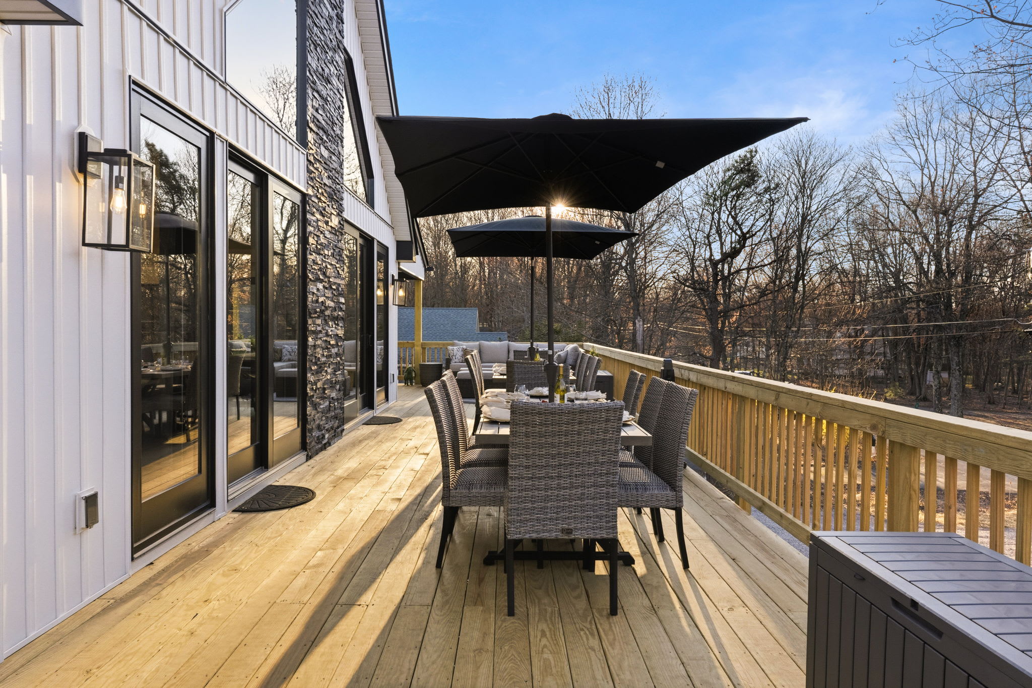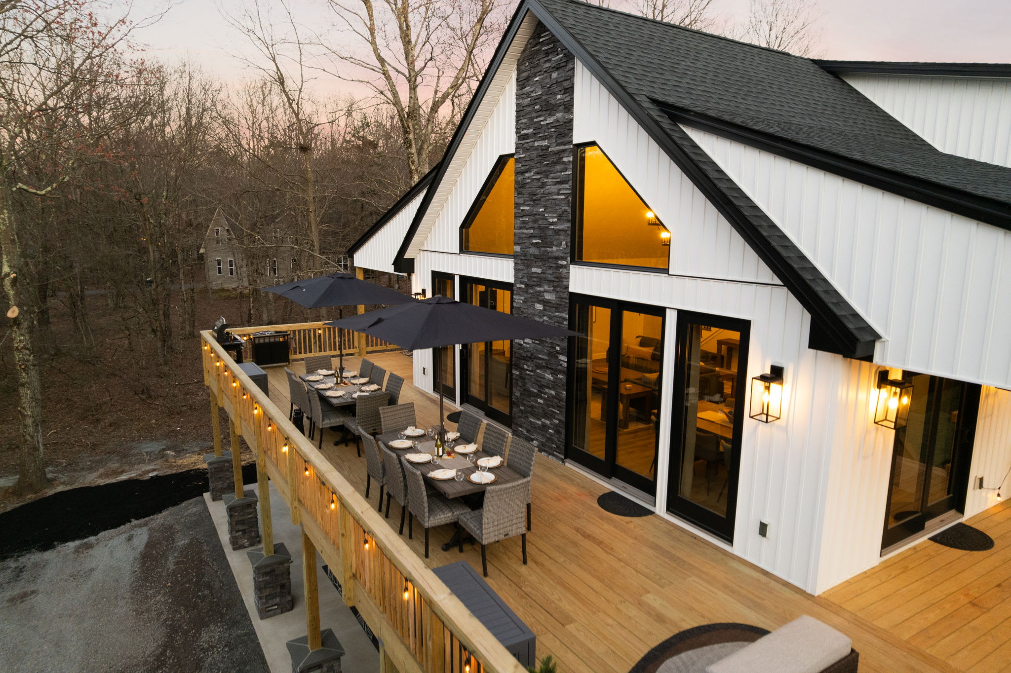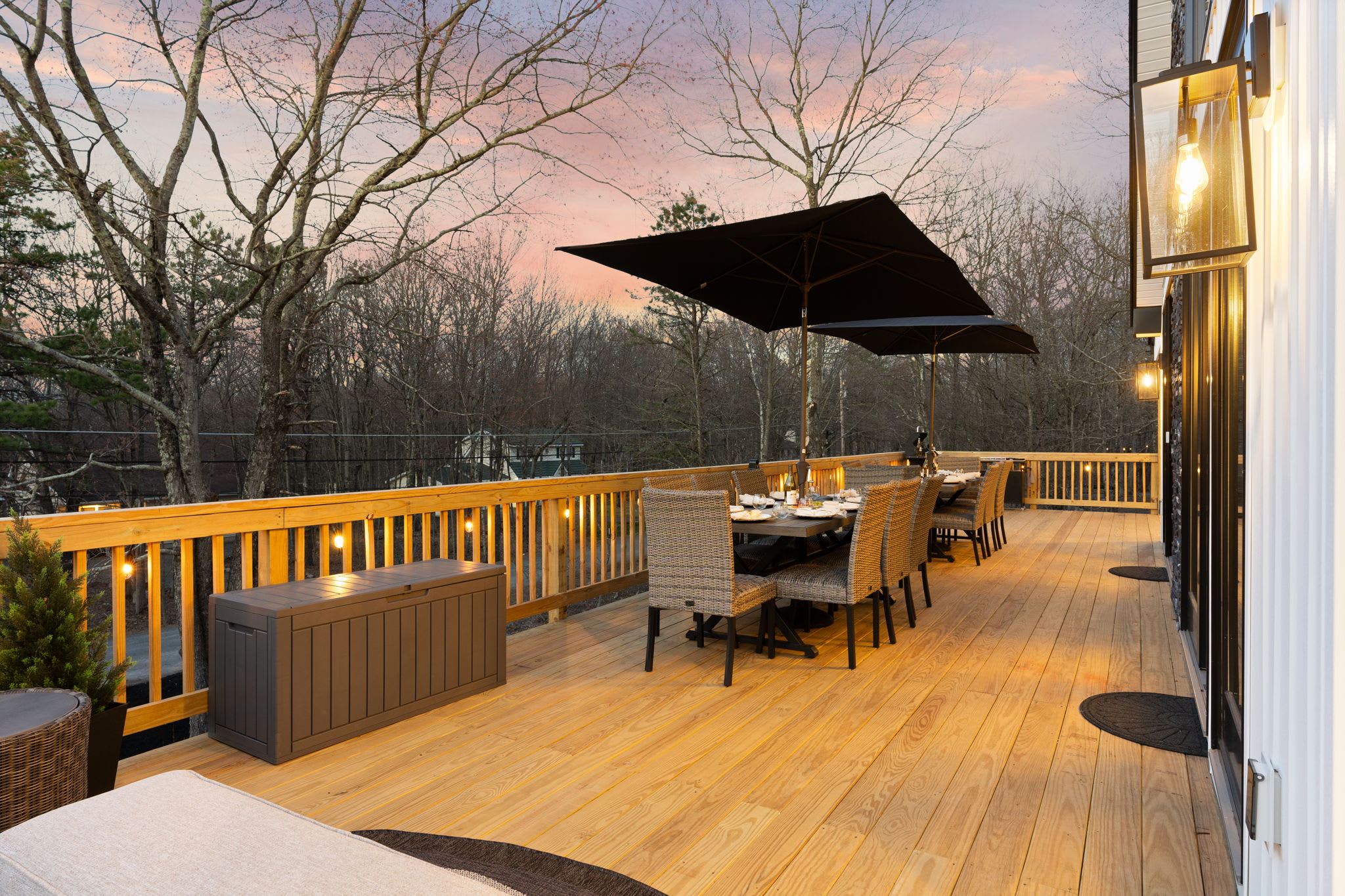 A large indoor dining table seats your group beneath the stunning chandelier, with views out to the deck. Outside, the wraparound deck features two full outdoor dining tables with umbrellas, plus a sectional lounge area and additional seating — perfect for sunset dinners and morning coffee surrounded by trees. ☕