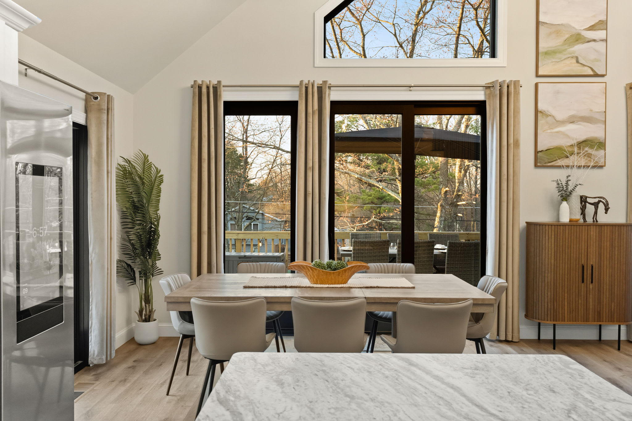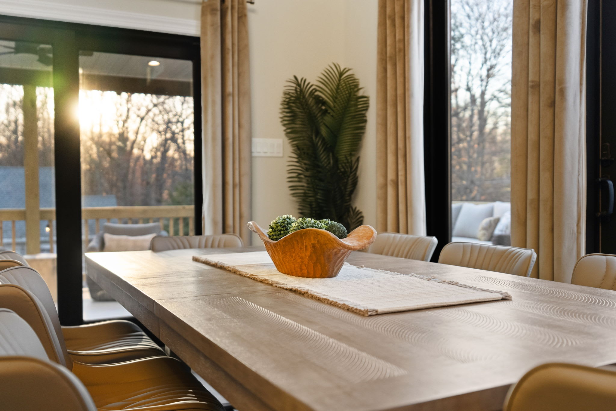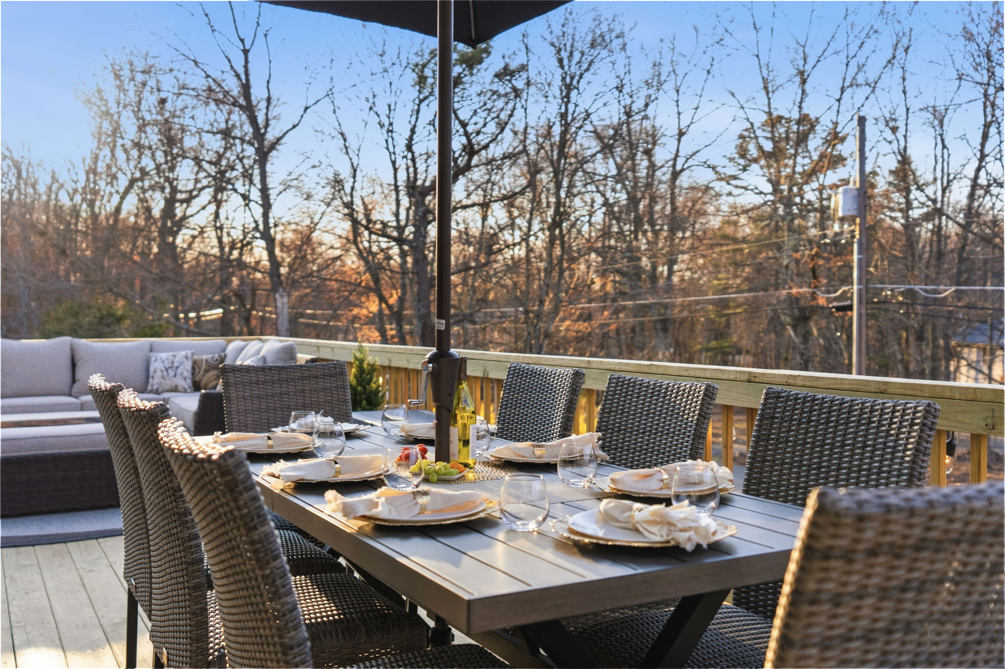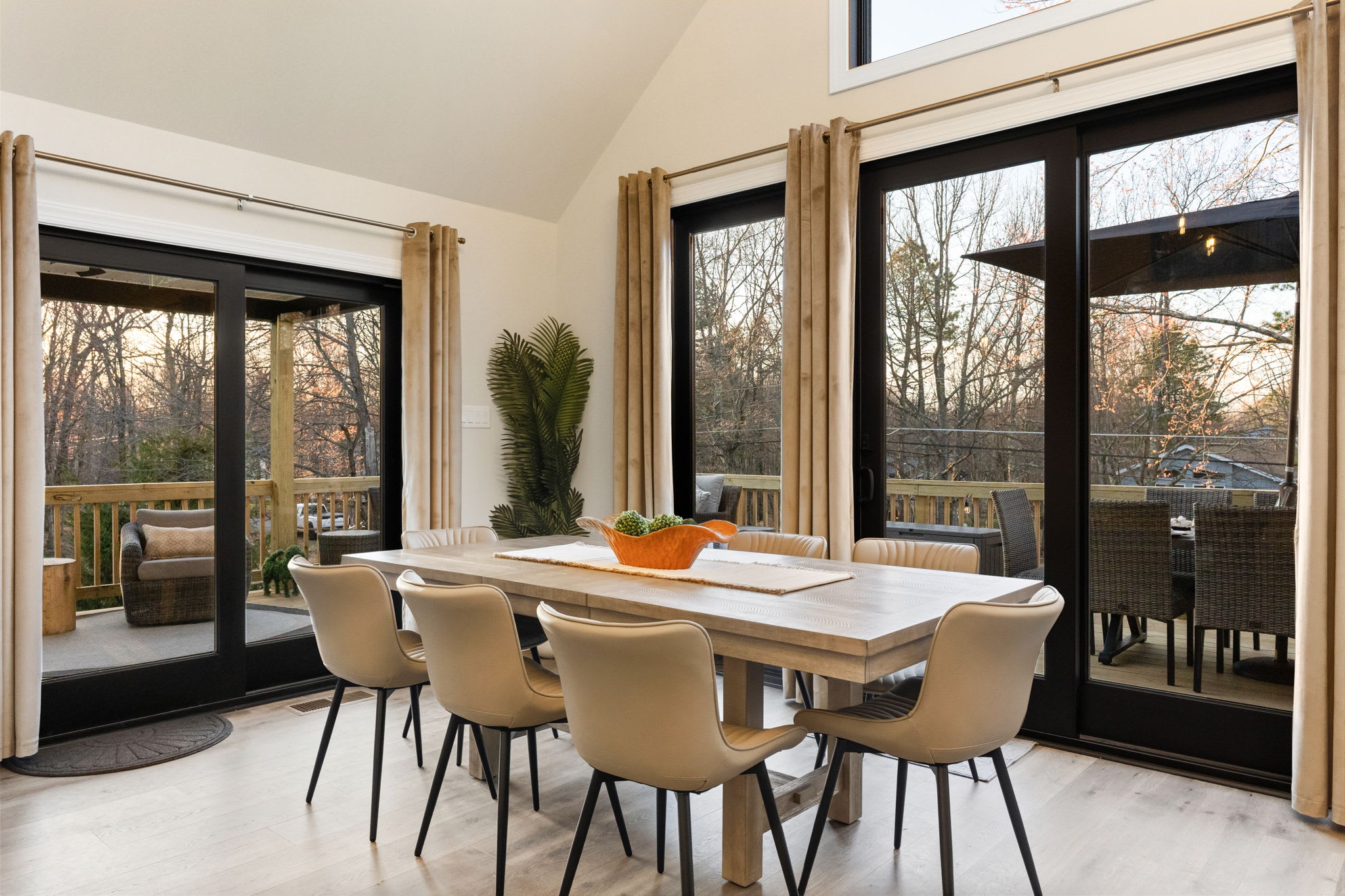 A large indoor dining table seats your group beneath the stunning chandelier, with views out to the deck. Outside, the wraparound deck features two full outdoor dining tables with umbrellas, plus a sectional lounge area and additional seating — perfect for sunset dinners and morning coffee surrounded by trees. ☕