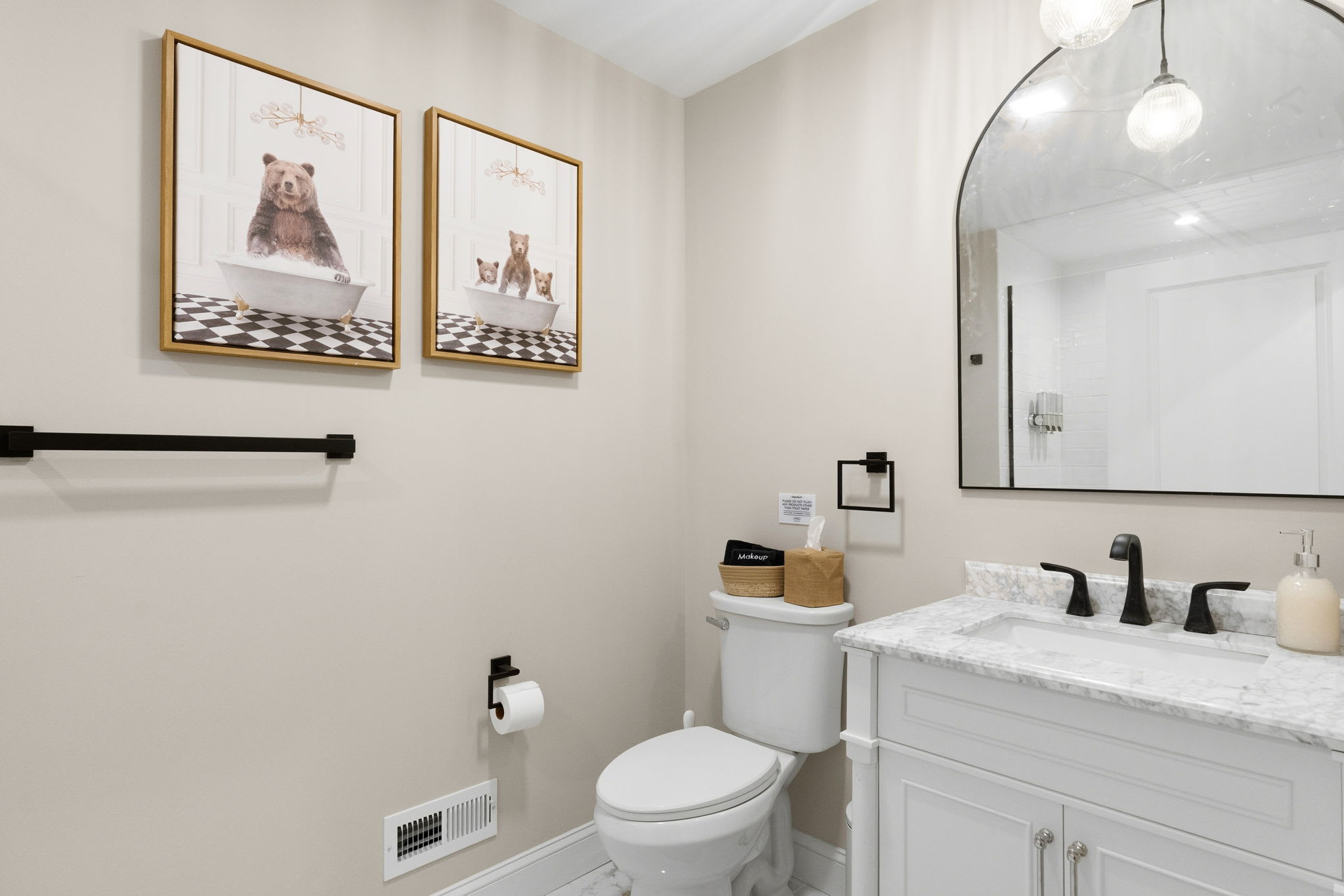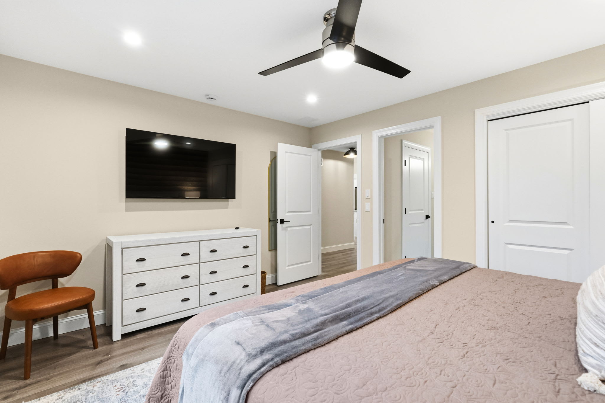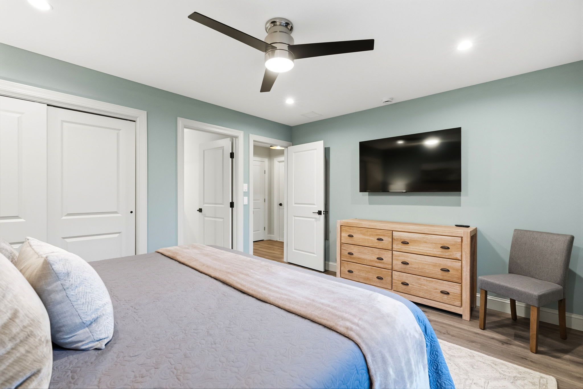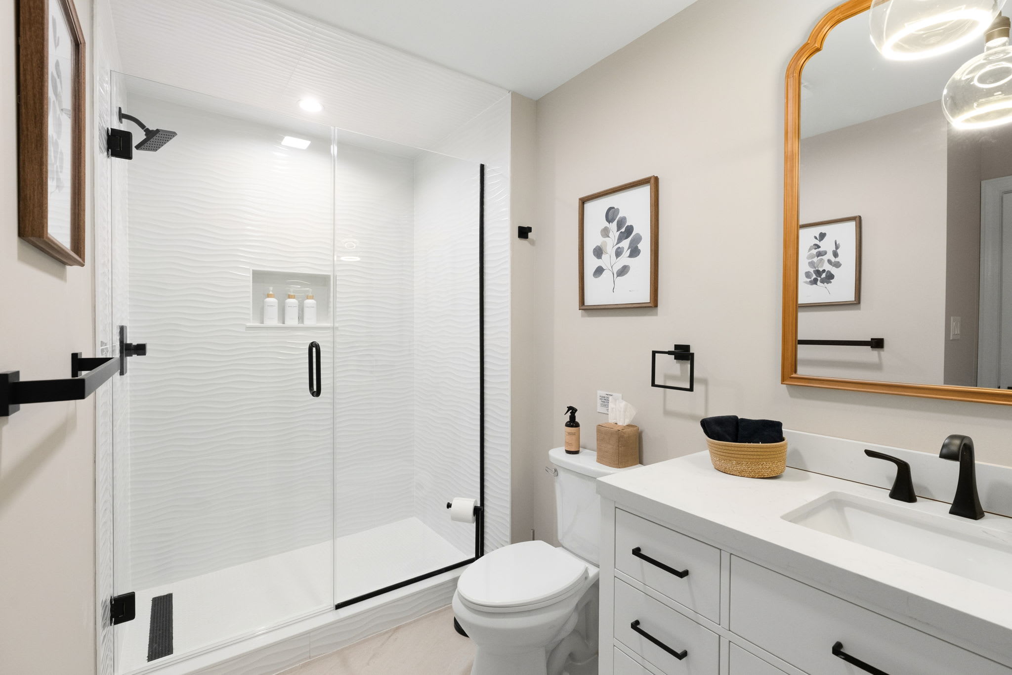 Every bedroom is uniquely designed with accent walls, quality bedding, ceiling fans, dressers, and Smart TVs. With 5 full bathrooms spread across all three floors, there's never a wait. Bathrooms feature modern vanities, black hardware, glass walk-in showers, and marble tile floors. 🛁