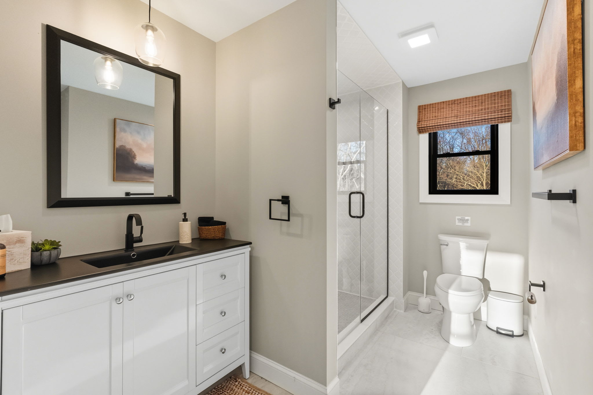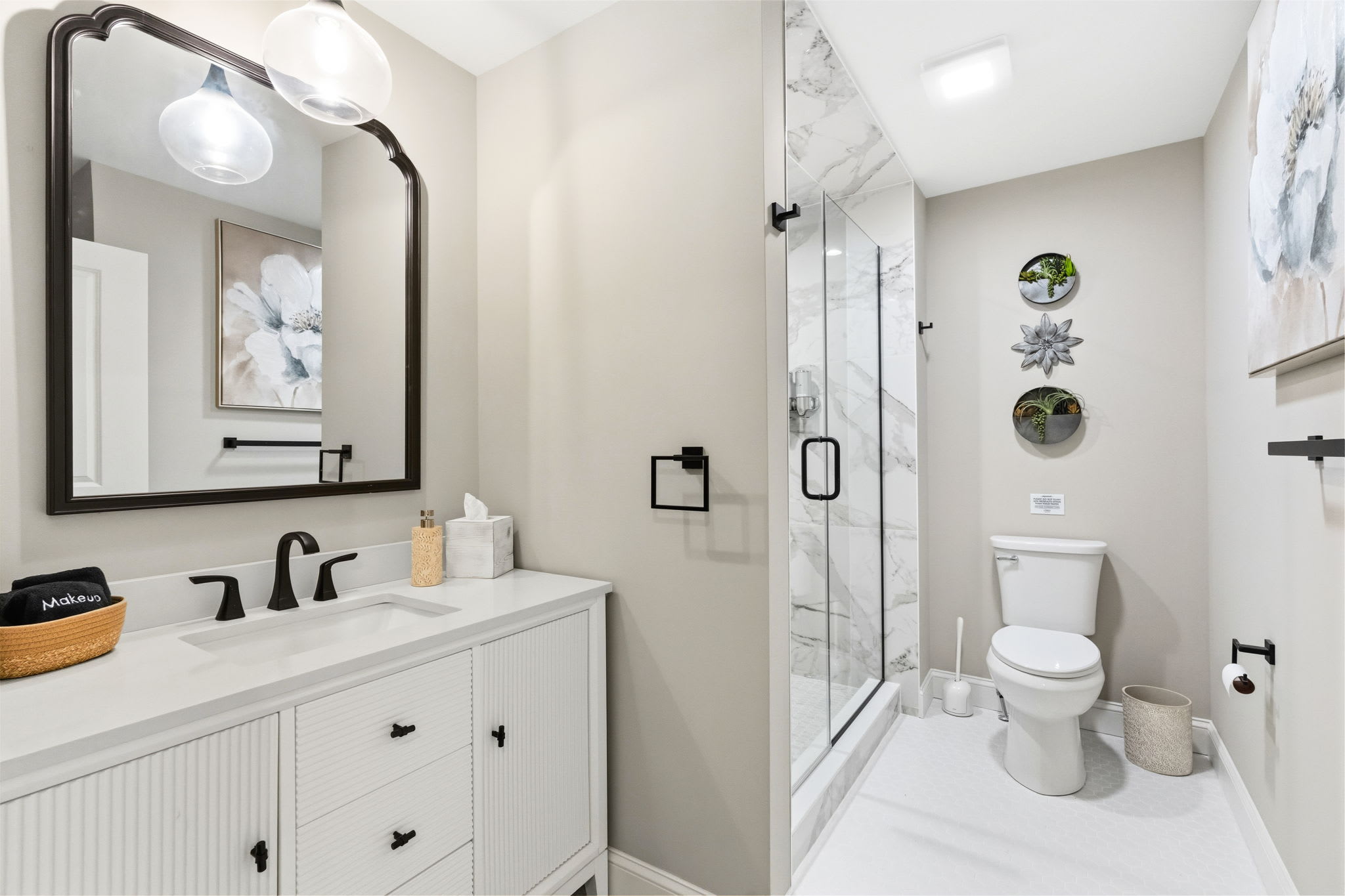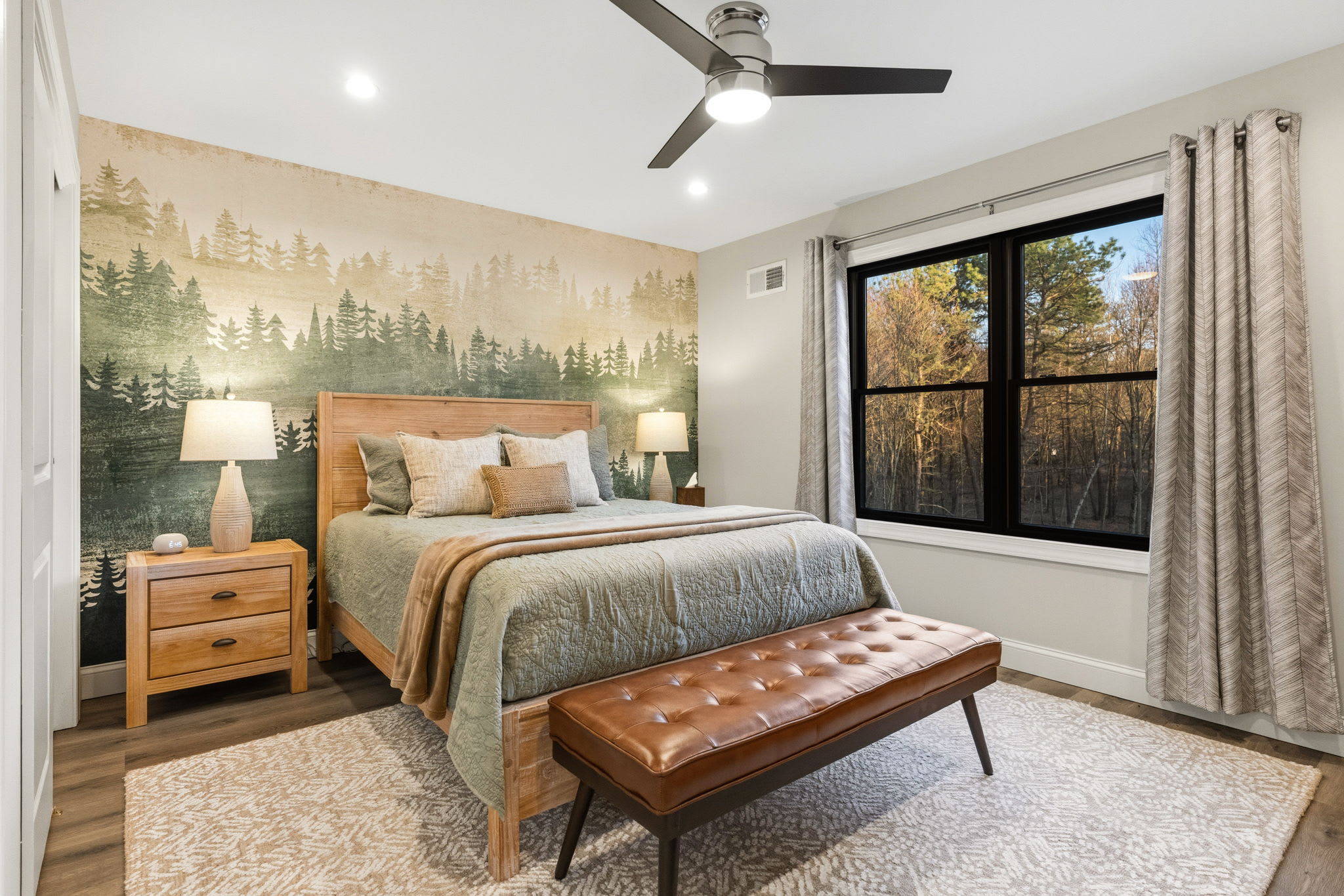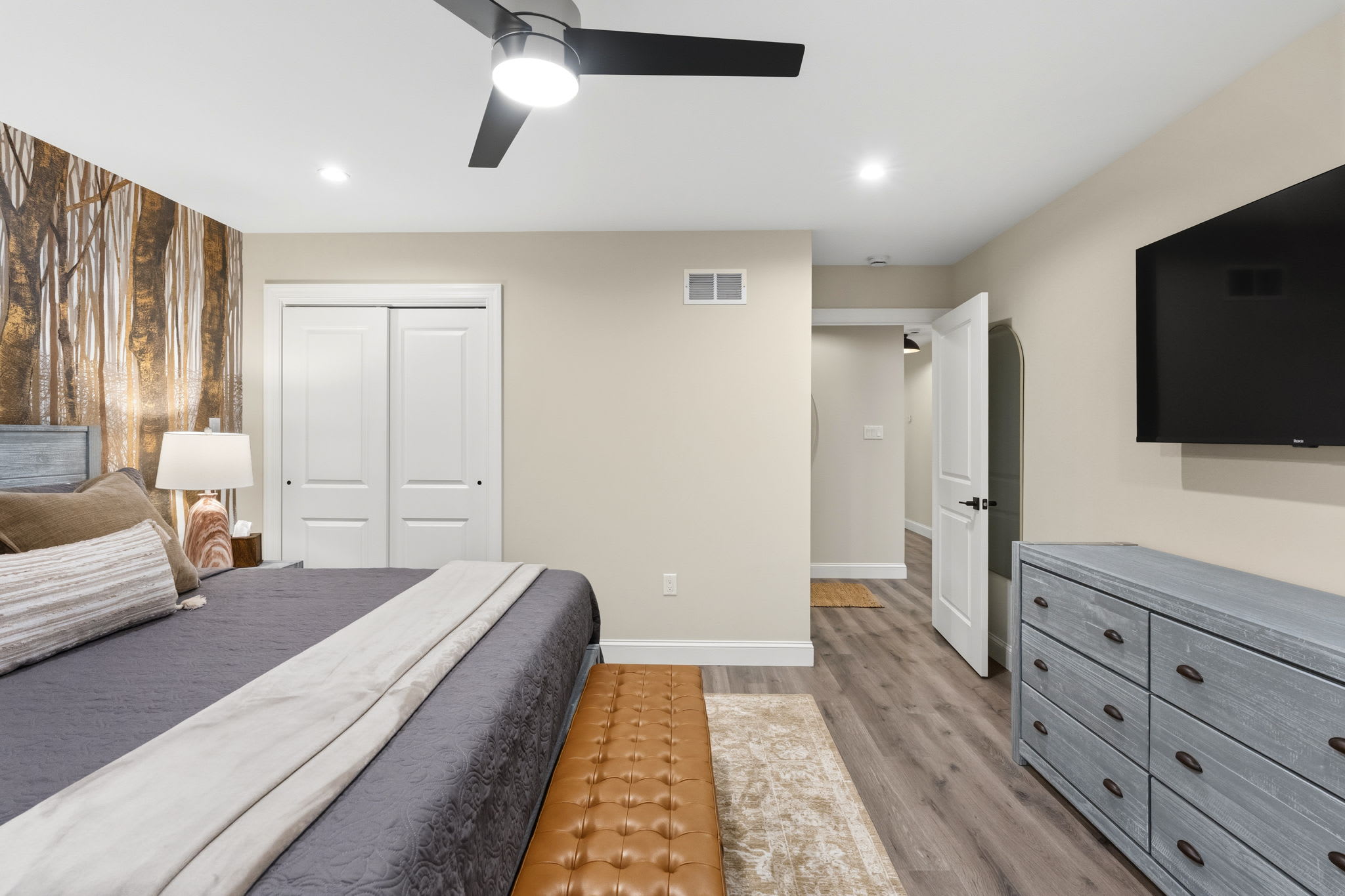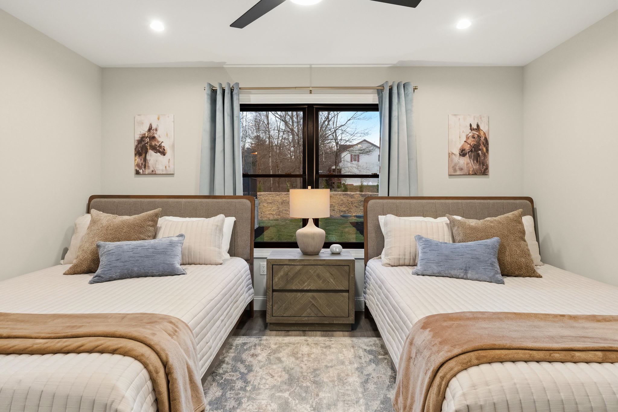 Every bedroom is uniquely designed with accent walls, quality bedding, ceiling fans, dressers, and Smart TVs. With 5 full bathrooms spread across all three floors, there's never a wait. Bathrooms feature modern vanities, black hardware, glass walk-in showers, and marble tile floors. 🛁