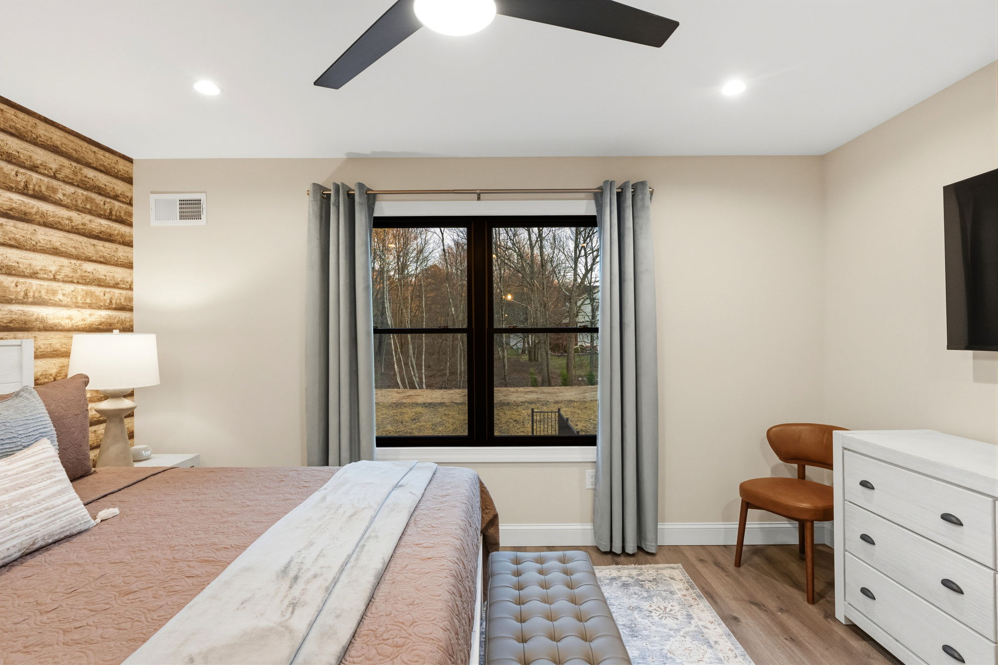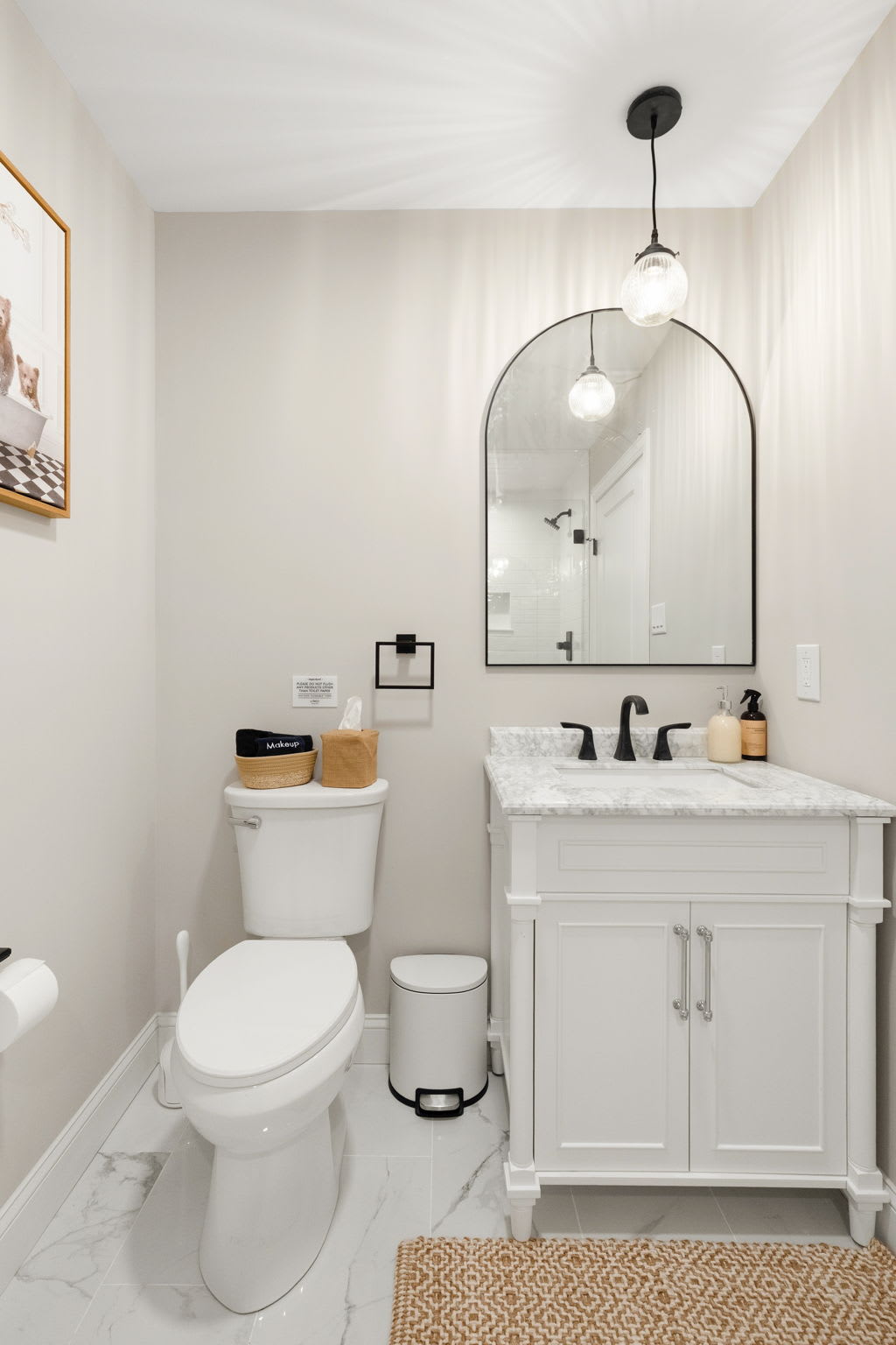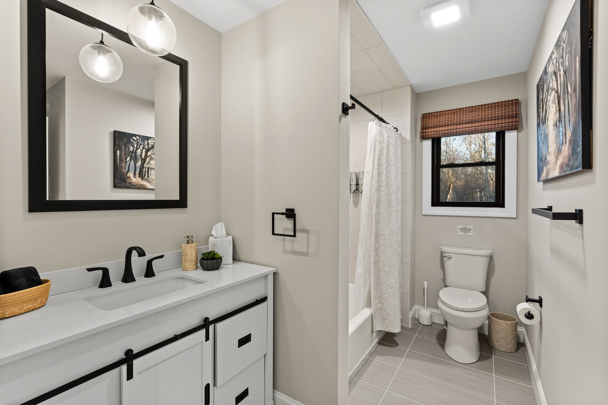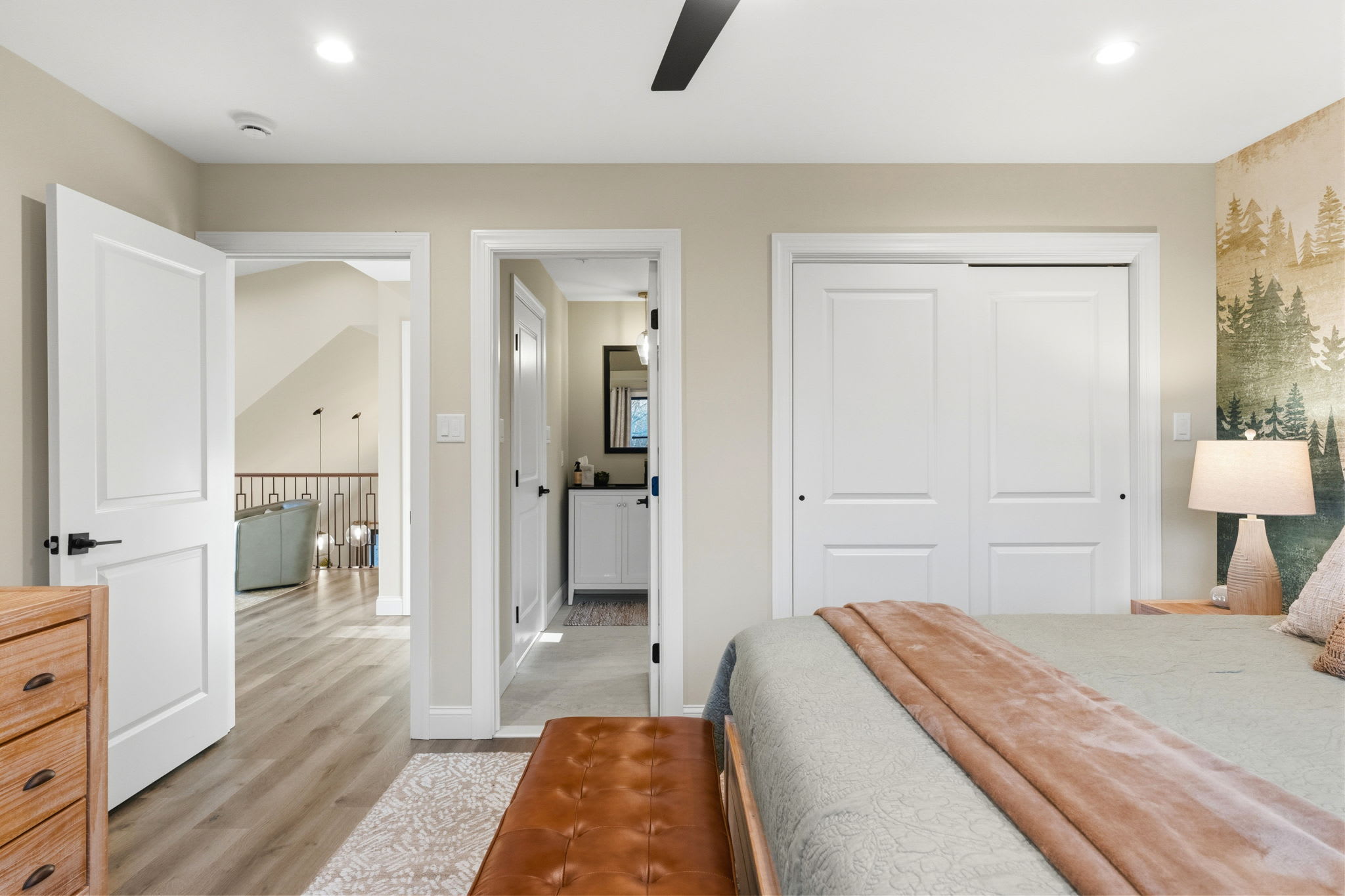 Every bedroom is uniquely designed with accent walls, quality bedding, ceiling fans, dressers, and Smart TVs. With 5 full bathrooms spread across all three floors, there's never a wait. Bathrooms feature modern vanities, black hardware, glass walk-in showers, and marble tile floors. 🛁