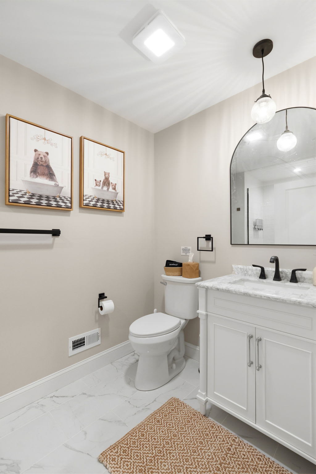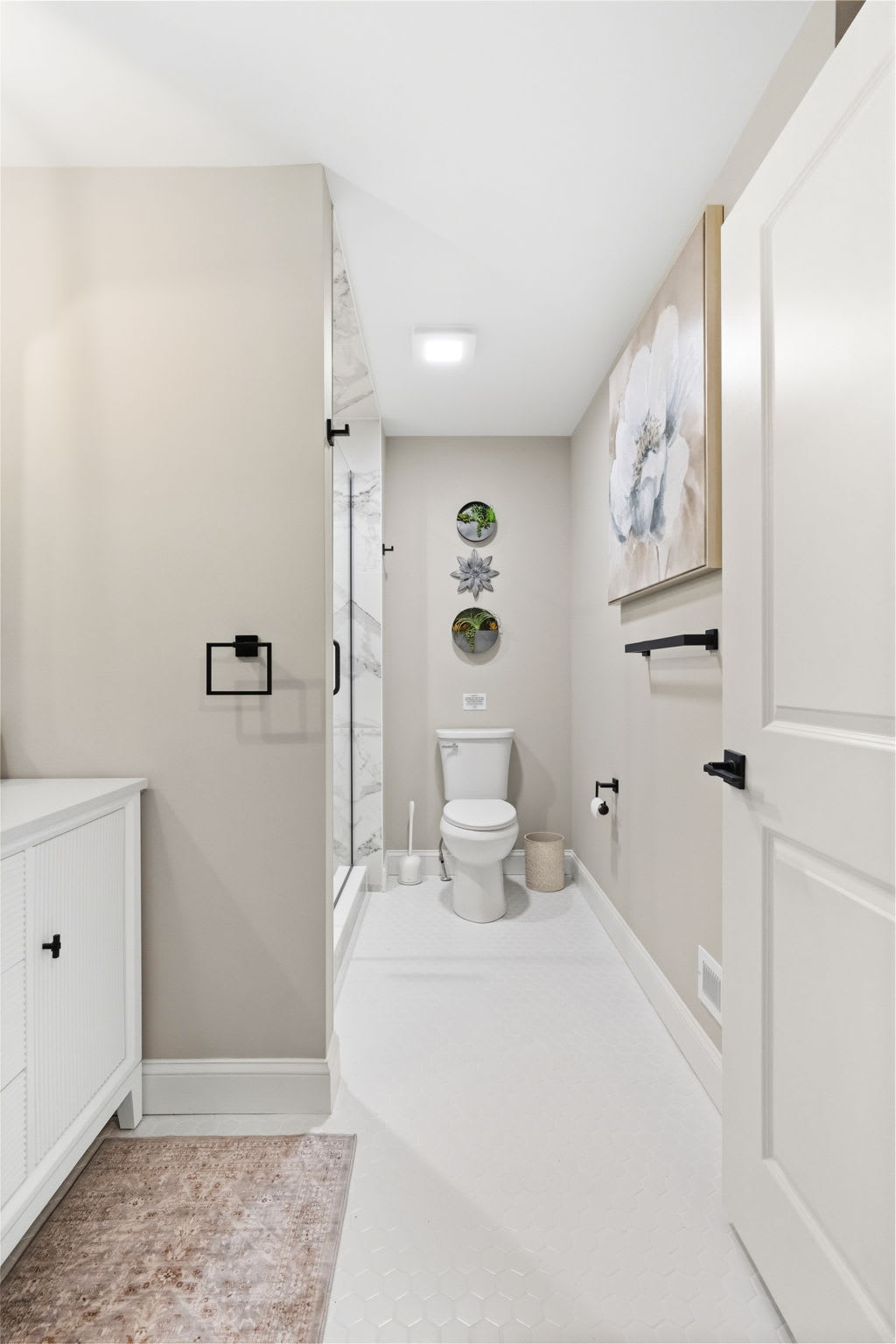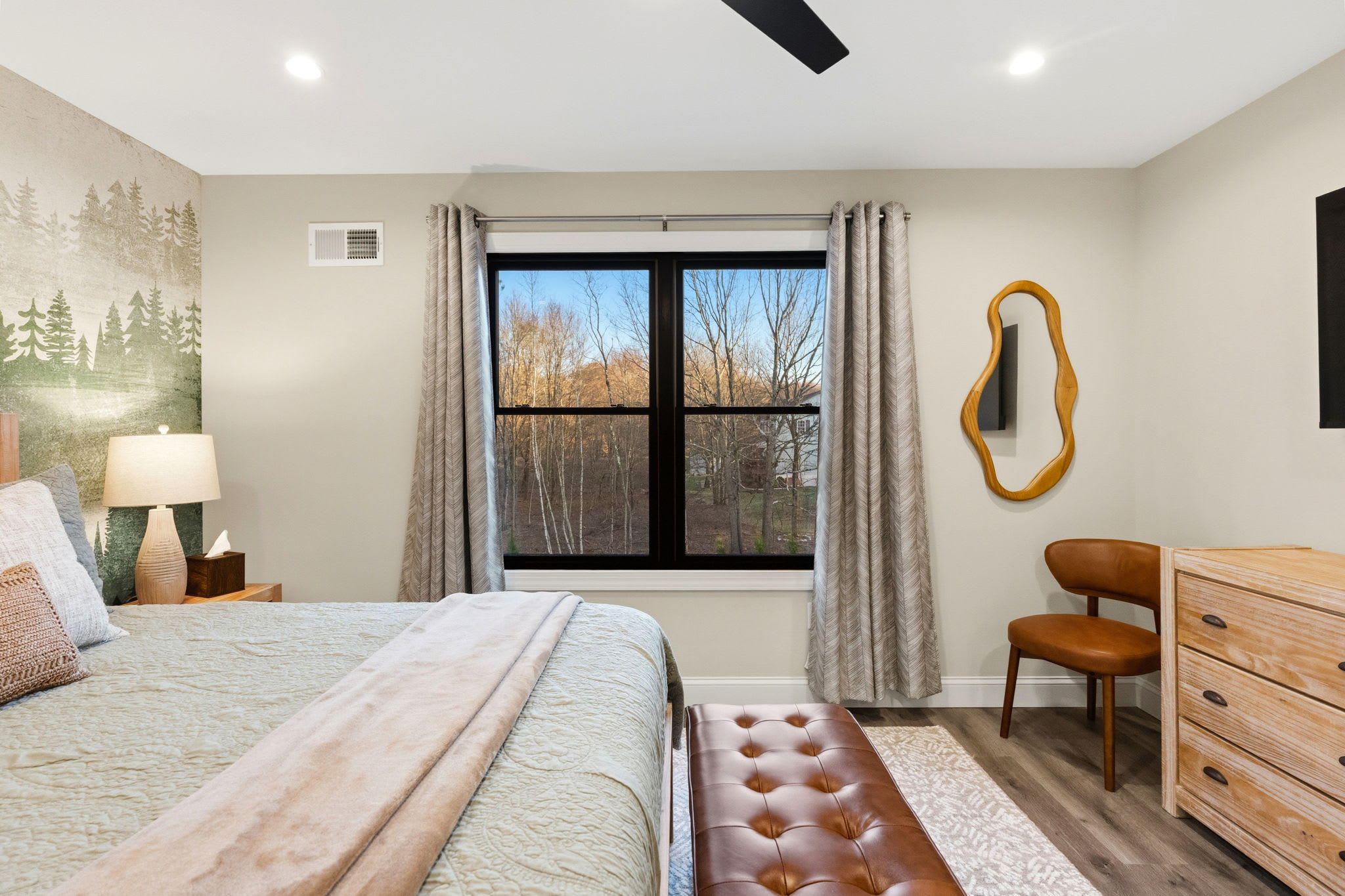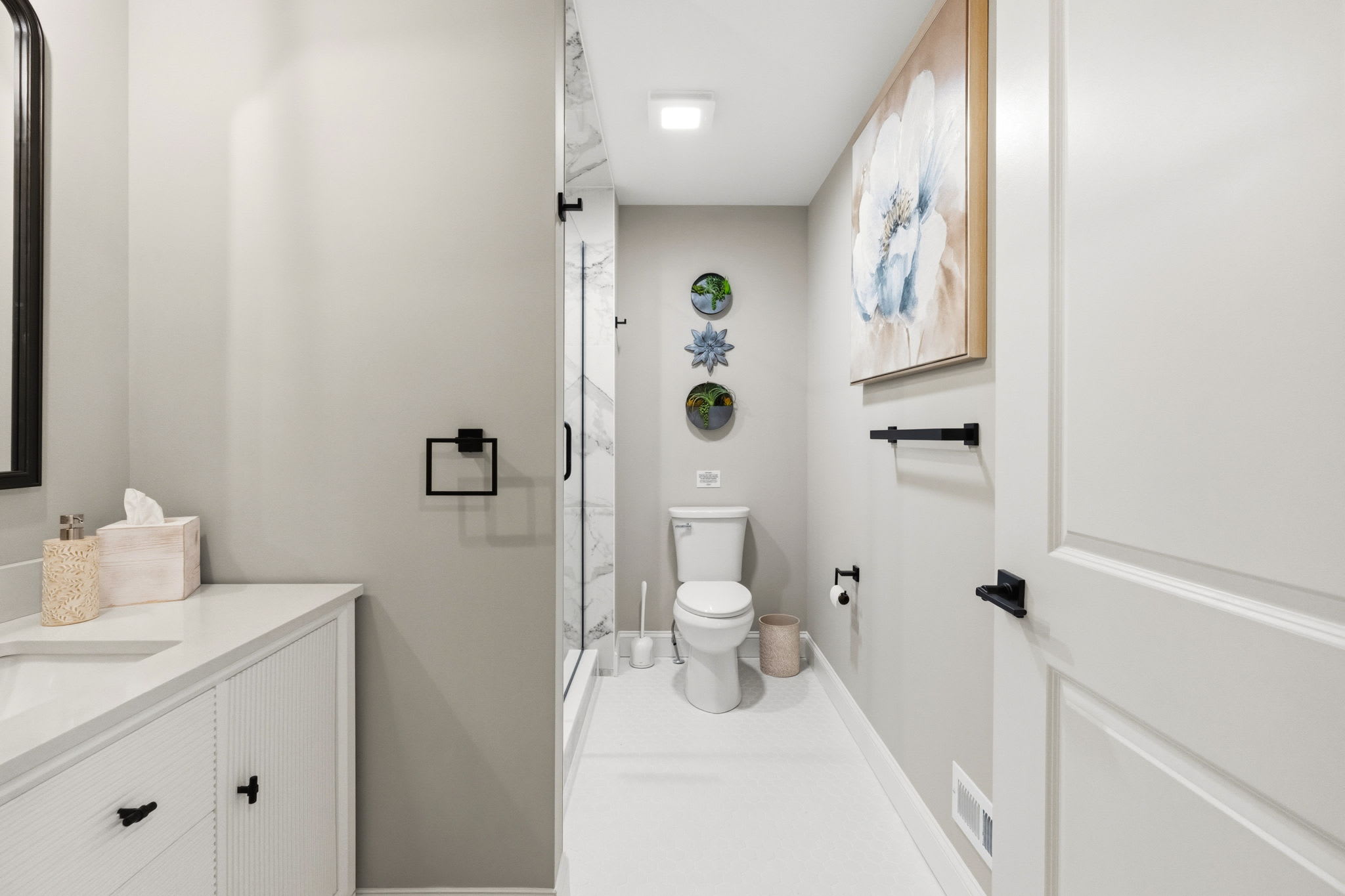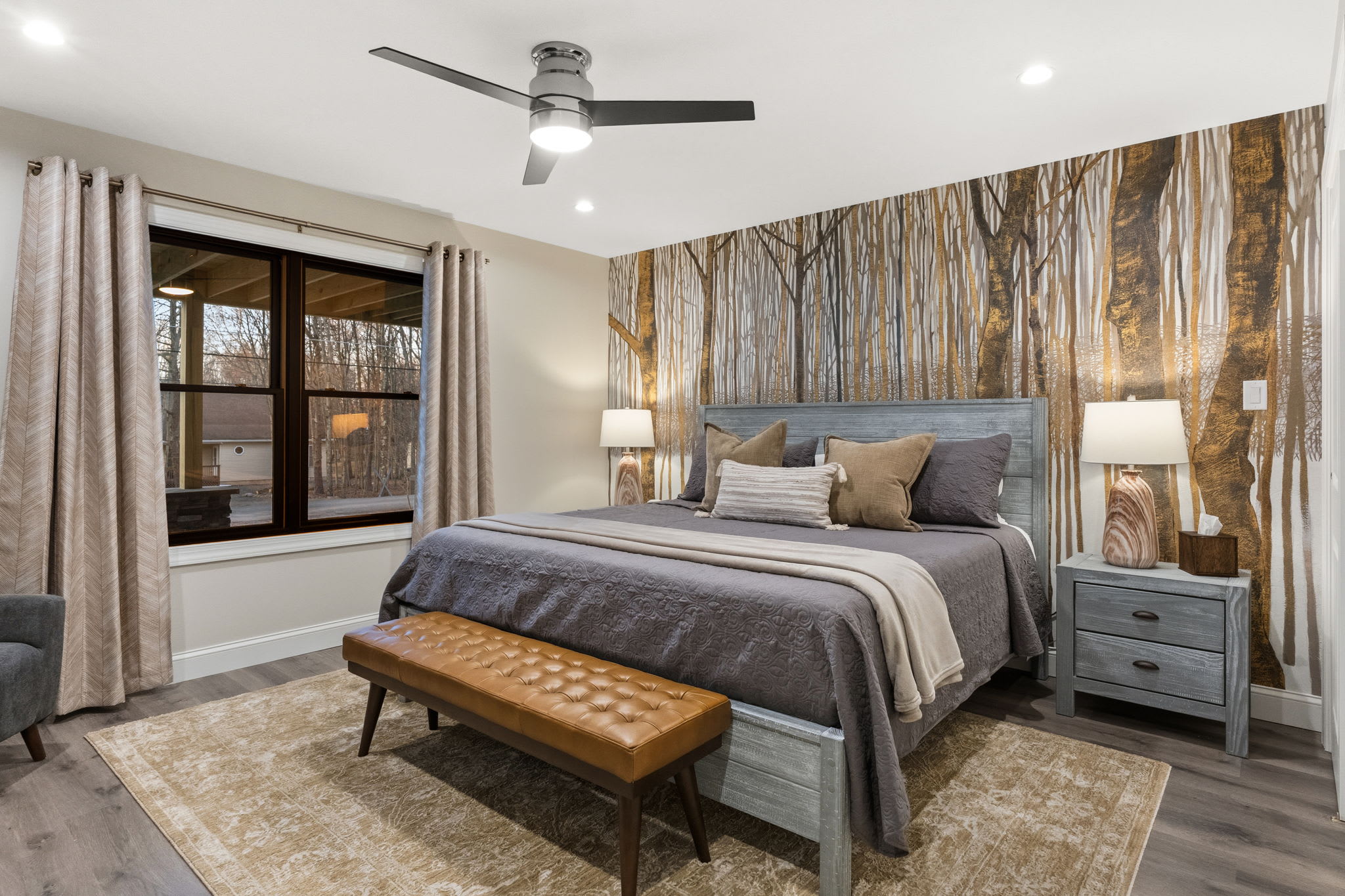 Every bedroom is uniquely designed with accent walls, quality bedding, ceiling fans, dressers, and Smart TVs. With 5 full bathrooms spread across all three floors, there's never a wait. Bathrooms feature modern vanities, black hardware, glass walk-in showers, and marble tile floors. 🛁