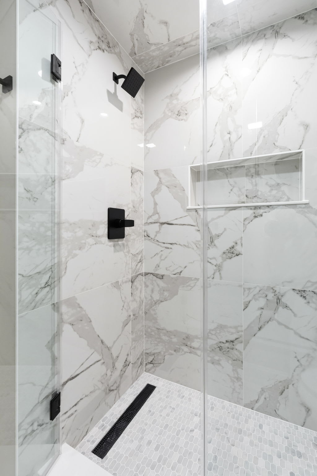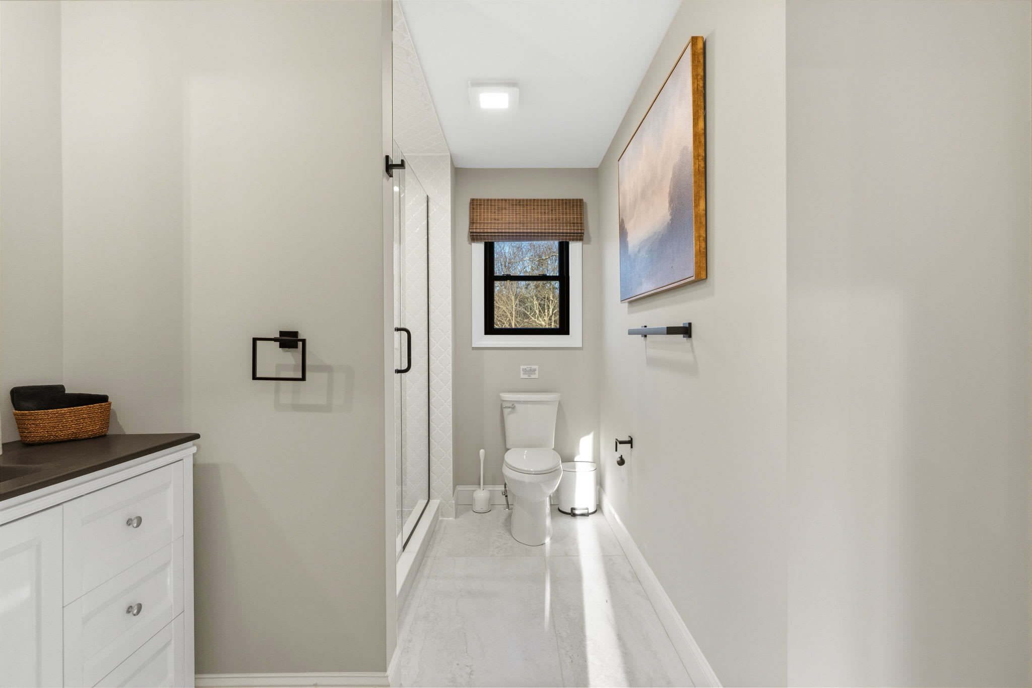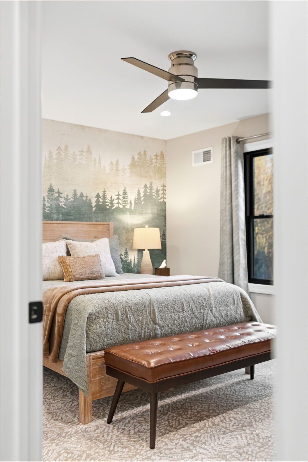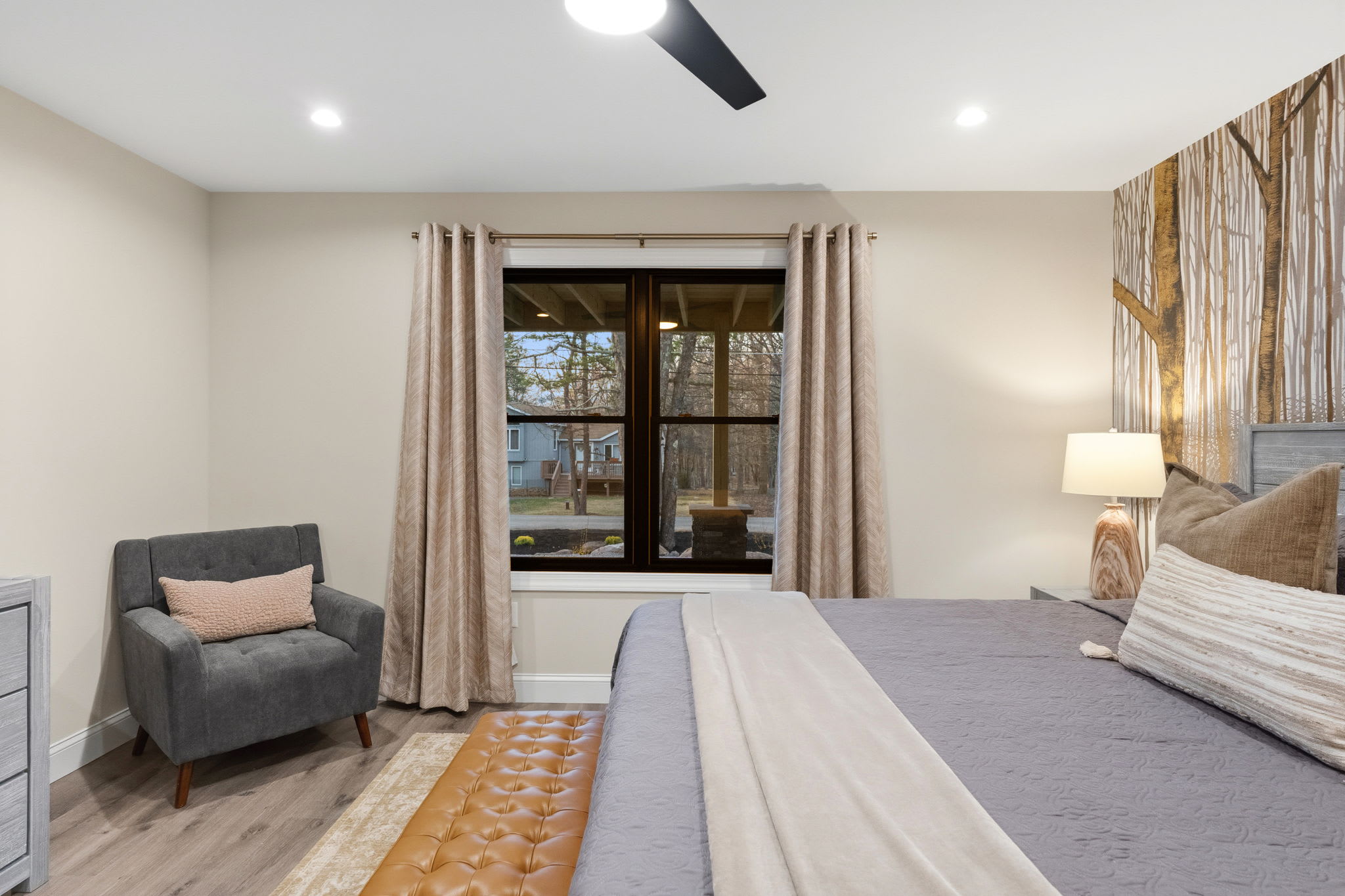 Every bedroom is uniquely designed with accent walls, quality bedding, ceiling fans, dressers, and Smart TVs. With 5 full bathrooms spread across all three floors, there's never a wait. Bathrooms feature modern vanities, black hardware, glass walk-in showers, and marble tile floors. 🛁