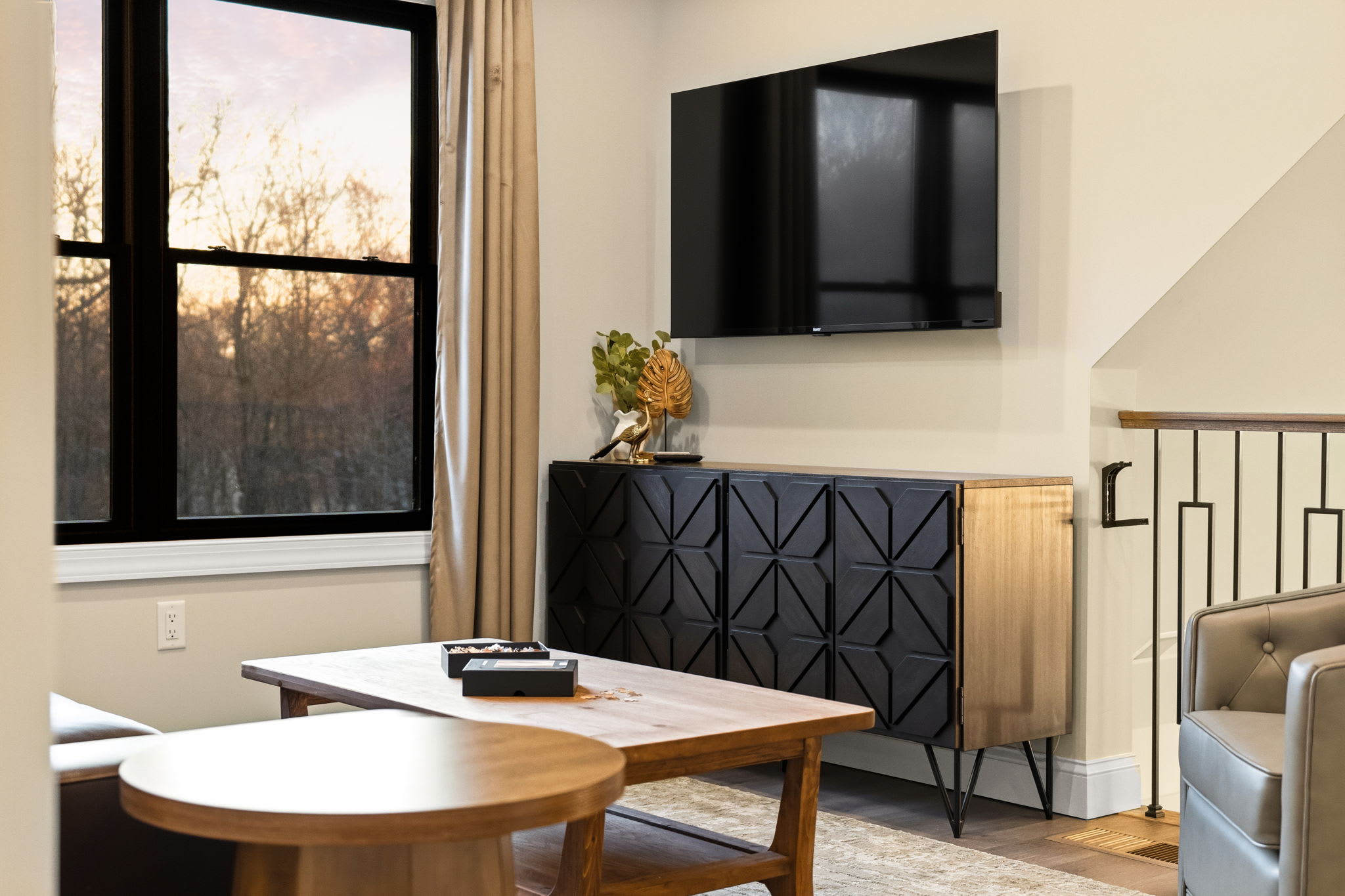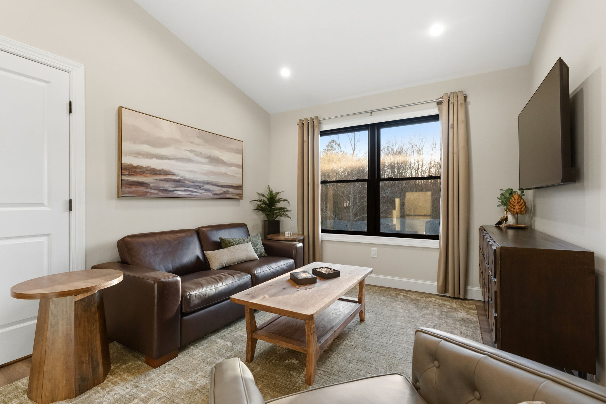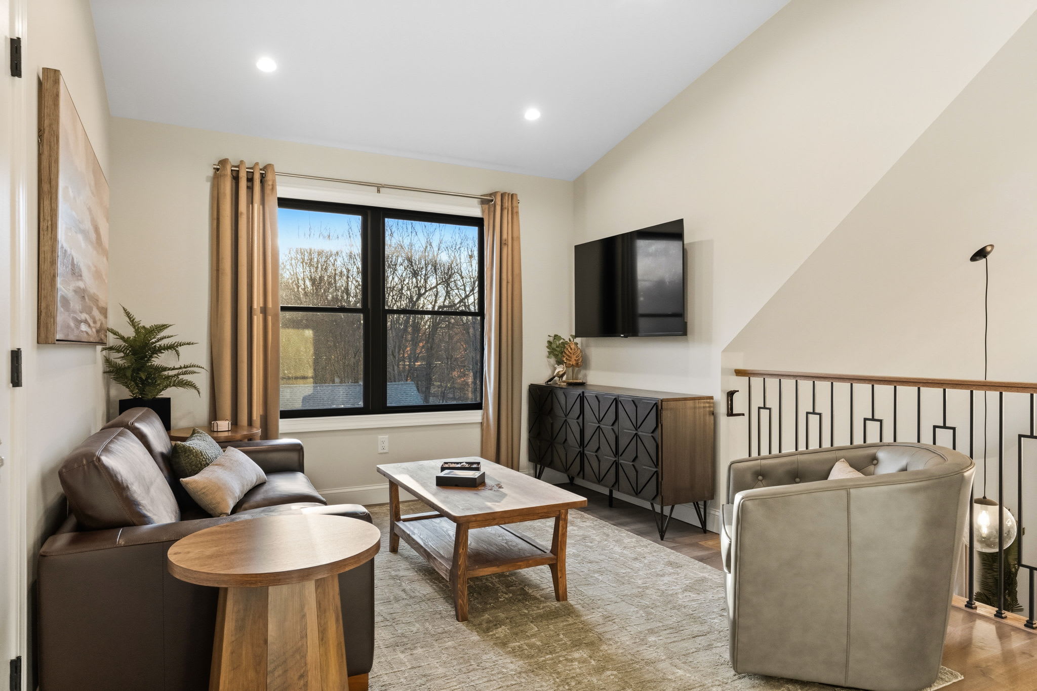 The third floor features a cozy loft sitting area with a leather sofa, accent chair, and Smart TV — a great secondary hangout spot for kids, teens, or anyone looking for a quieter space away from the main living area.