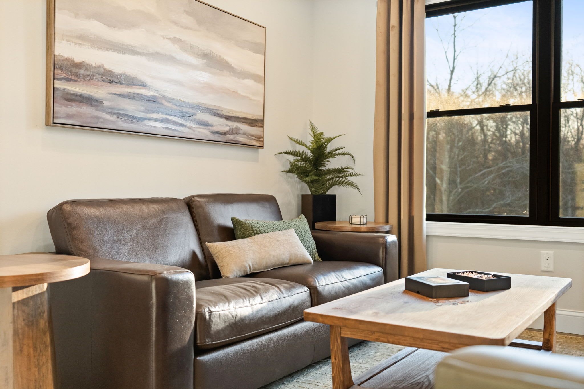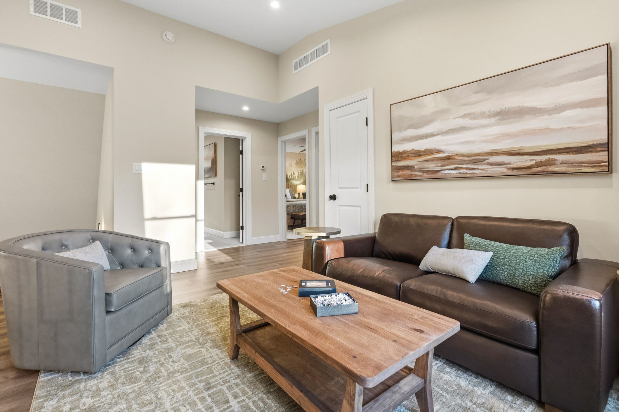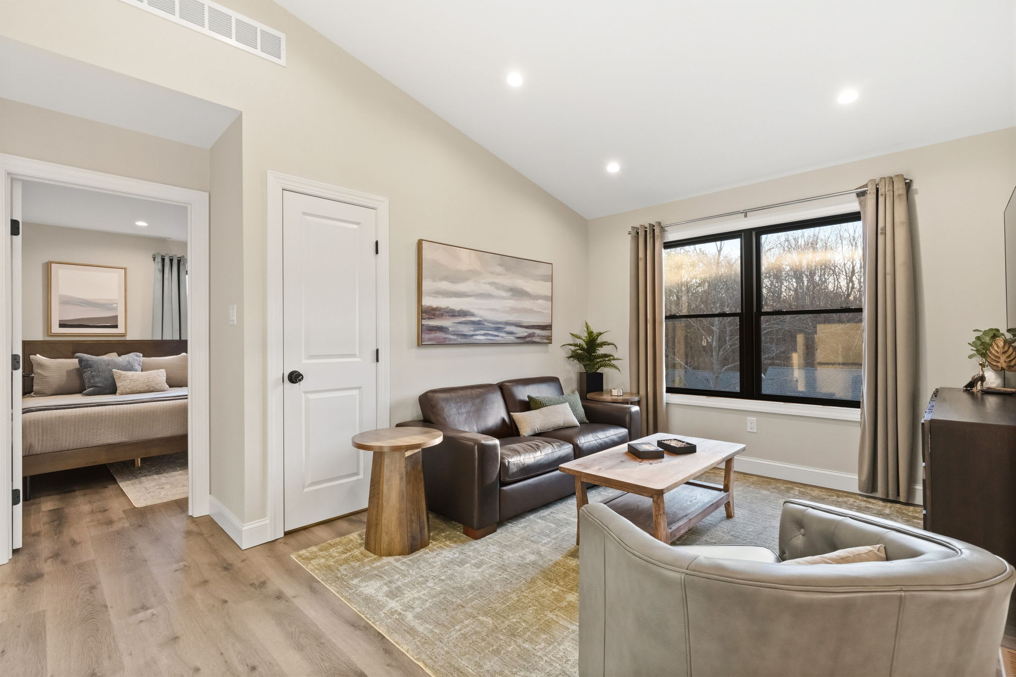 The third floor features a cozy loft sitting area with a leather sofa, accent chair, and Smart TV — a great secondary hangout spot for kids, teens, or anyone looking for a quieter space away from the main living area.