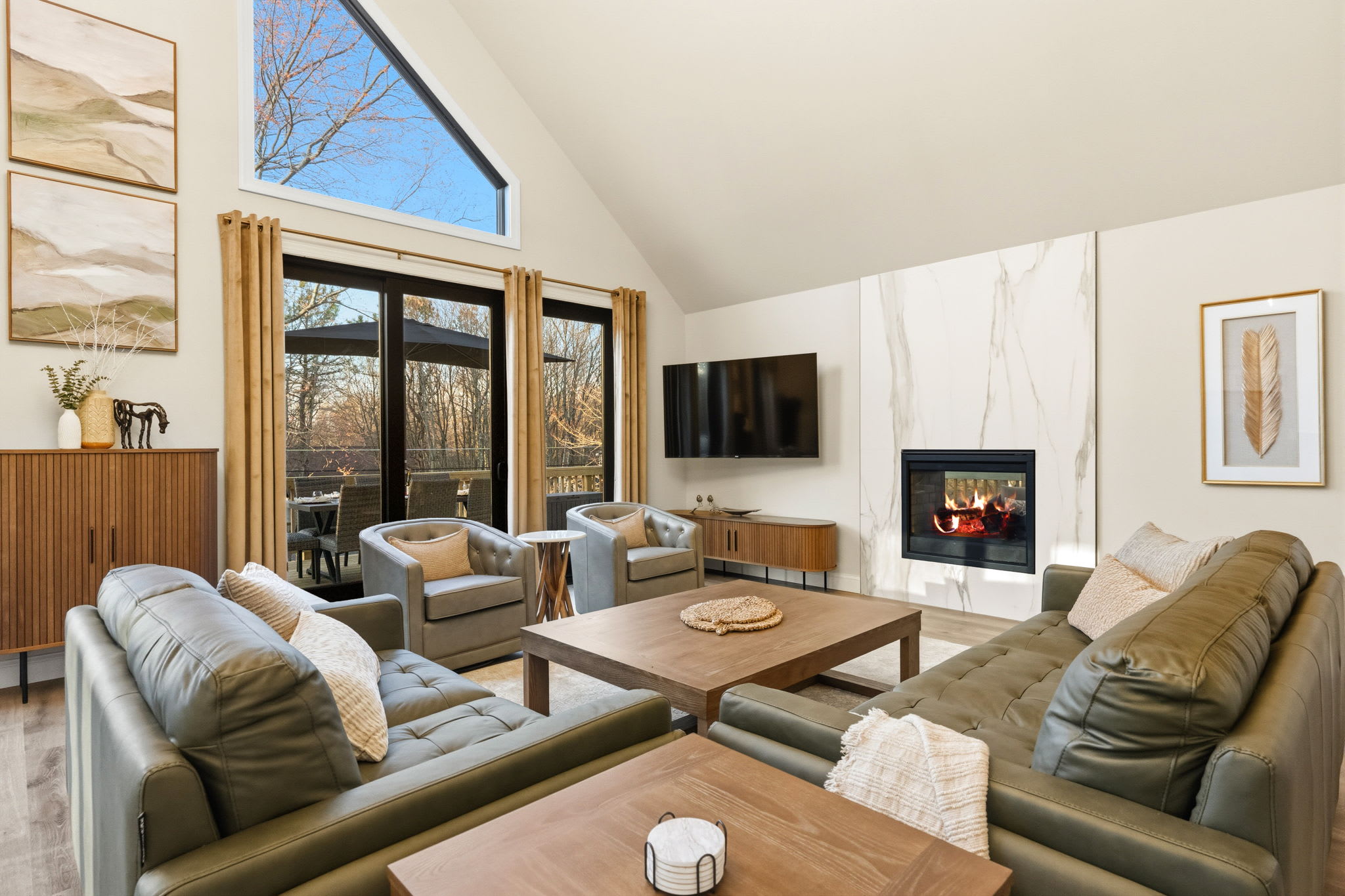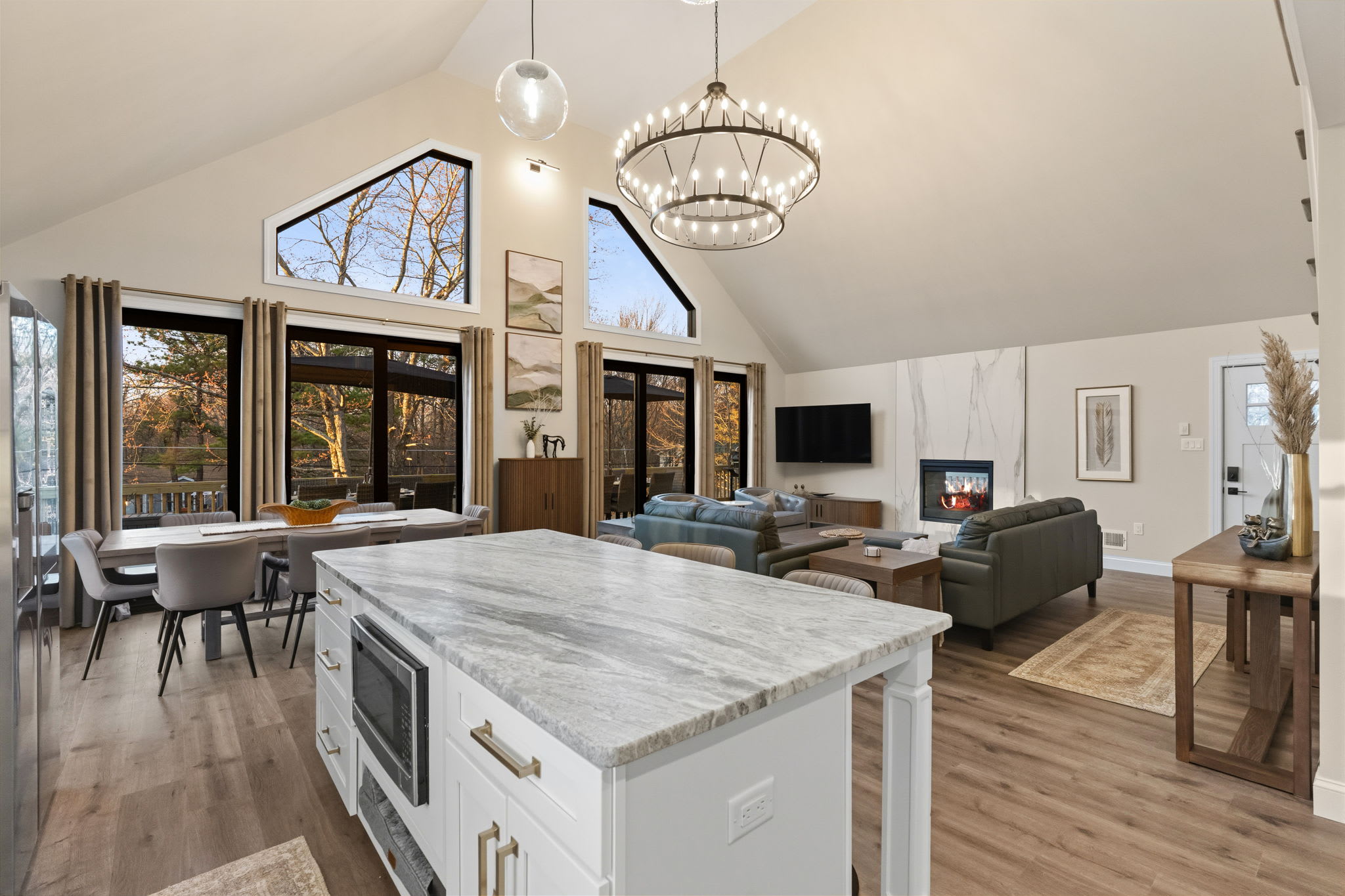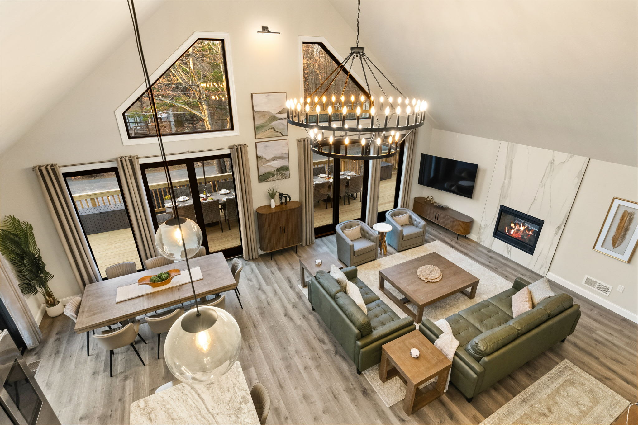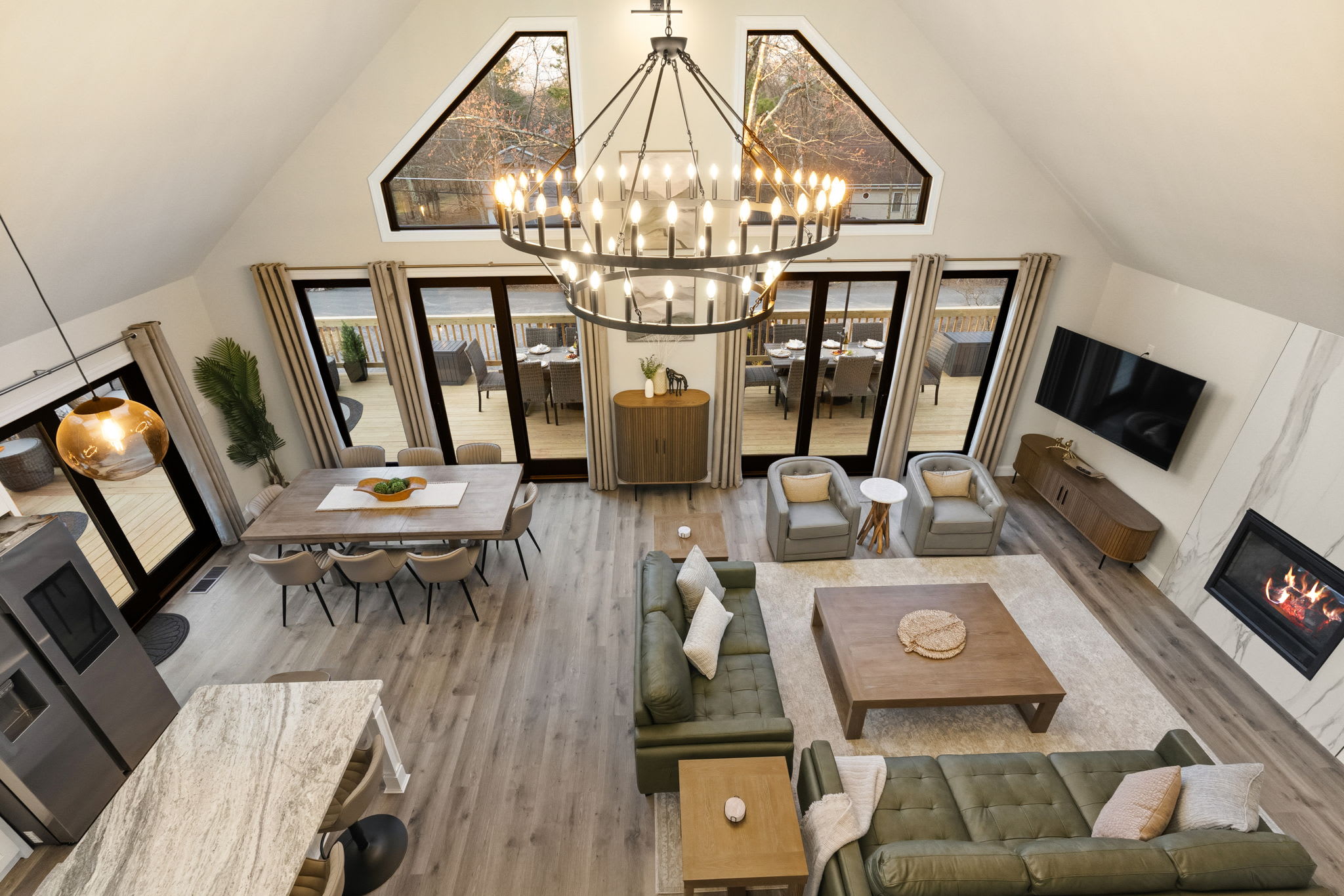 Step inside to soaring vaulted ceilings, a statement chandelier, and a wide-open floor plan that connects the living room, dining area, and chef's kitchen in one breathtaking space. The living room features plush leather seating, a marble-surround propane fireplace that can be enjoyed indoor and outdoors, a large wall-mounted Smart TV, and floor-to-ceiling sliding glass doors that open onto the expansive wraparound deck. Natural light pours in through dramatic peaked windows, filling the home with warmth all day long.