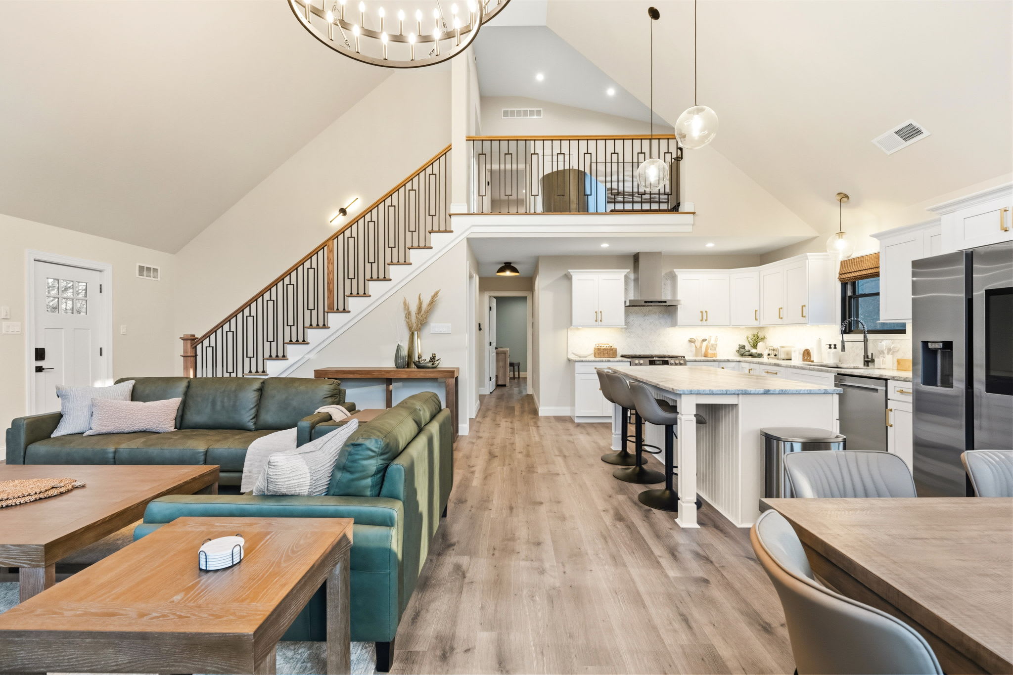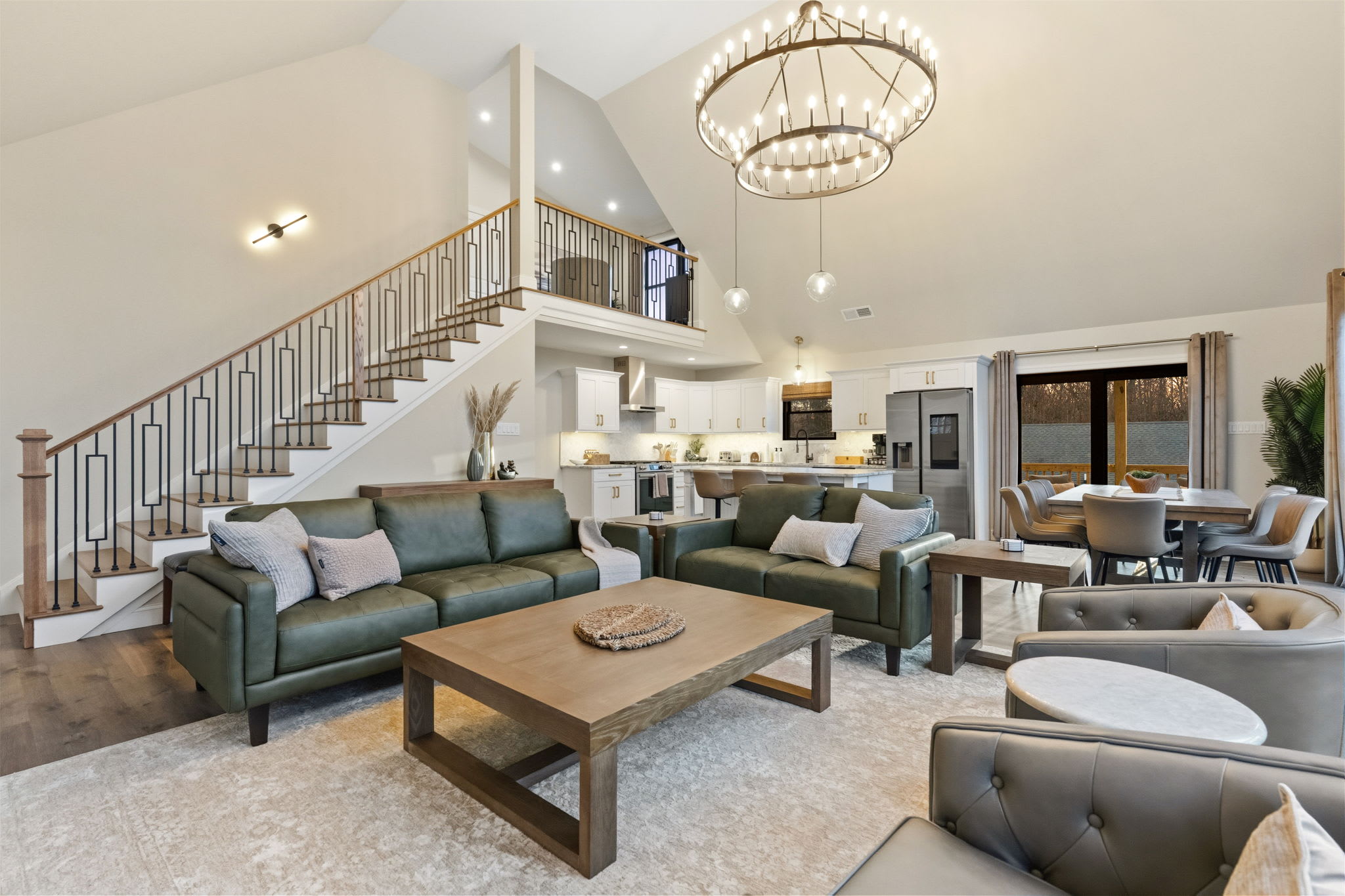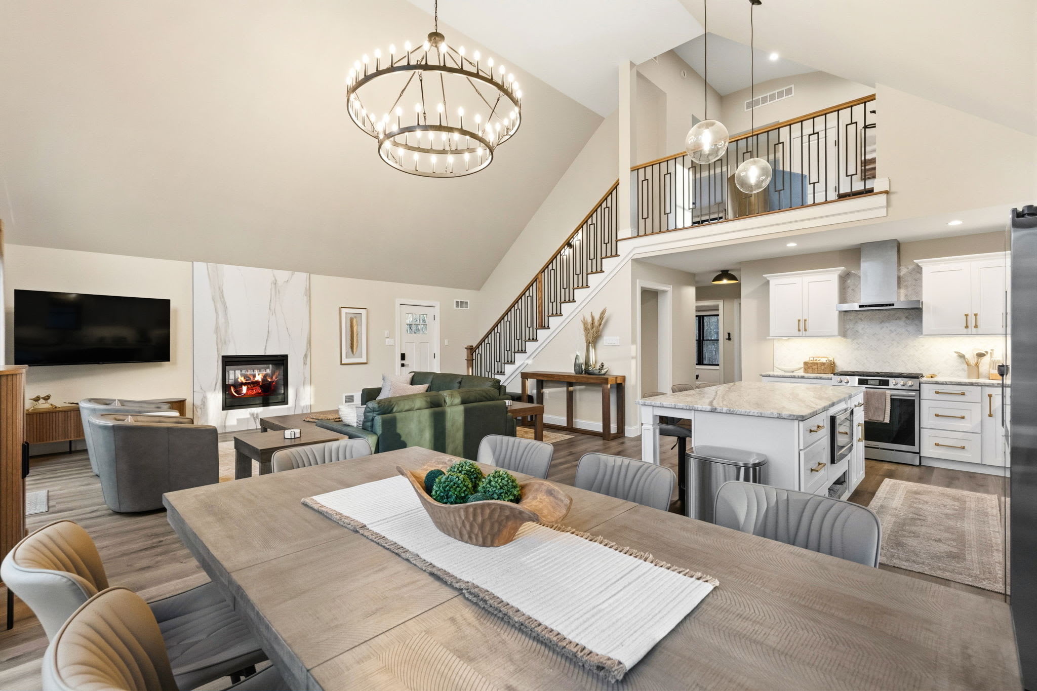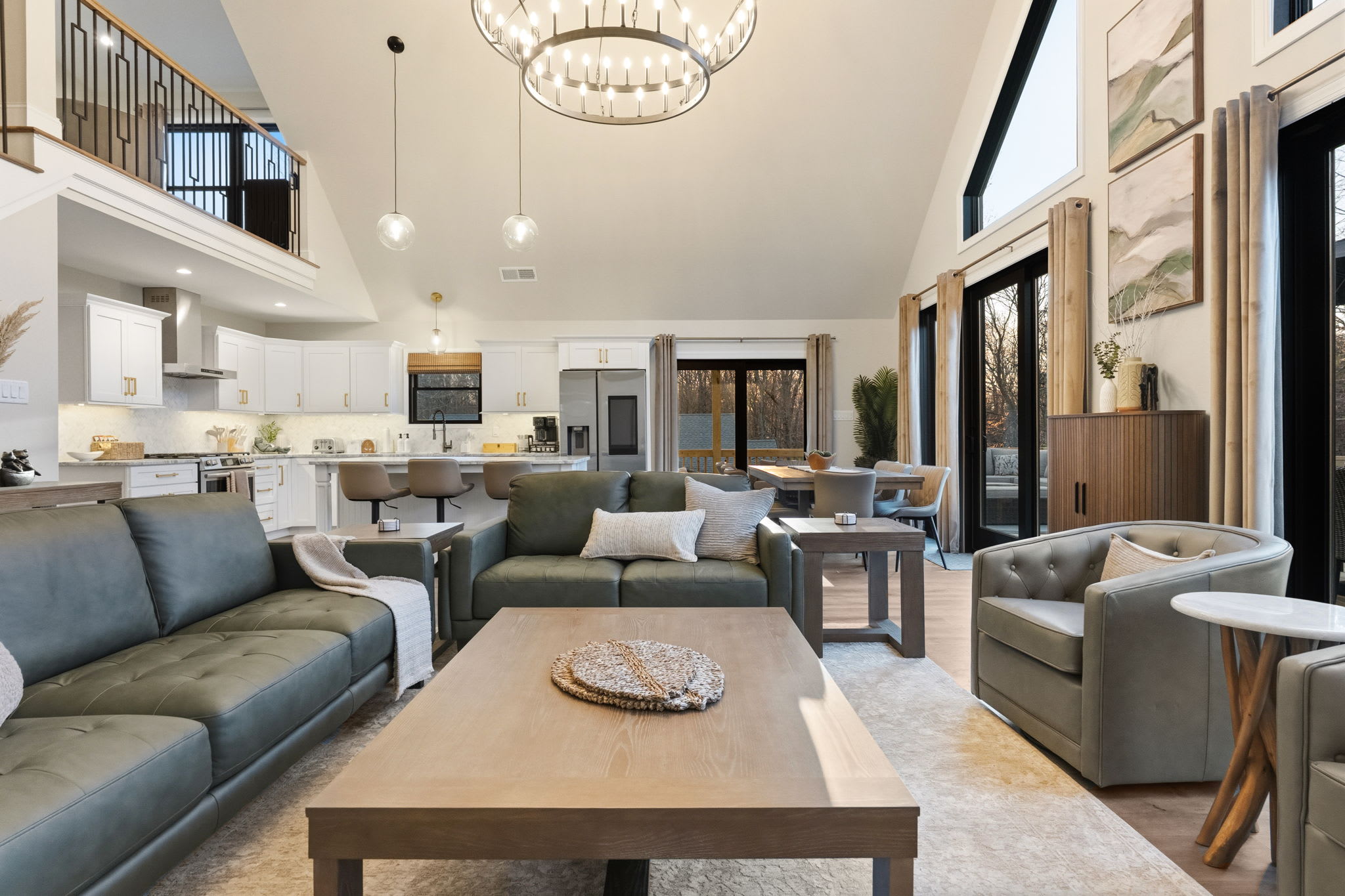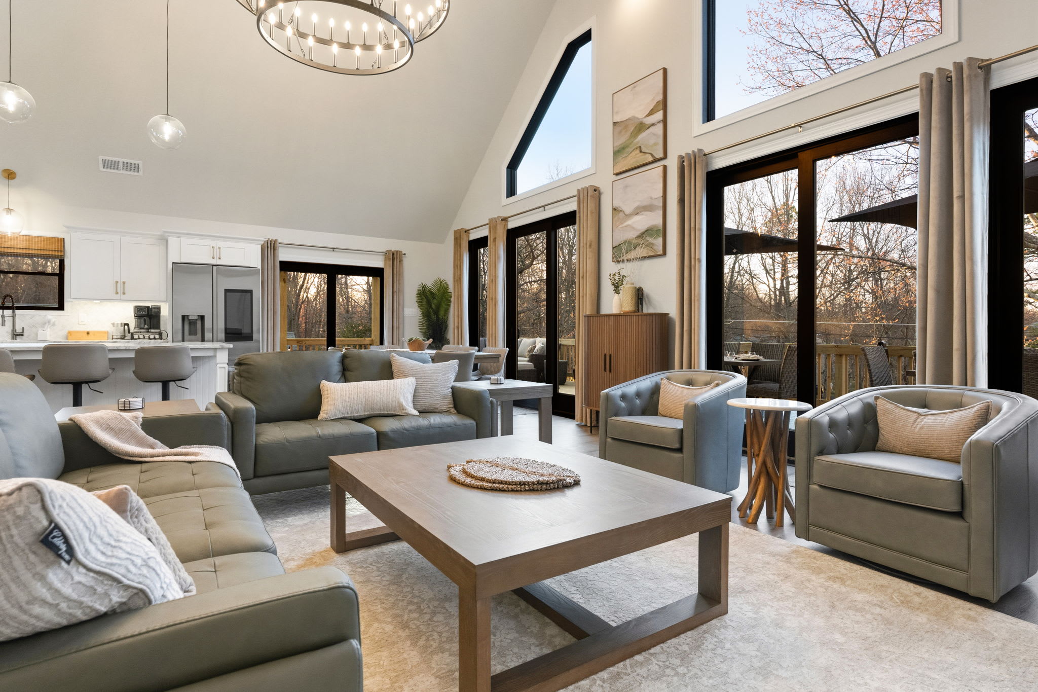 Step inside to soaring vaulted ceilings, a statement chandelier, and a wide-open floor plan that connects the living room, dining area, and chef's kitchen in one breathtaking space. The living room features plush leather seating, a marble-surround propane fireplace that can be enjoyed indoor and outdoors, a large wall-mounted Smart TV, and floor-to-ceiling sliding glass doors that open onto the expansive wraparound deck. Natural light pours in through dramatic peaked windows, filling the home with warmth all day long.