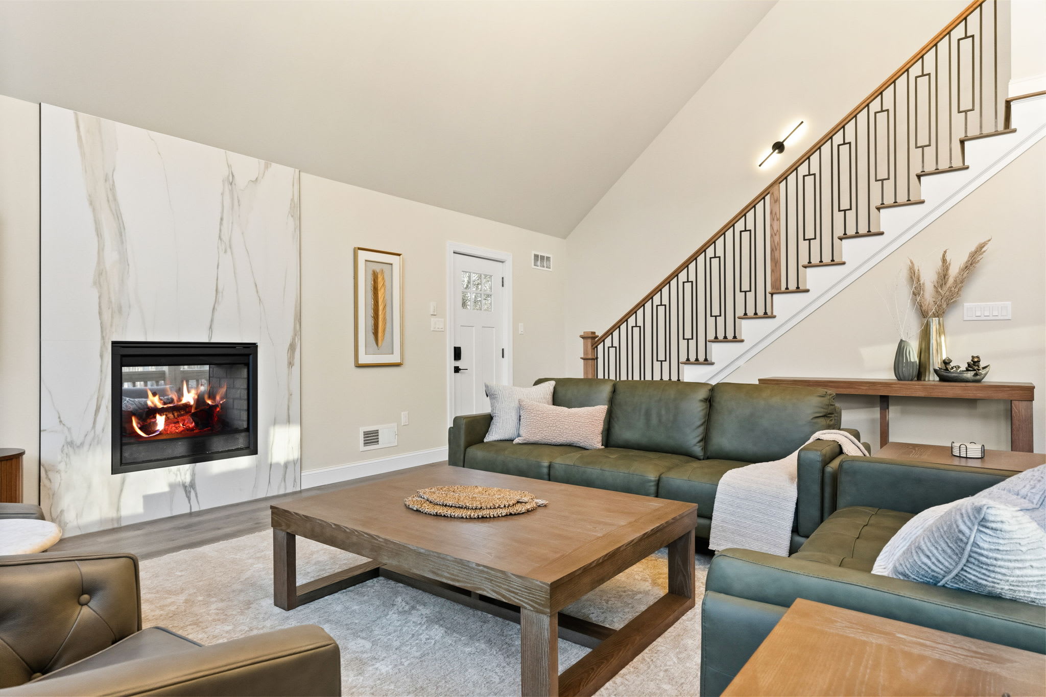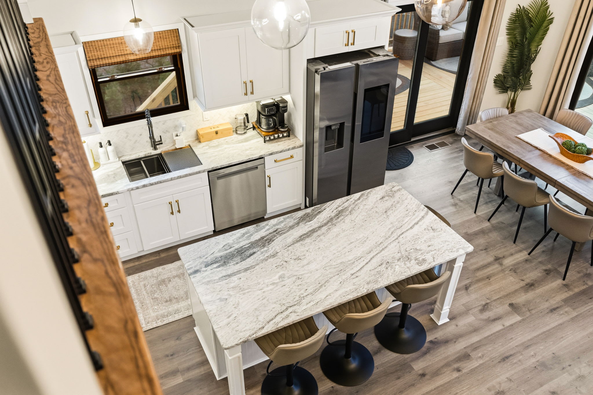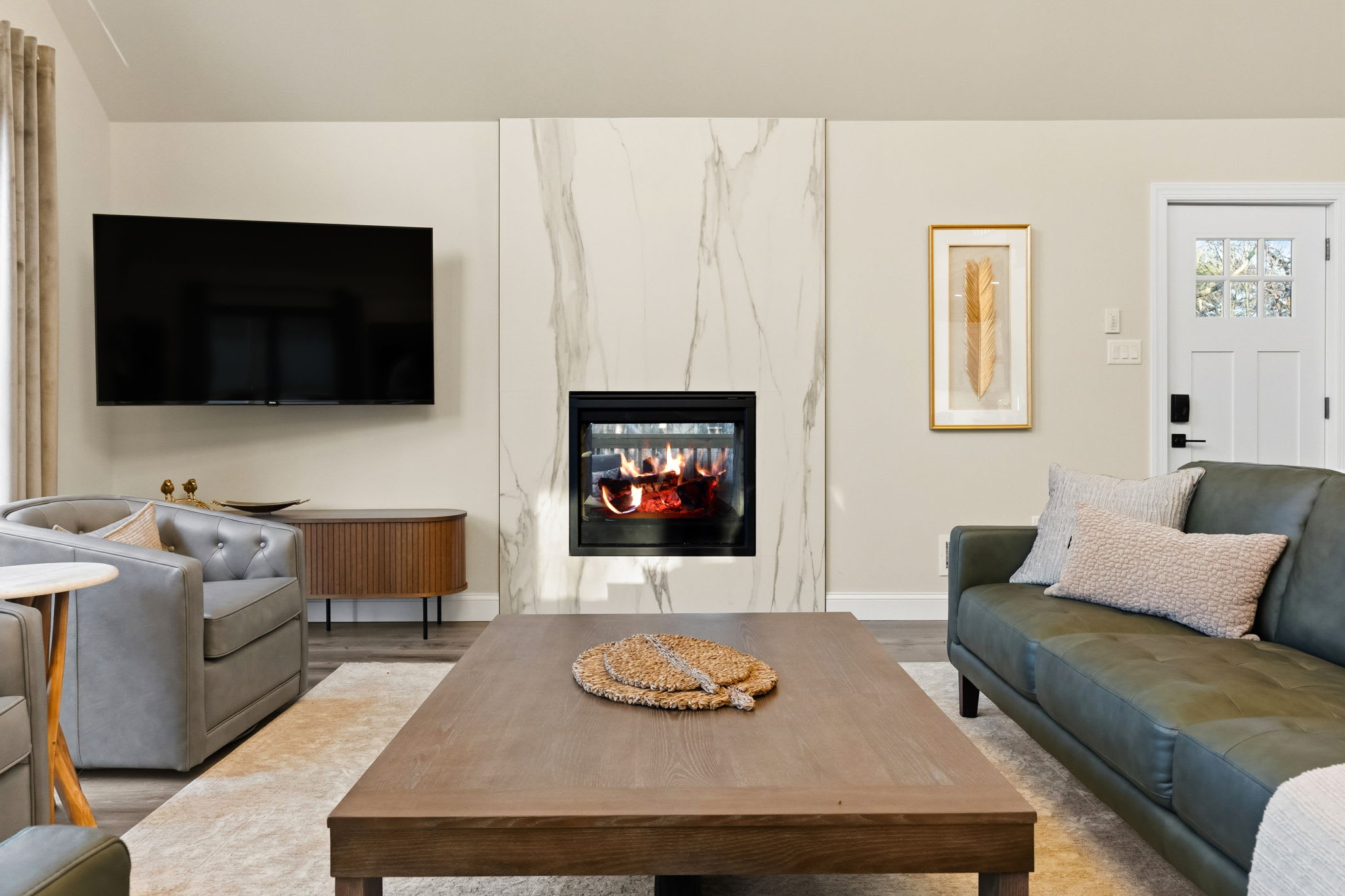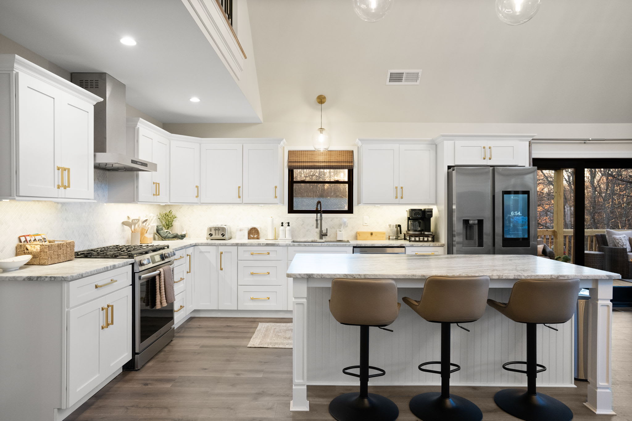 Step inside to soaring vaulted ceilings, a statement chandelier, and a wide-open floor plan that connects the living room, dining area, and chef's kitchen in one breathtaking space. The living room features plush leather seating, a marble-surround propane fireplace that can be enjoyed indoor and outdoors, a large wall-mounted Smart TV, and floor-to-ceiling sliding glass doors that open onto the expansive wraparound deck. Natural light pours in through dramatic peaked windows, filling the home with warmth all day long.