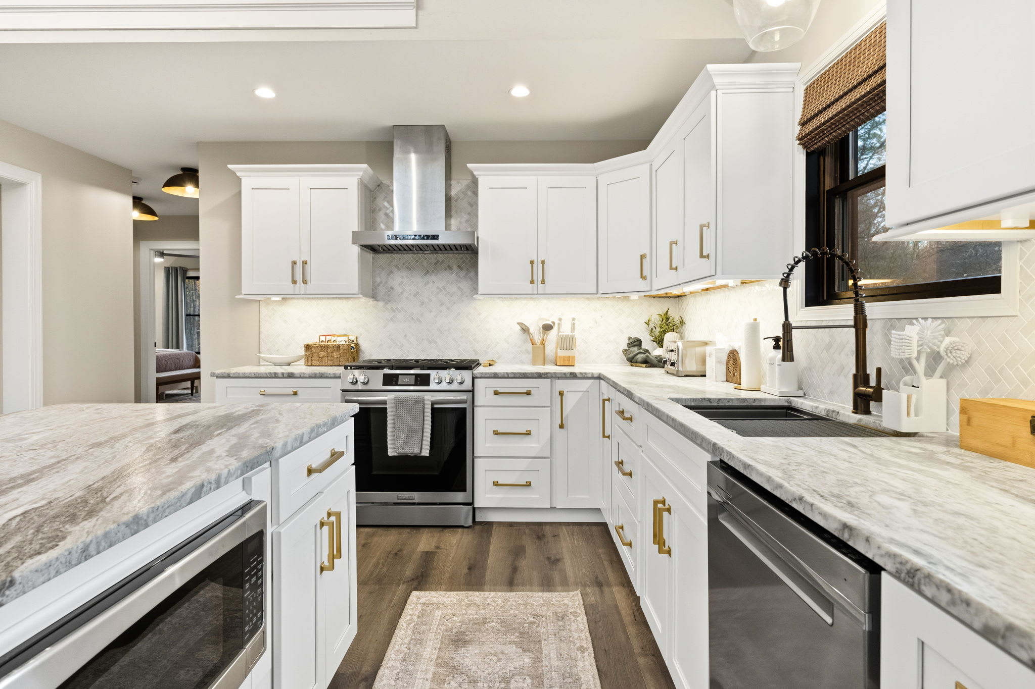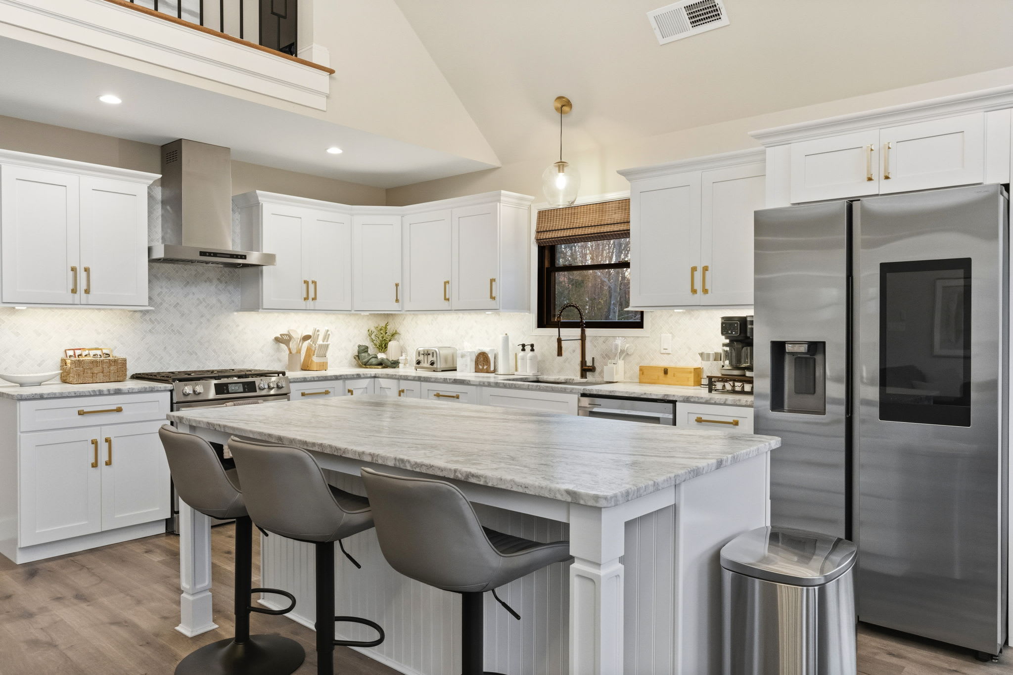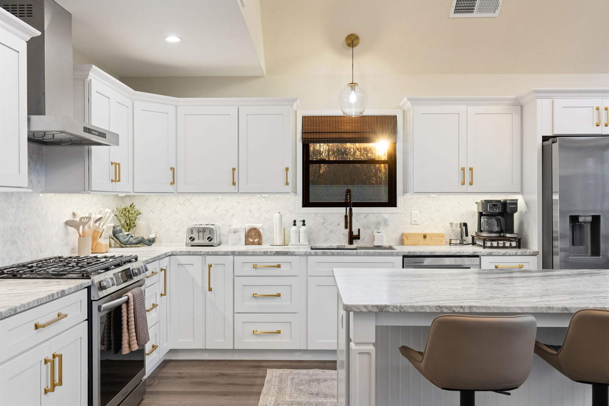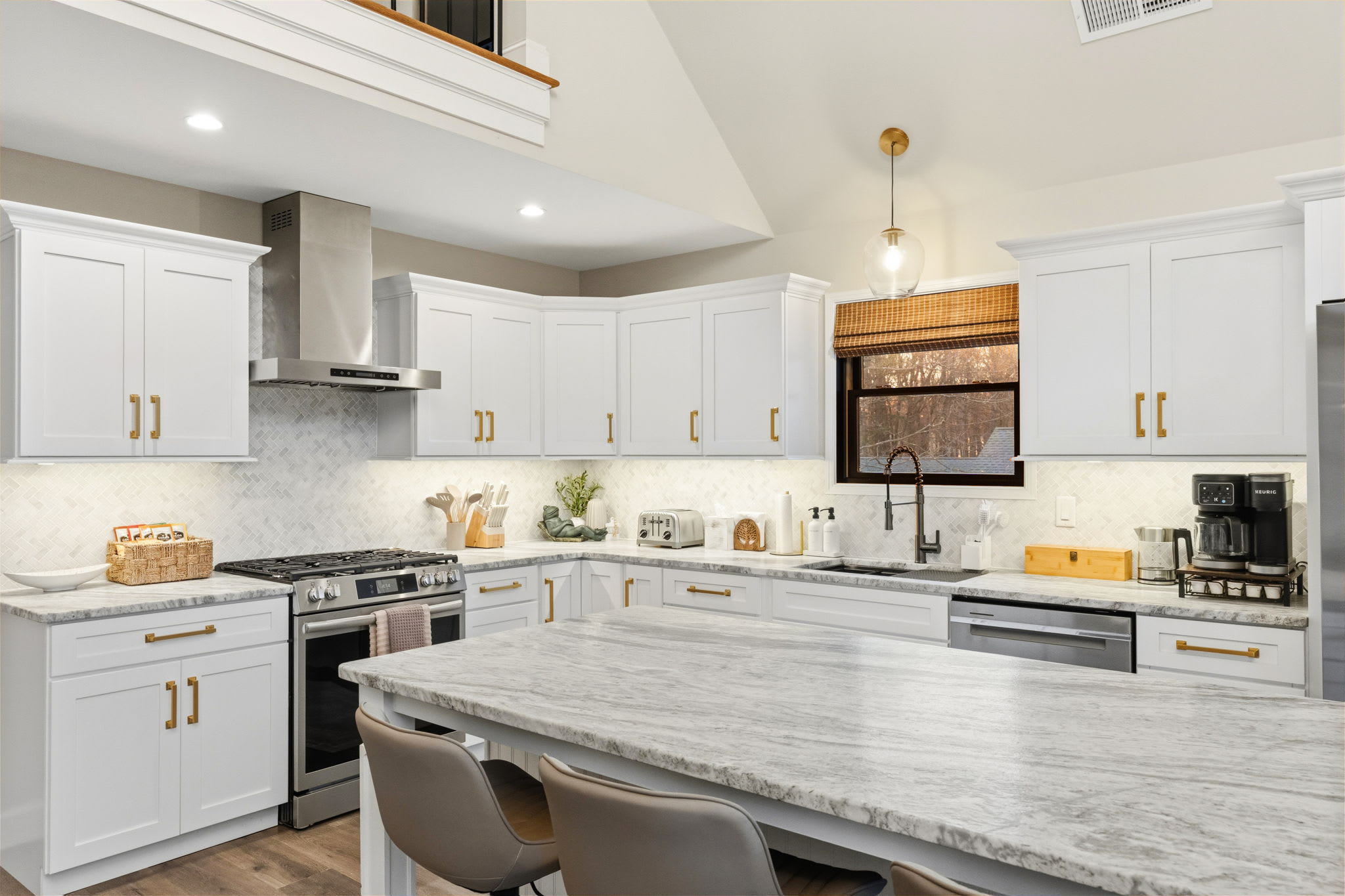 The fully equipped kitchen is built for serious cooking and entertaining. White shaker cabinetry with gold hardware, marble countertops, a herringbone tile backsplash, gas range with stainless steel hood, dishwasher, full-size refrigerator, and a massive island with bar seating for quick bites and morning coffee. You'll find a Keurig, drip coffee maker, toaster, blender, knife set, and all the cooking essentials to prepare meals for the whole group.
