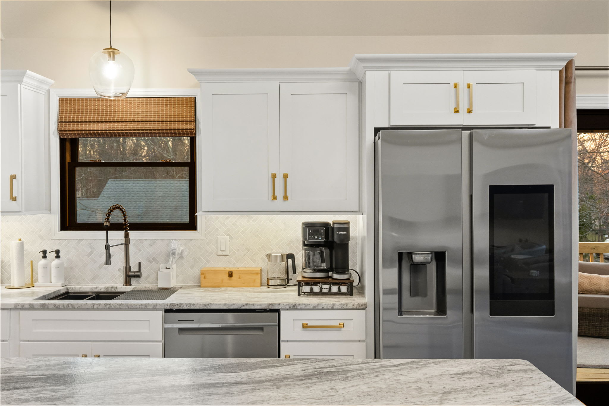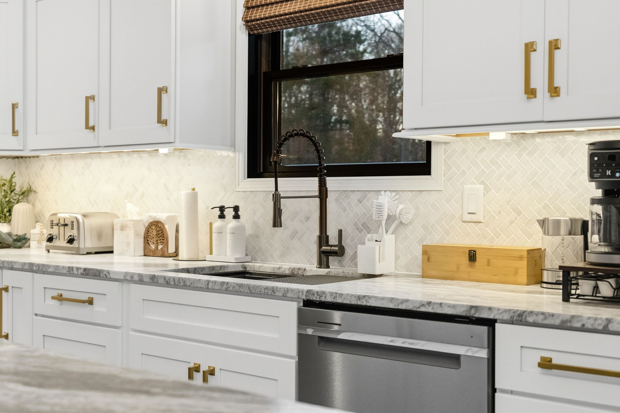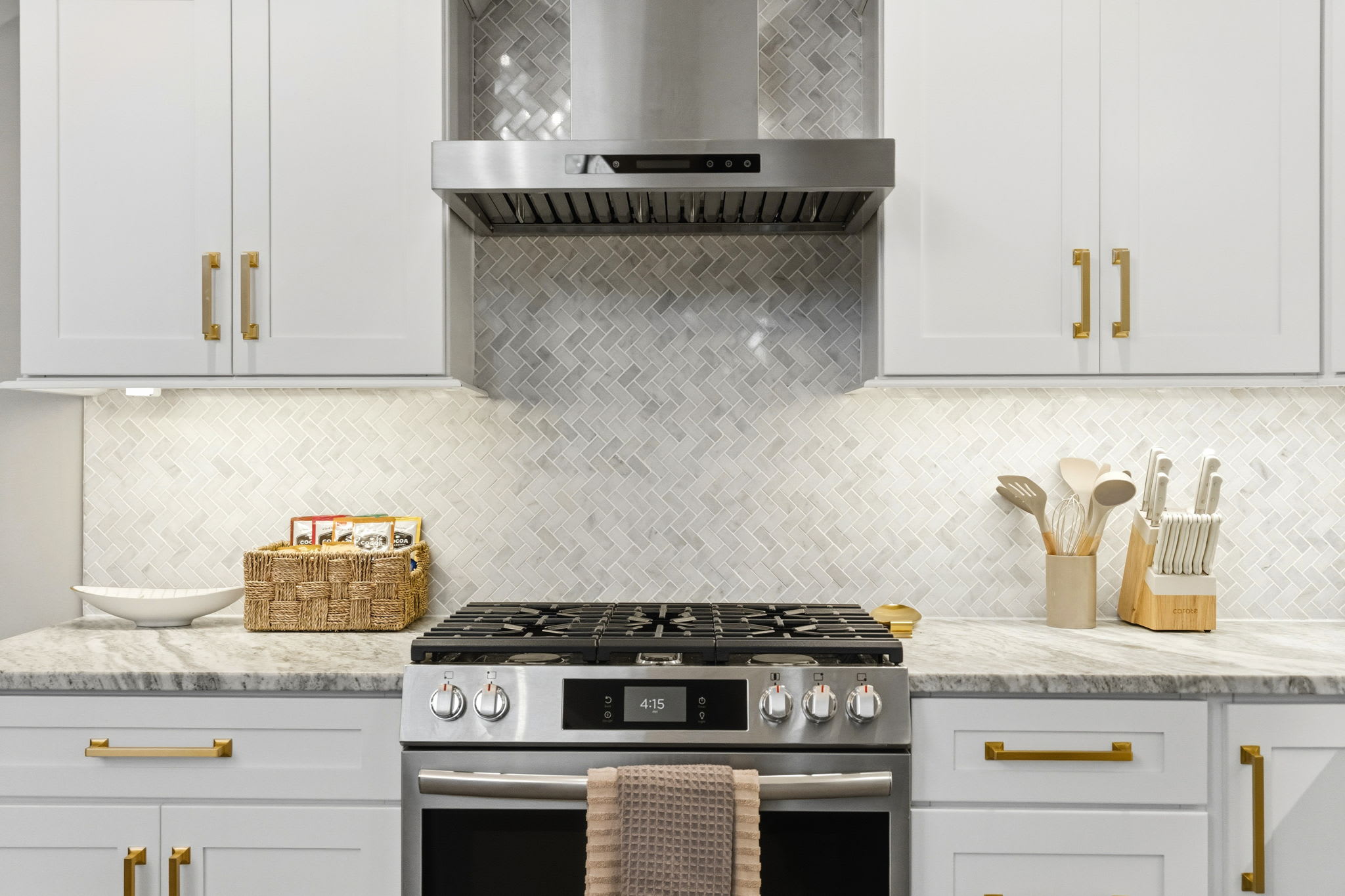 The fully equipped kitchen is built for serious cooking and entertaining. White shaker cabinetry with gold hardware, marble countertops, a herringbone tile backsplash, gas range with stainless steel hood, dishwasher, full-size refrigerator, and a massive island with bar seating for quick bites and morning coffee. You'll find a Keurig, drip coffee maker, toaster, blender, knife set, and all the cooking essentials to prepare meals for the whole group.