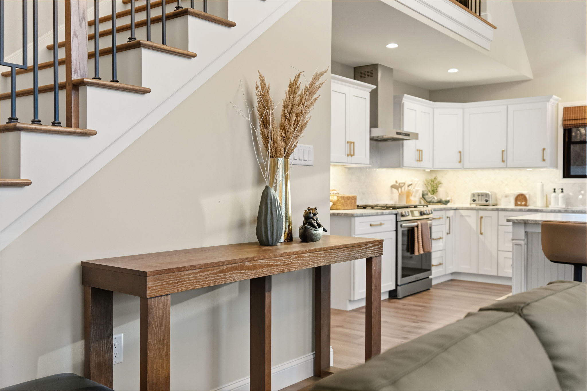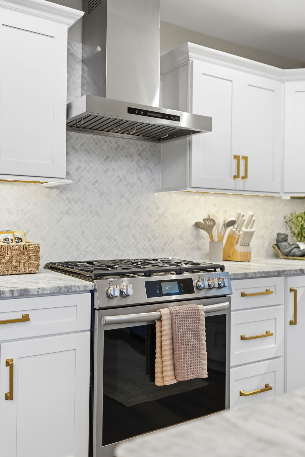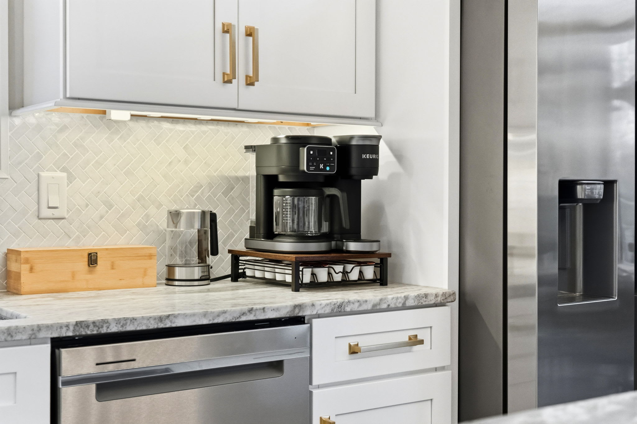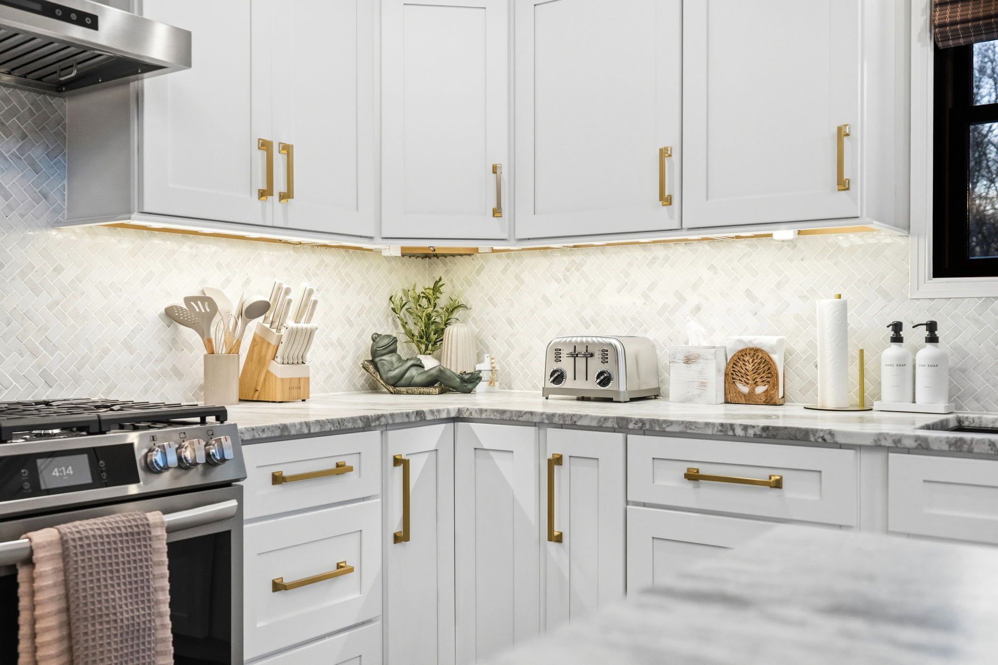 The fully equipped kitchen is built for serious cooking and entertaining. White shaker cabinetry with gold hardware, marble countertops, a herringbone tile backsplash, gas range with stainless steel hood, dishwasher, full-size refrigerator, and a massive island with bar seating for quick bites and morning coffee. You'll find a Keurig, drip coffee maker, toaster, blender, knife set, and all the cooking essentials to prepare meals for the whole group.