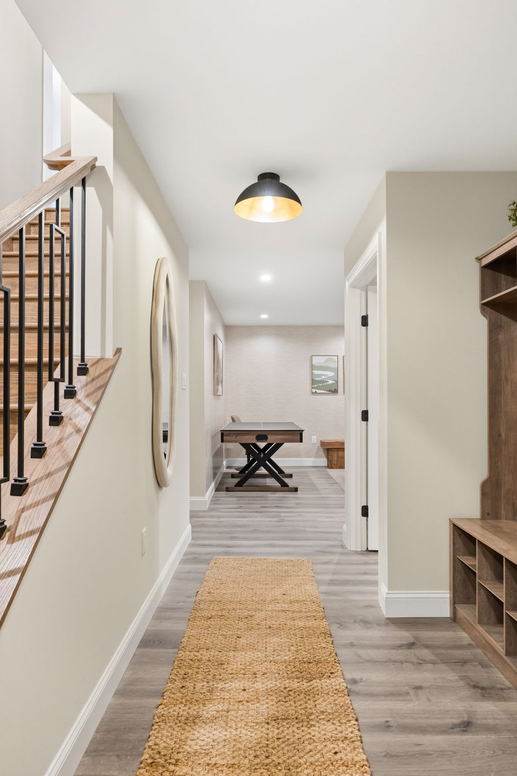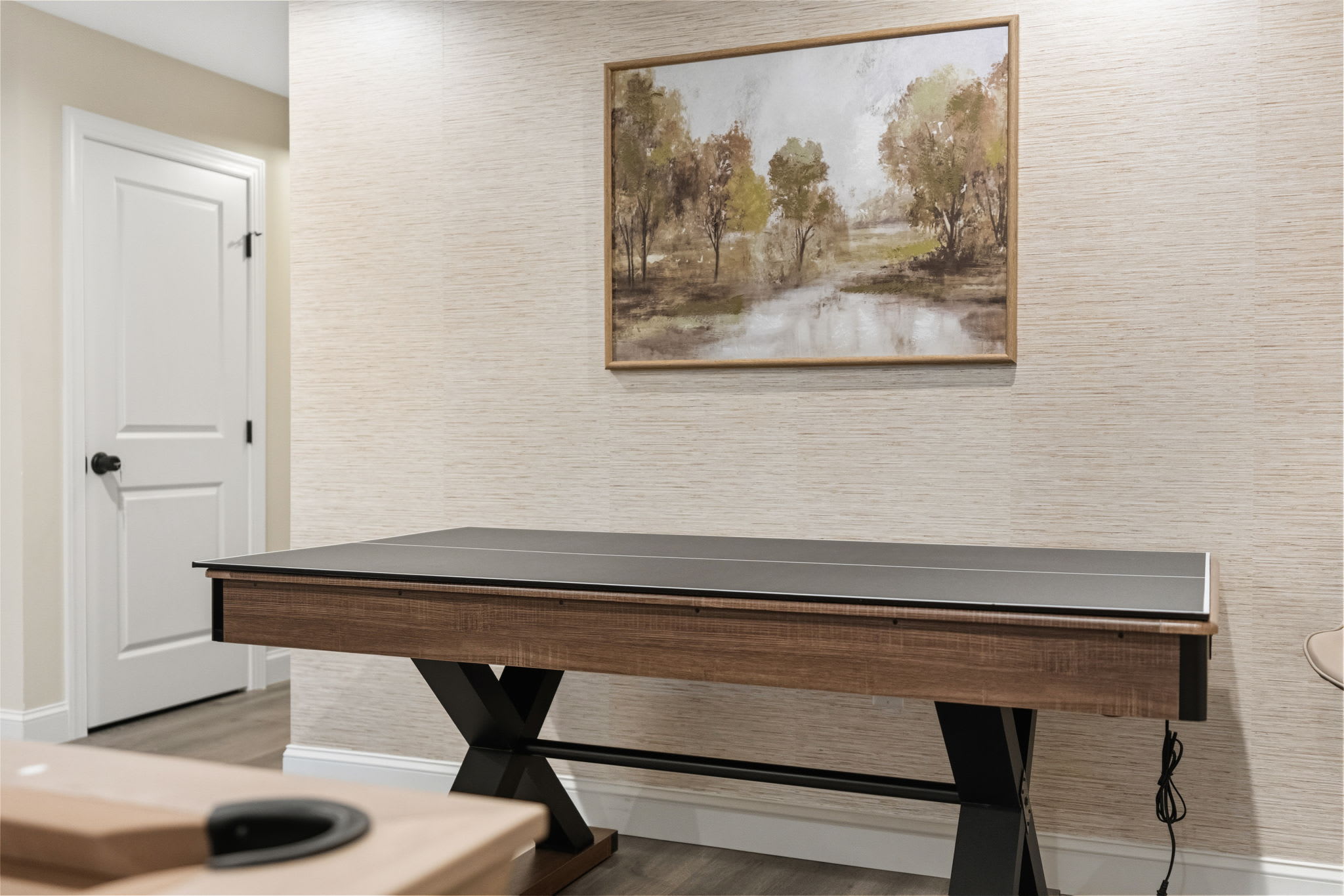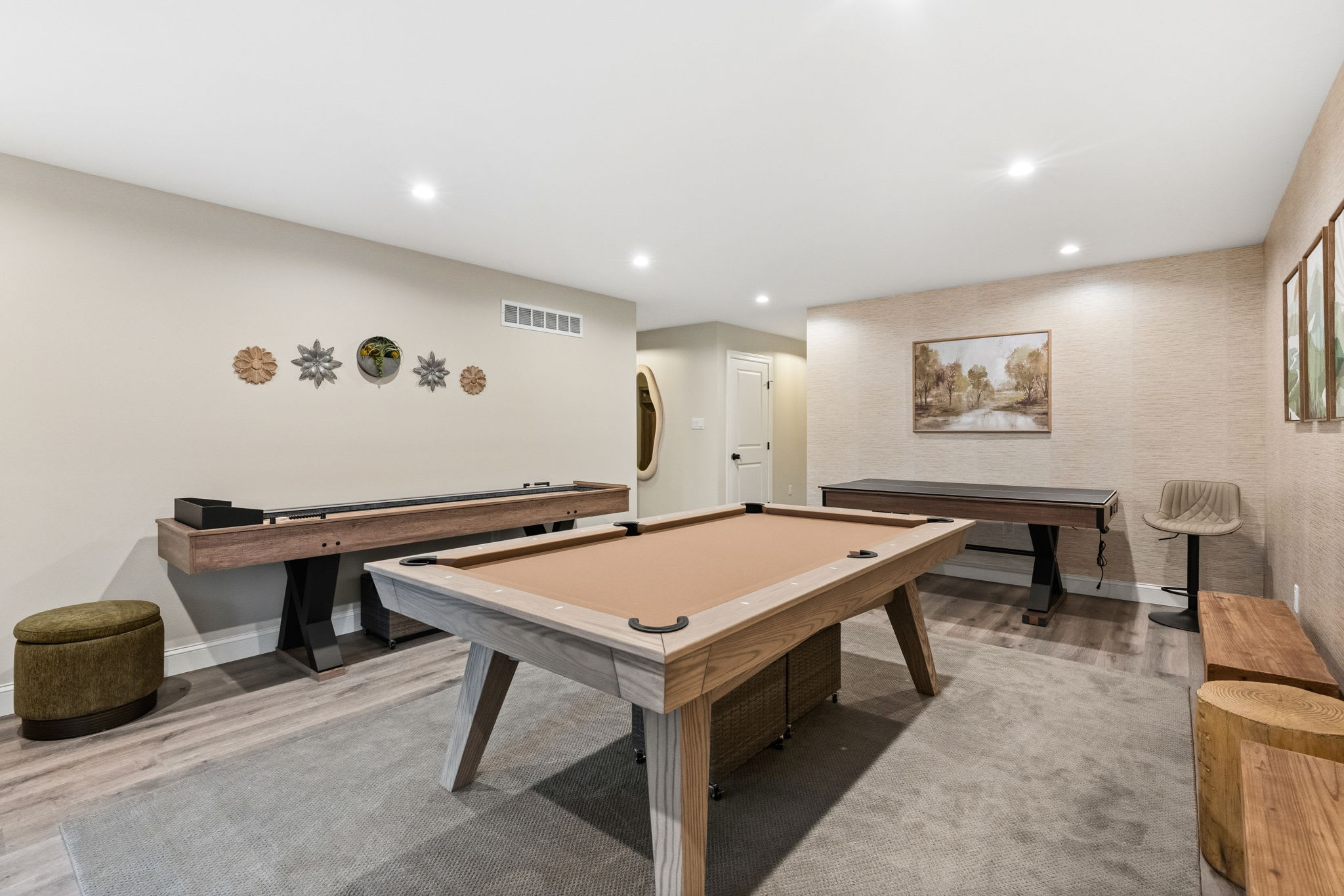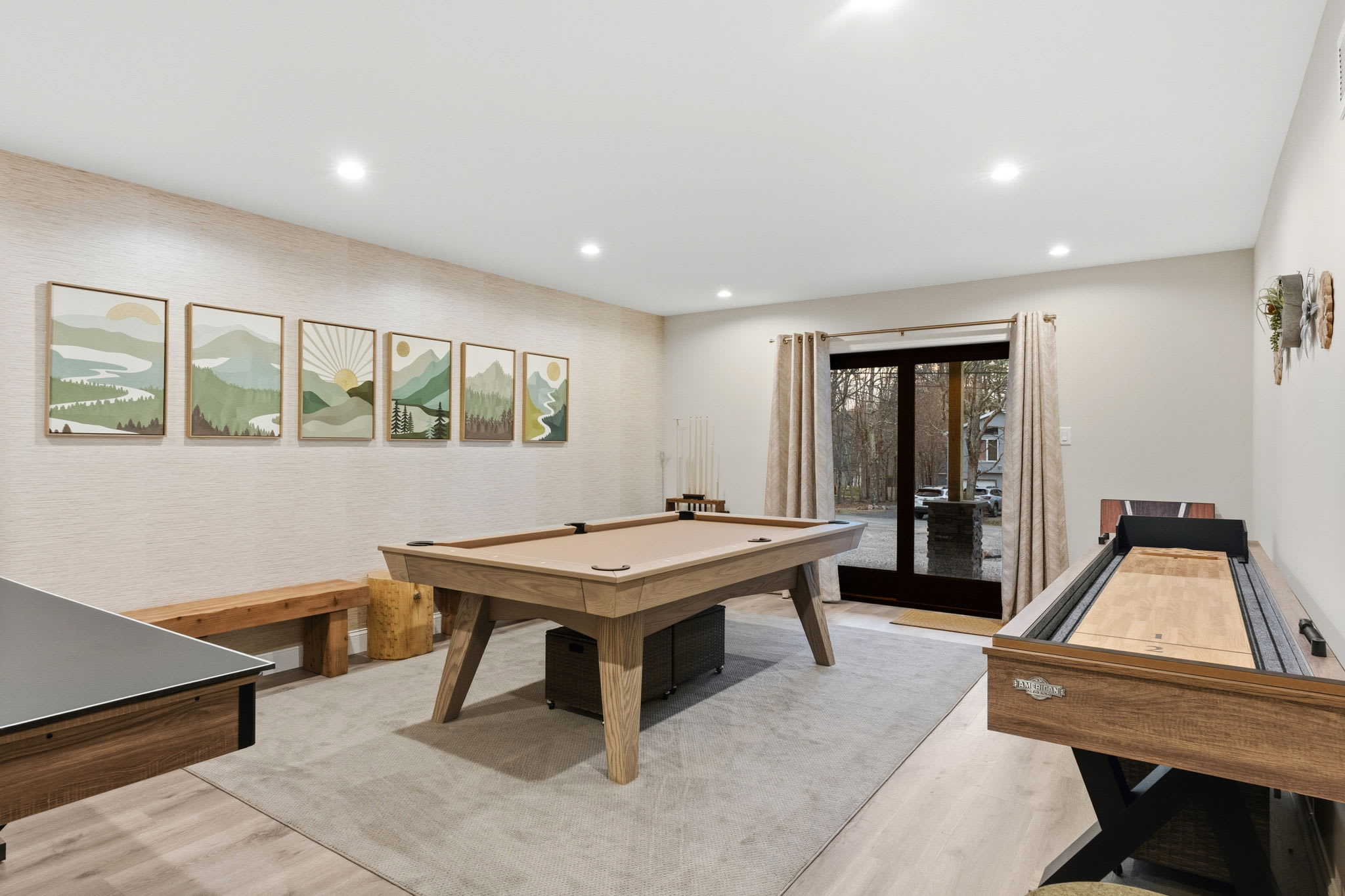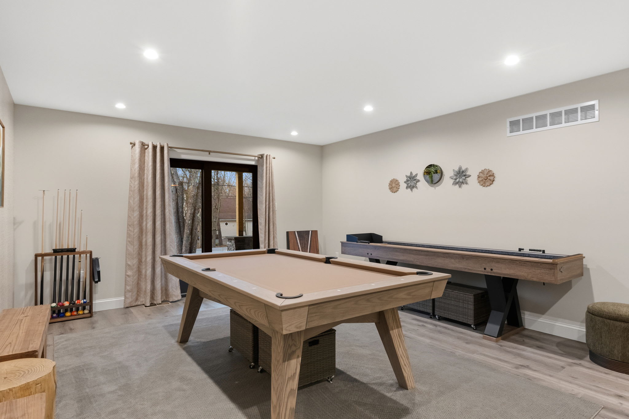 The dedicated game room on the first floor keeps everyone entertained with a full-size pool table, shuffleboard table, and board games. Sliding glass doors open right out to the covered patio for easy indoor-outdoor flow.