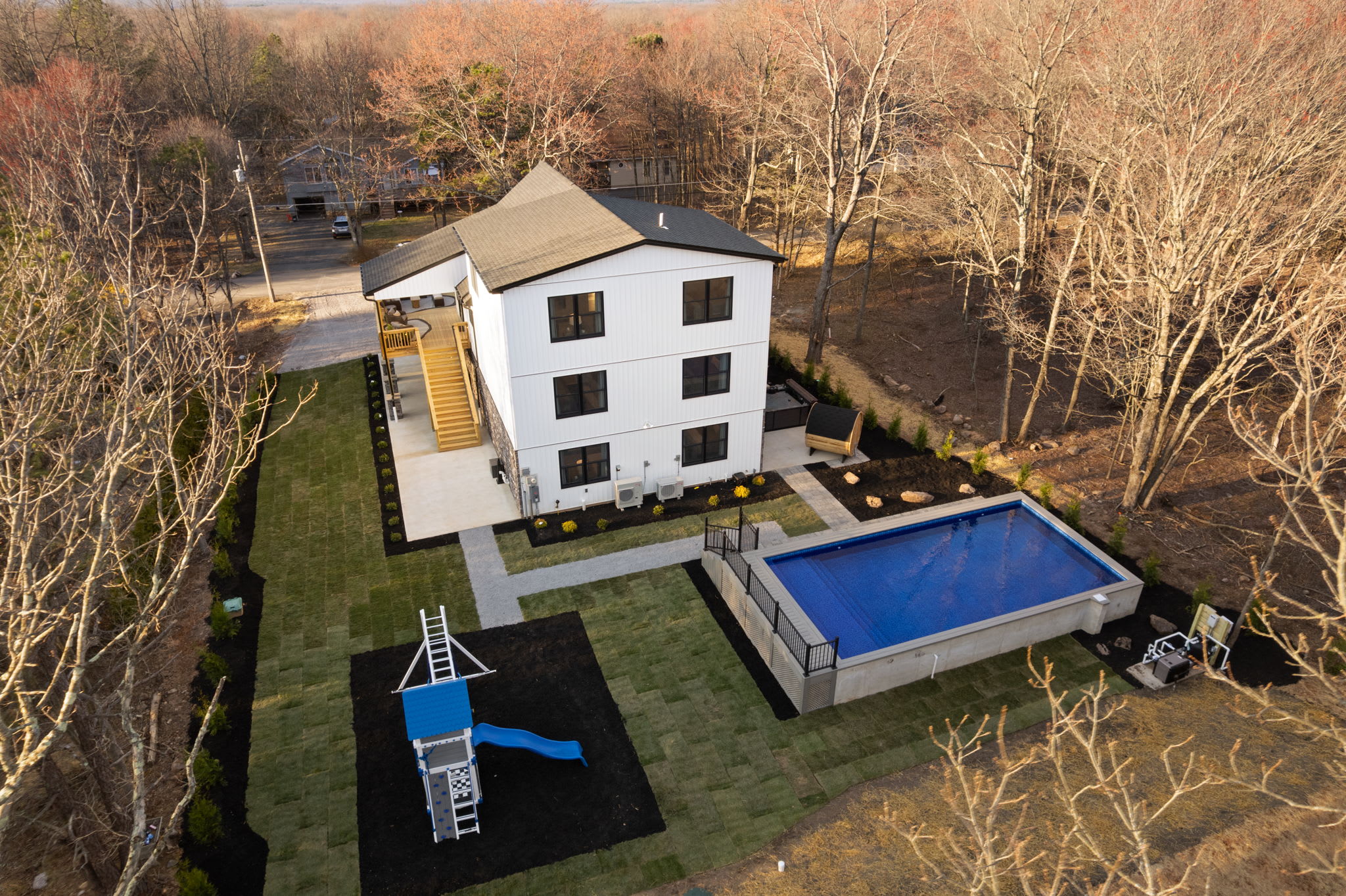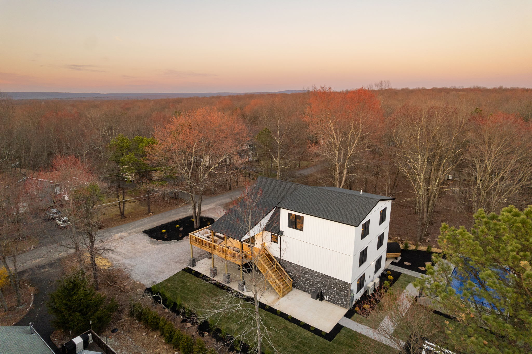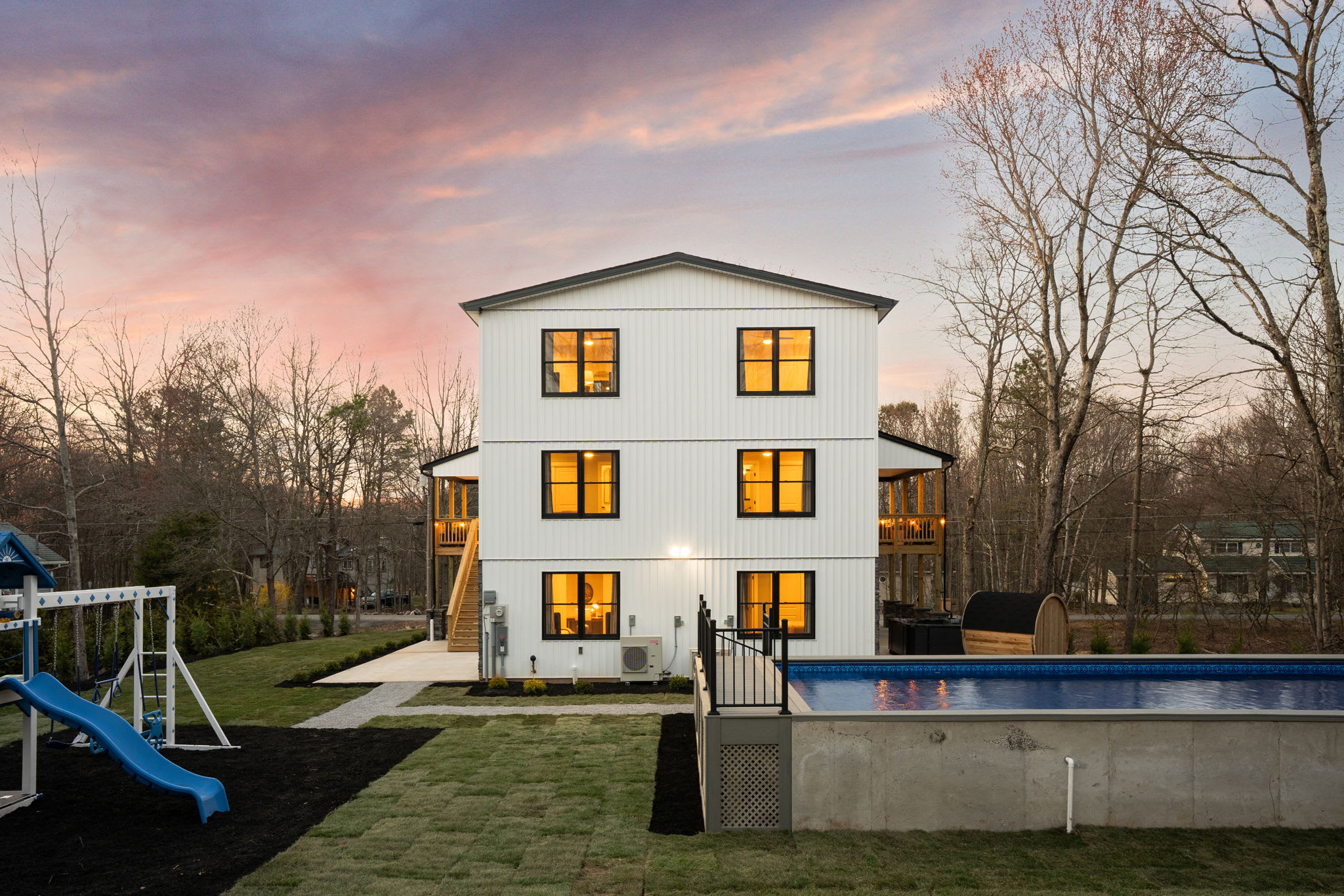Welcome to The Daniel 🏔️ A stunning 3-story new construction home on a half-acre lot in Towamensing Trails with a private pool, barrel sauna, game room, and chef's kitchen. Vaulted ceilings, marble fireplace, wraparound deck with outdoor dining, and a kids playground. 7 bedrooms, 5 bathrooms, sleeps 16+ with designer bedrooms across 3 floors. Minutes from the community lake, beach, and bar. Perfect for large family getaways and group trips 🏊♂️🎱 Professionally landscaped with modern luxury throughout.