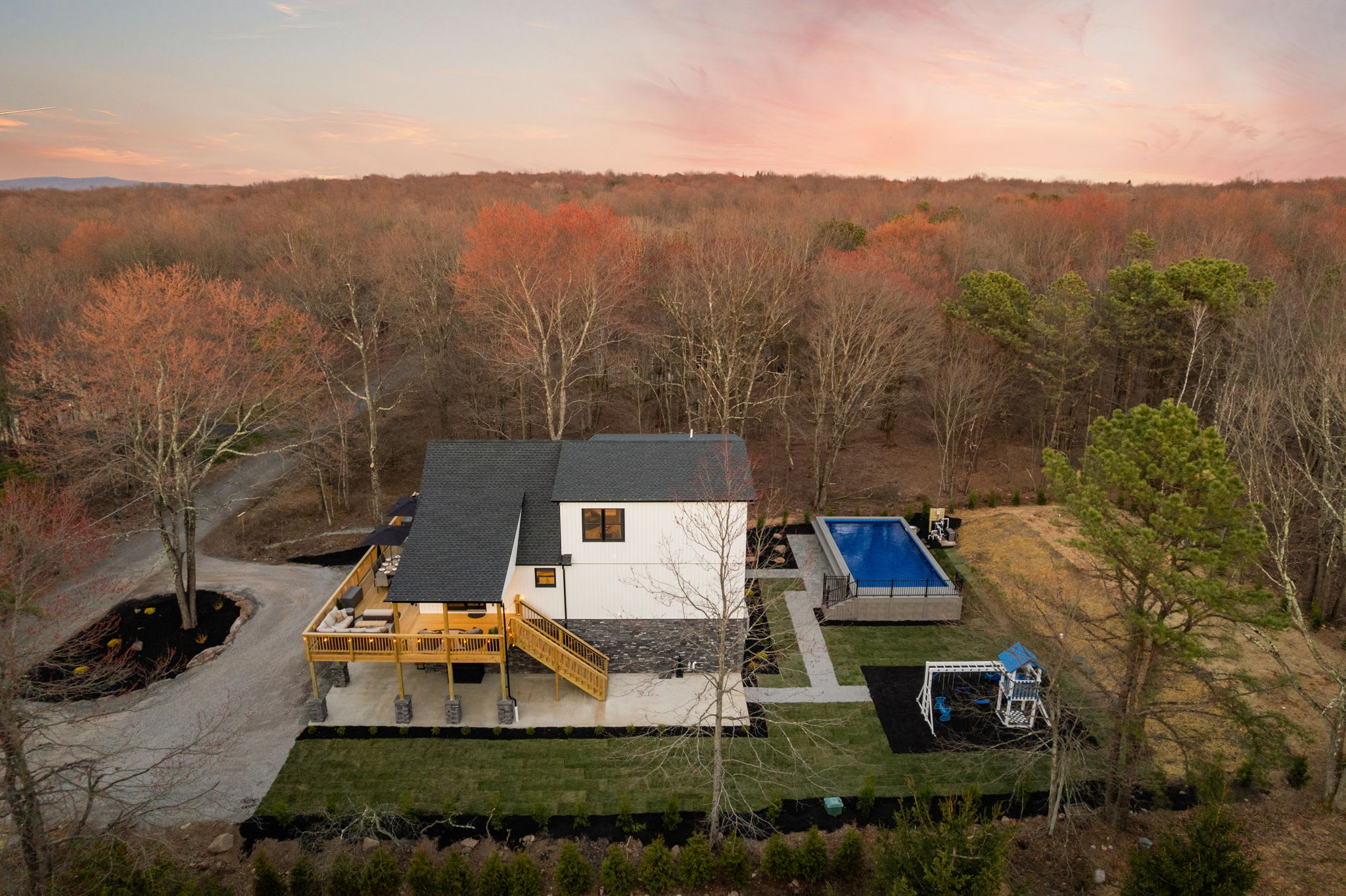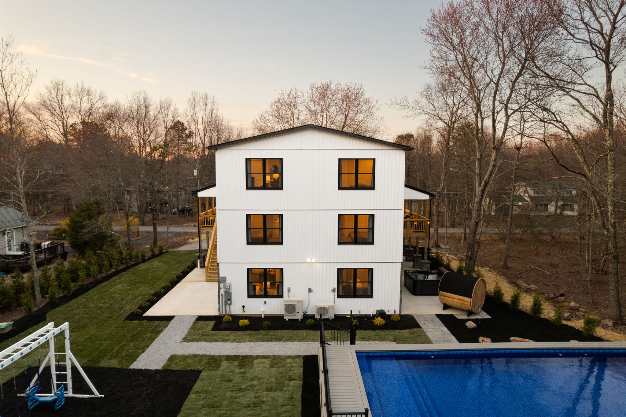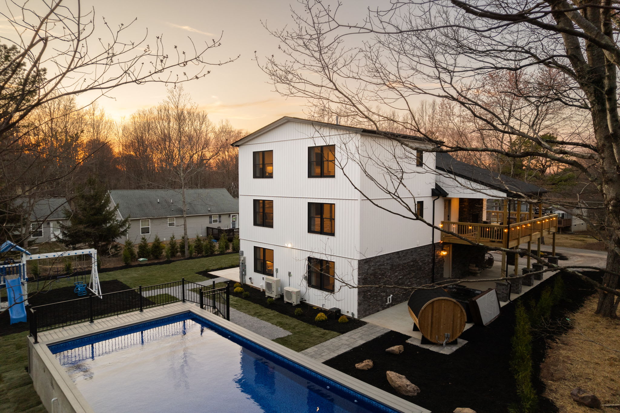 Welcome to The Daniel 🏔️ A stunning 3-story new construction home on a half-acre lot in Towamensing Trails with a private pool, barrel sauna, game room, and chef's kitchen. Vaulted ceilings, marble fireplace, wraparound deck with outdoor dining, and a kids playground. 7 bedrooms, 5 bathrooms, sleeps 16+ with designer bedrooms across 3 floors. Minutes from the community lake, beach, and bar. Perfect for large family getaways and group trips 🏊♂️🎱 Professionally landscaped with modern luxury throughout.