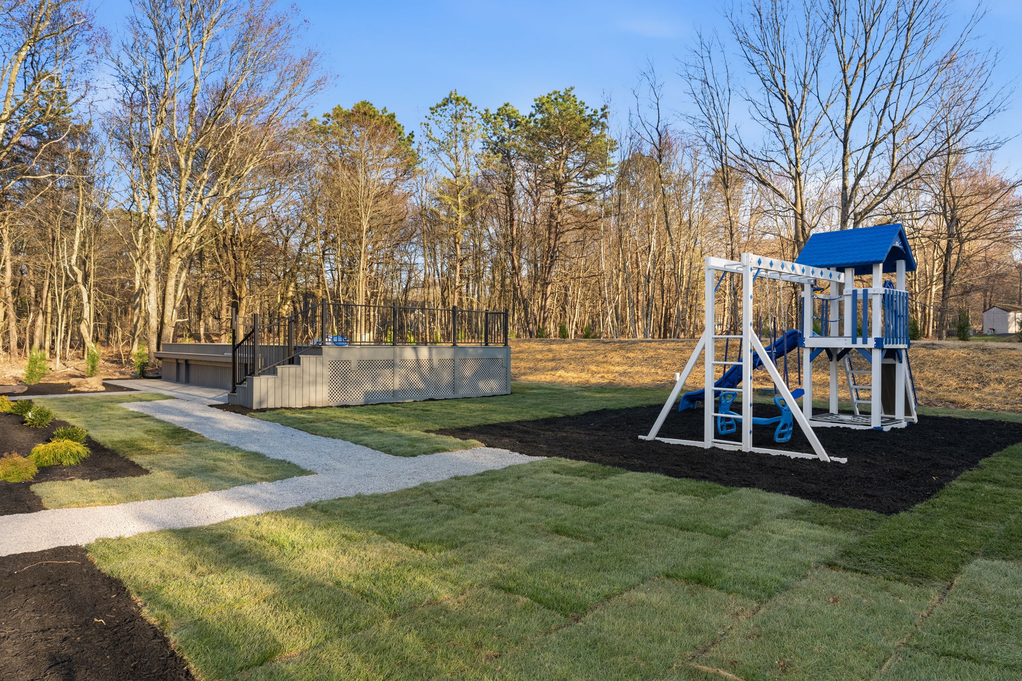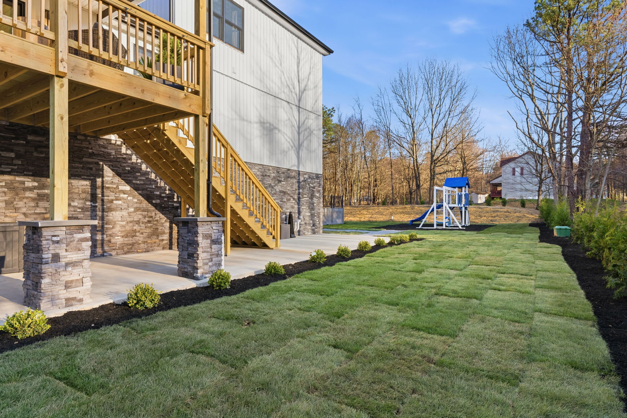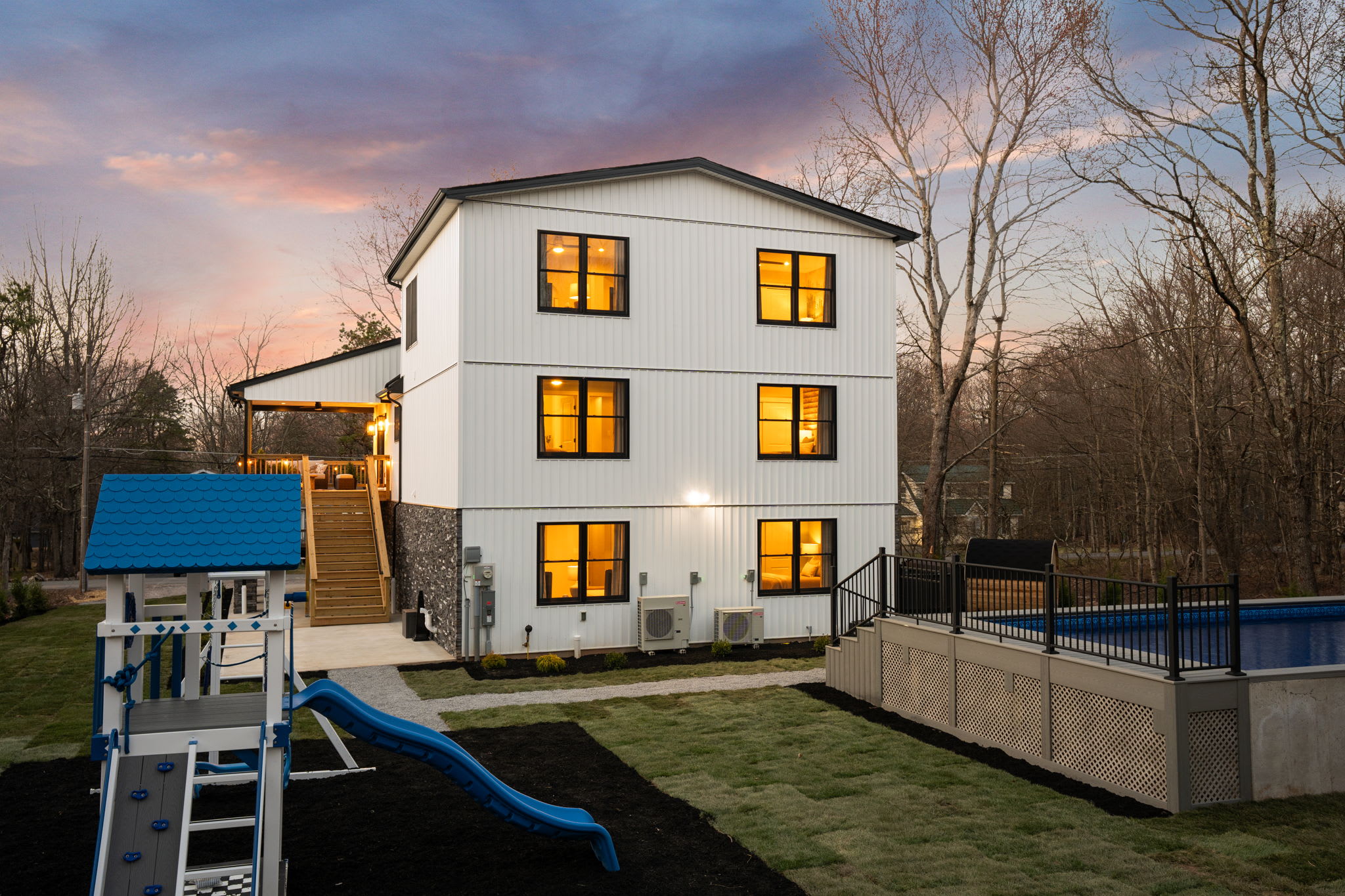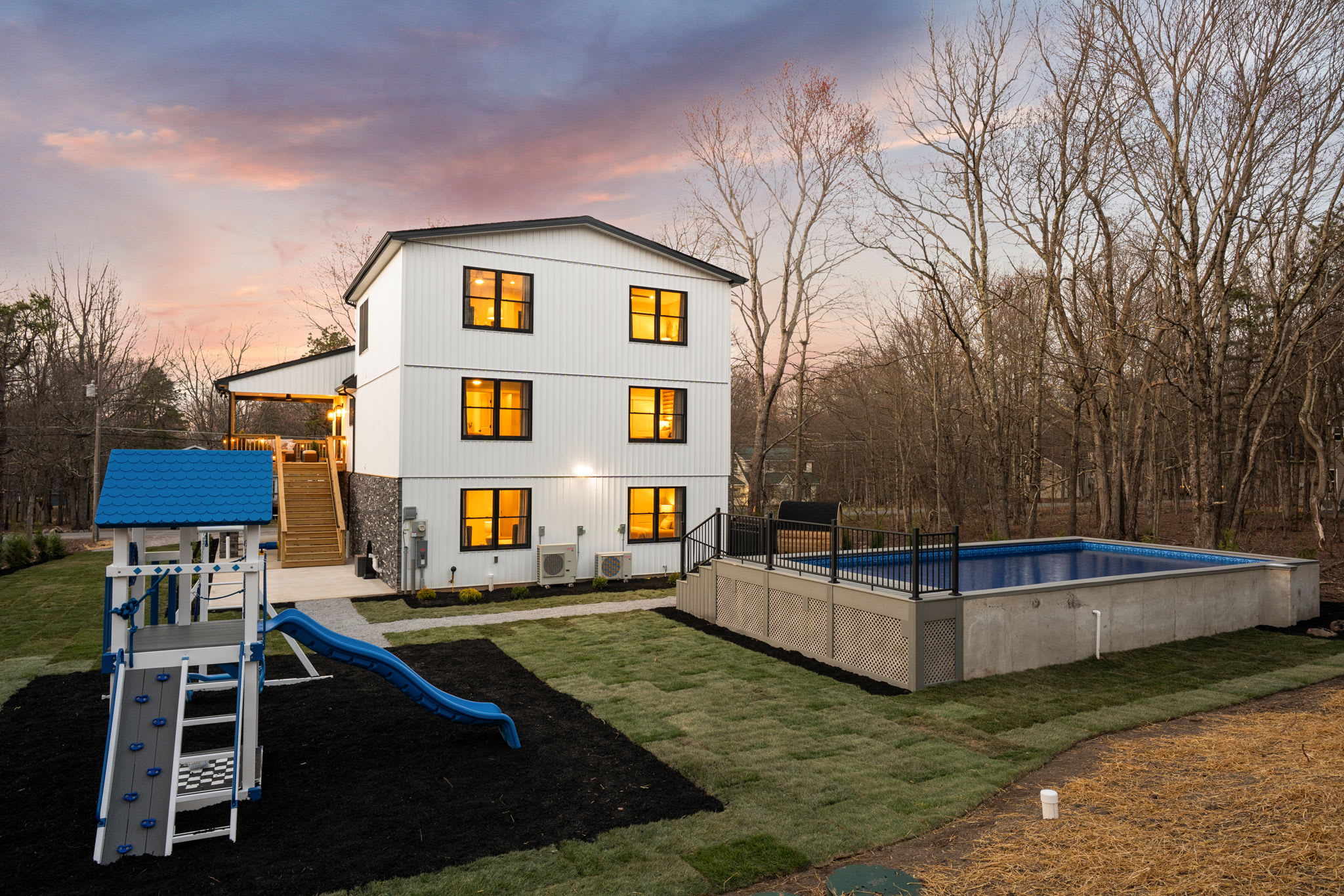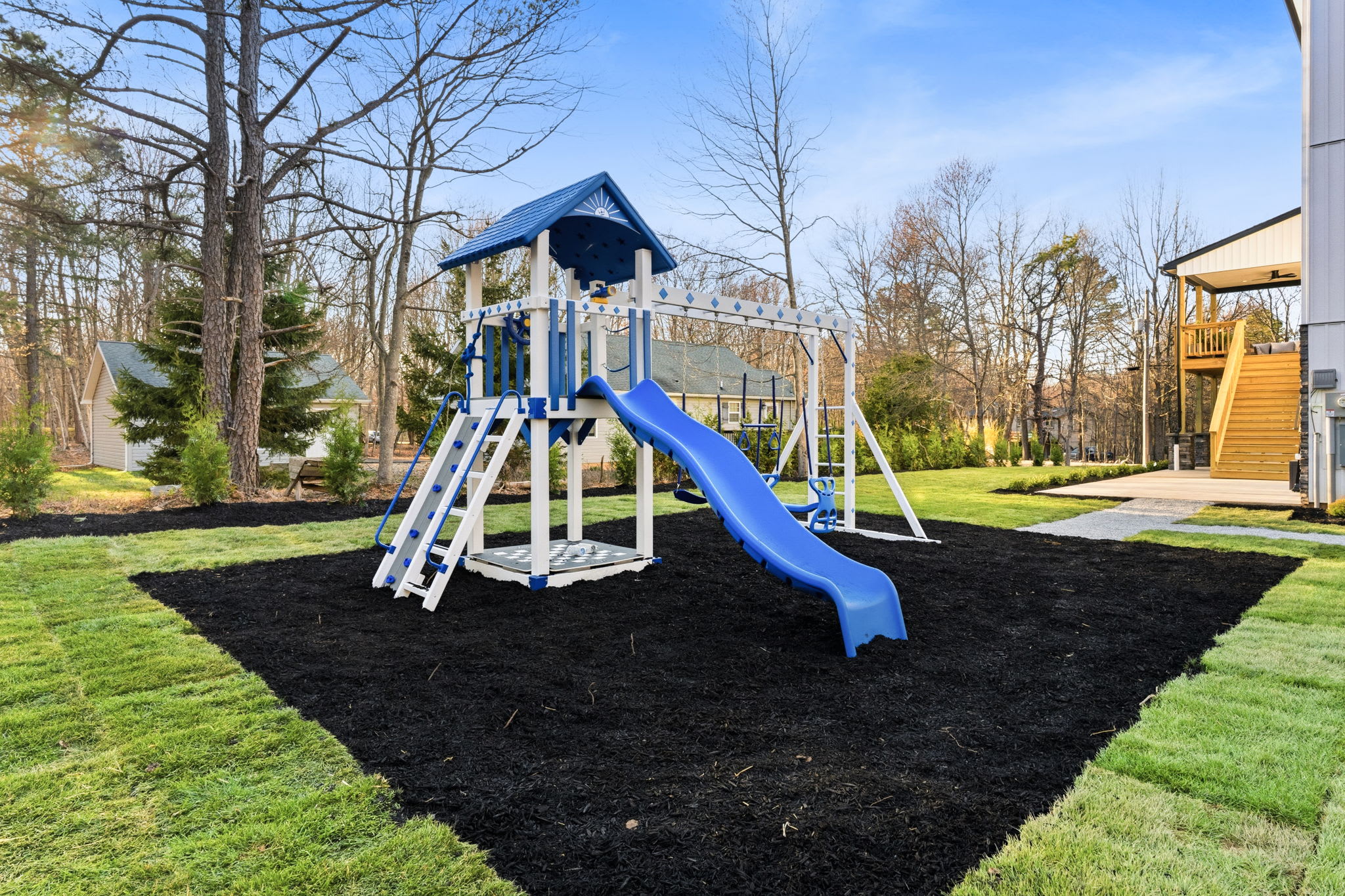 ▪️🛝 Kids Playground — A full swing set with slide, climbing wall, and play tower right in the backyard