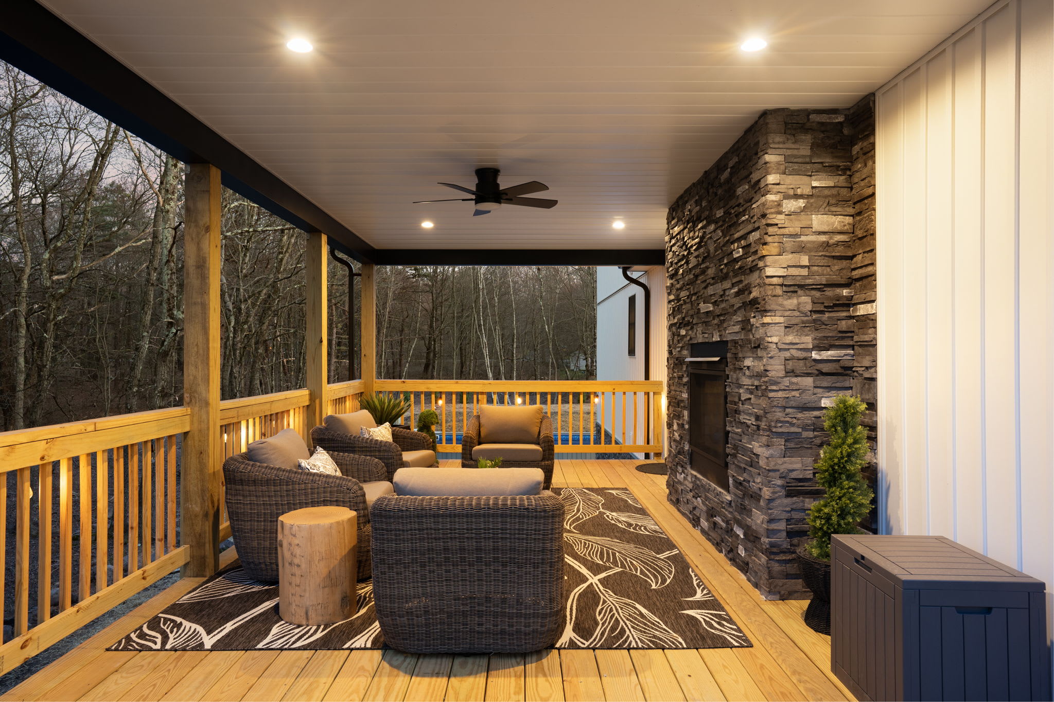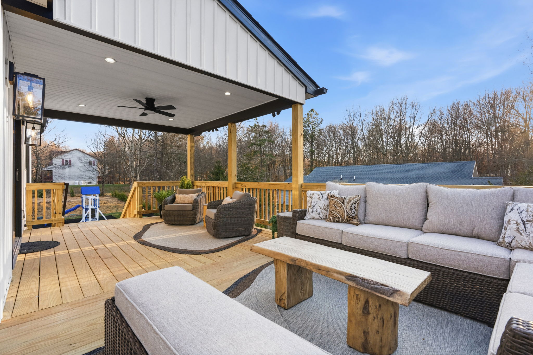 ▪️🪵 Wraparound Deck — Second-story deck with multiple dining and lounge zones, covered section with ceiling fan