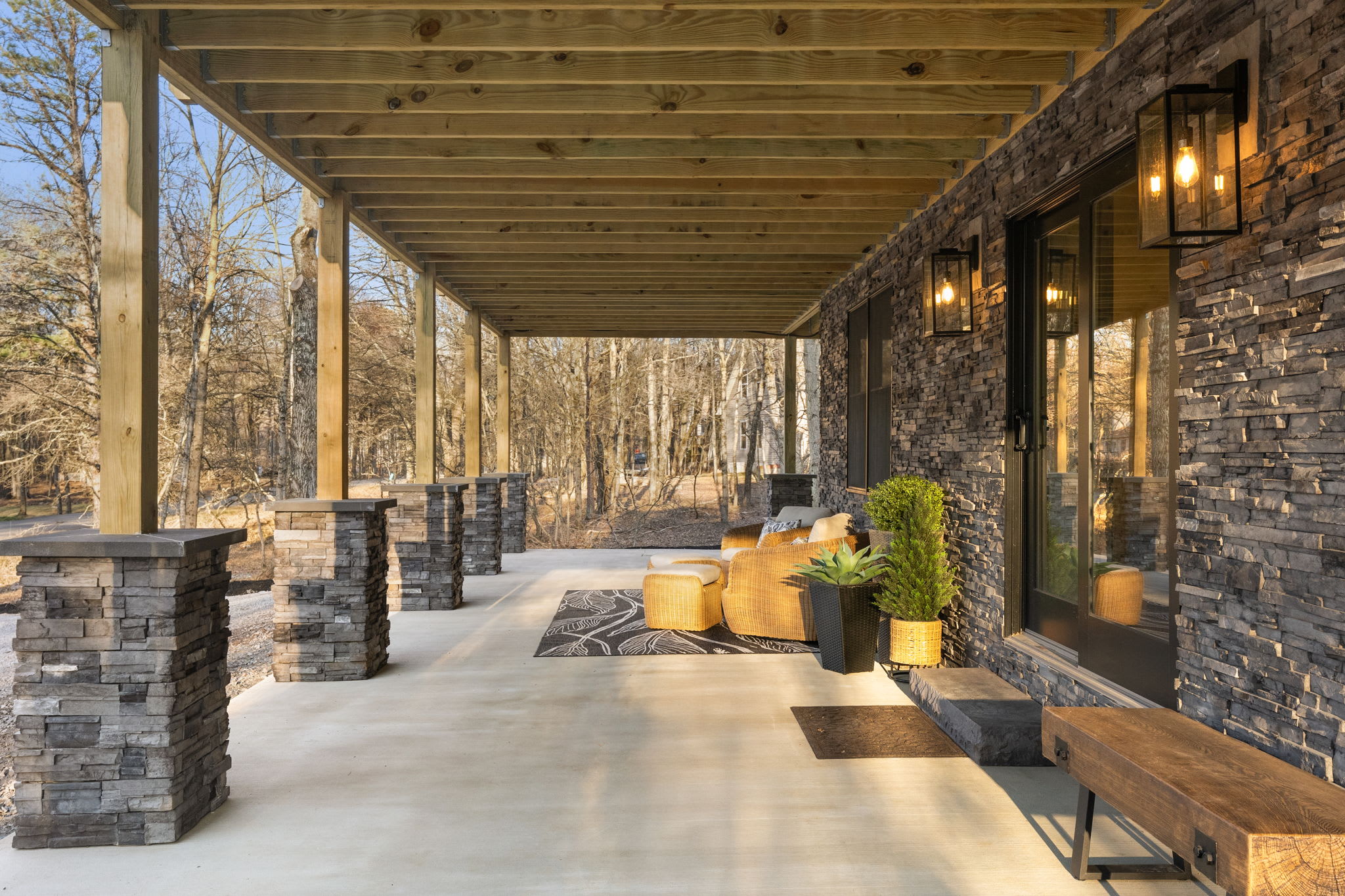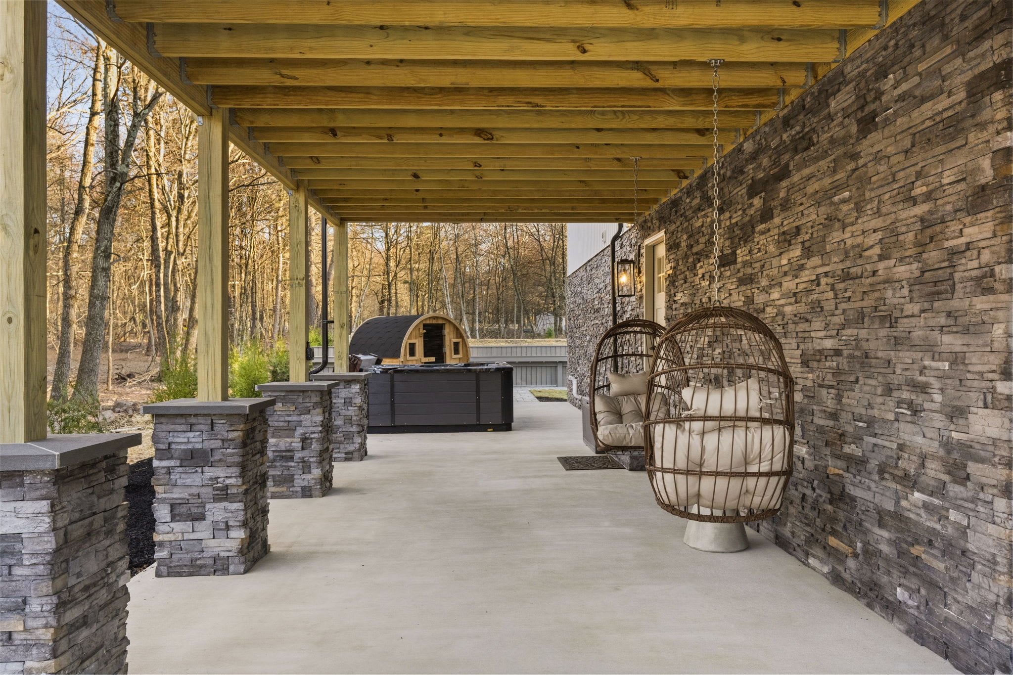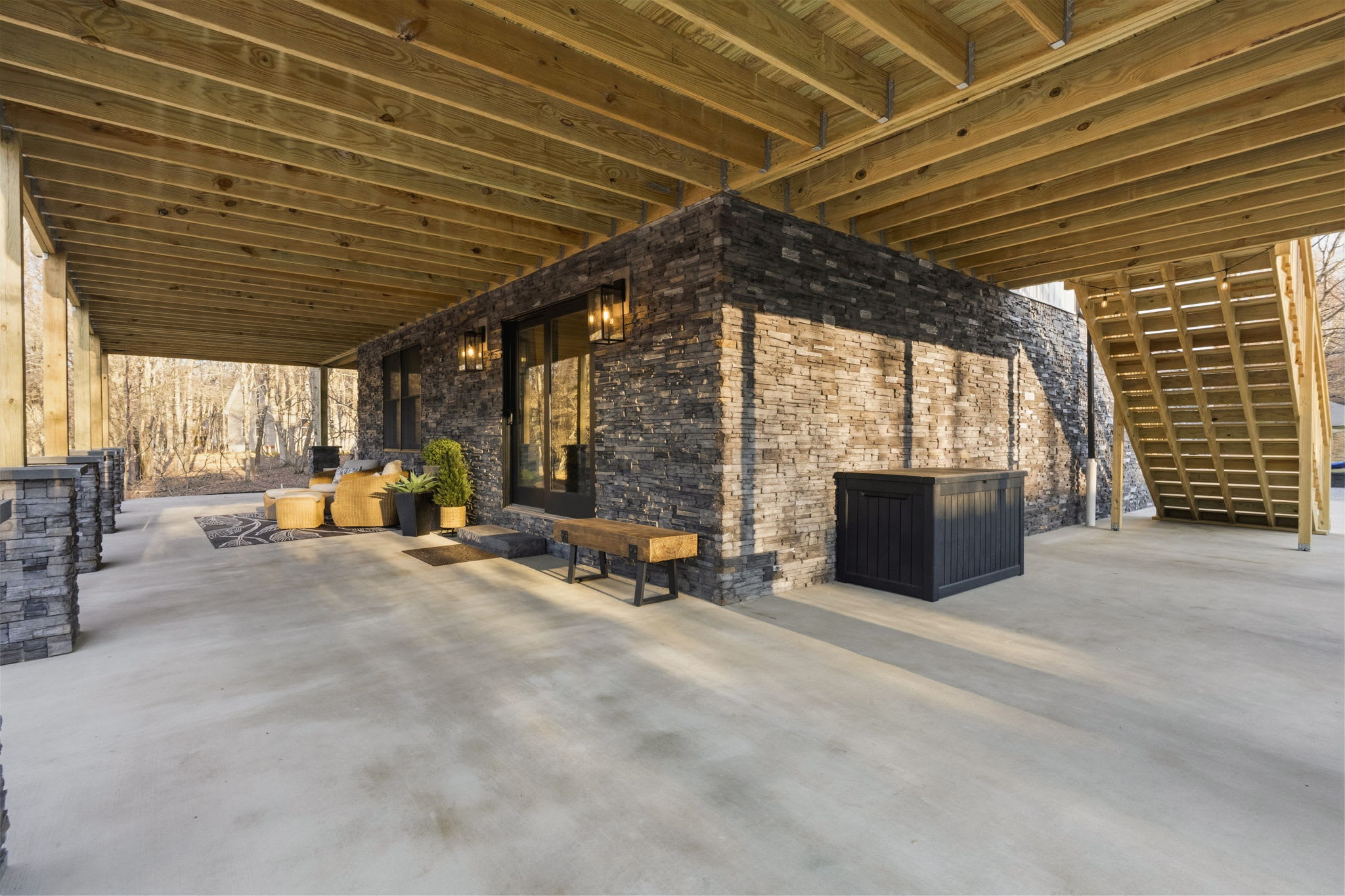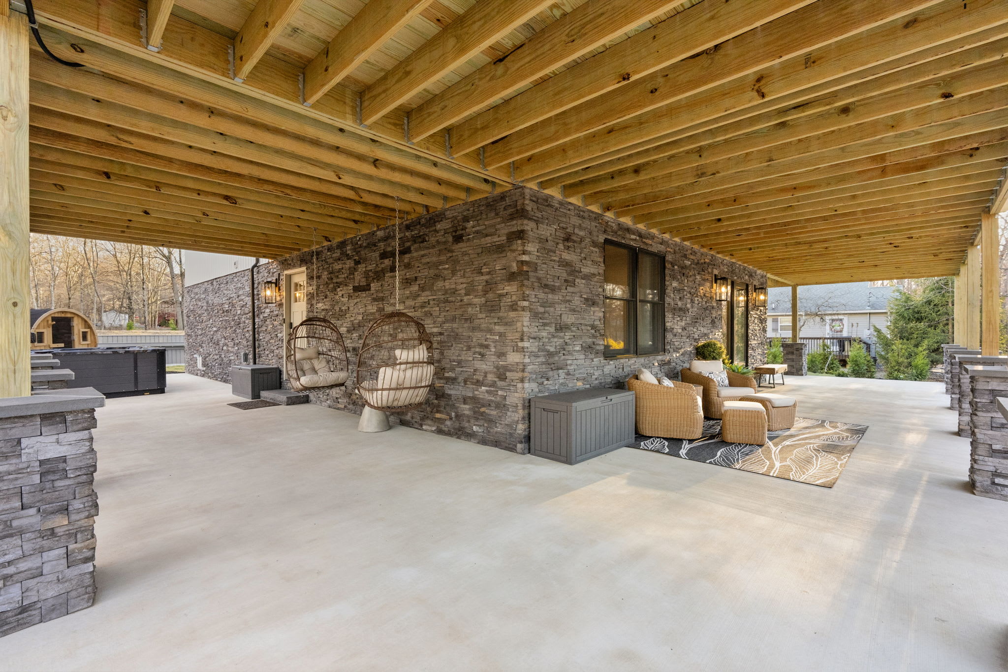 ▪️🪑 Ground-Level Patio — Stone-column covered patio beneath the deck with additional seating areas