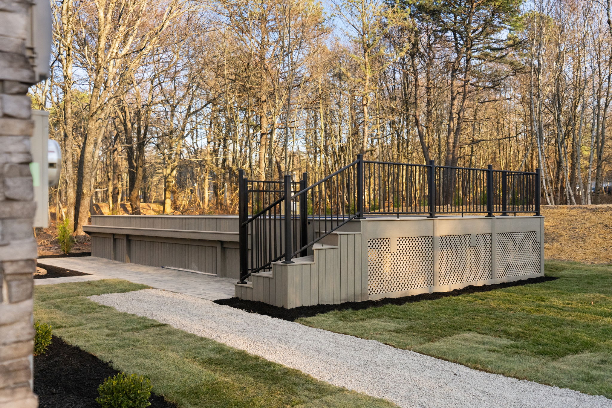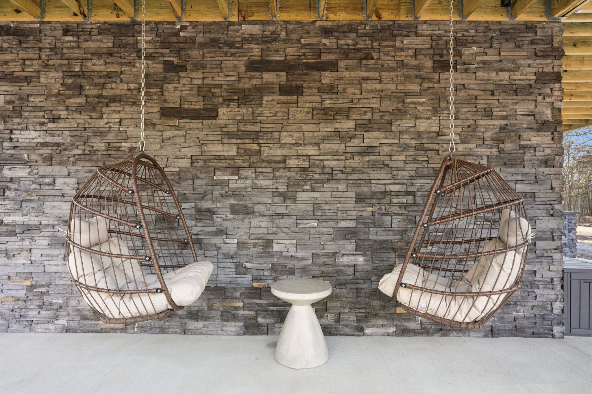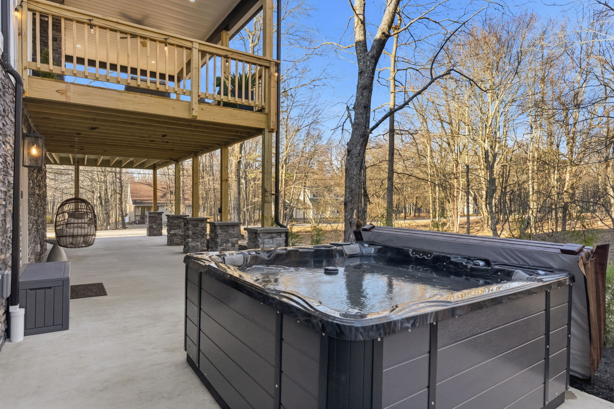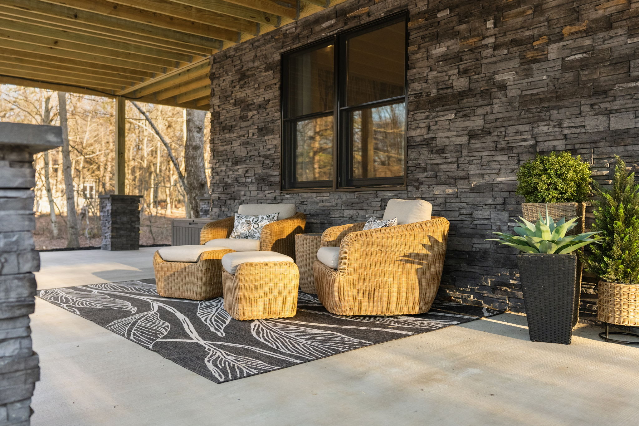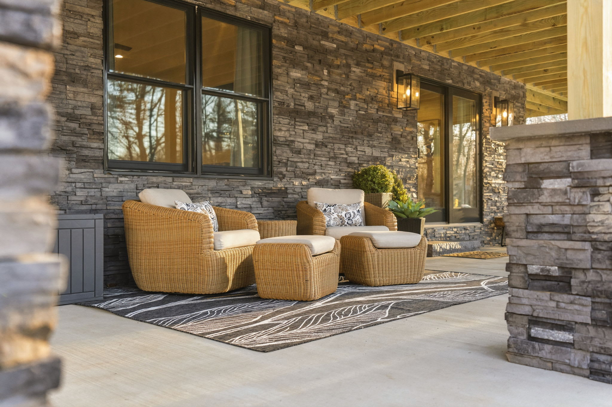 ▪️🪑 Ground-Level Patio — Stone-column covered patio beneath the deck with additional seating areas